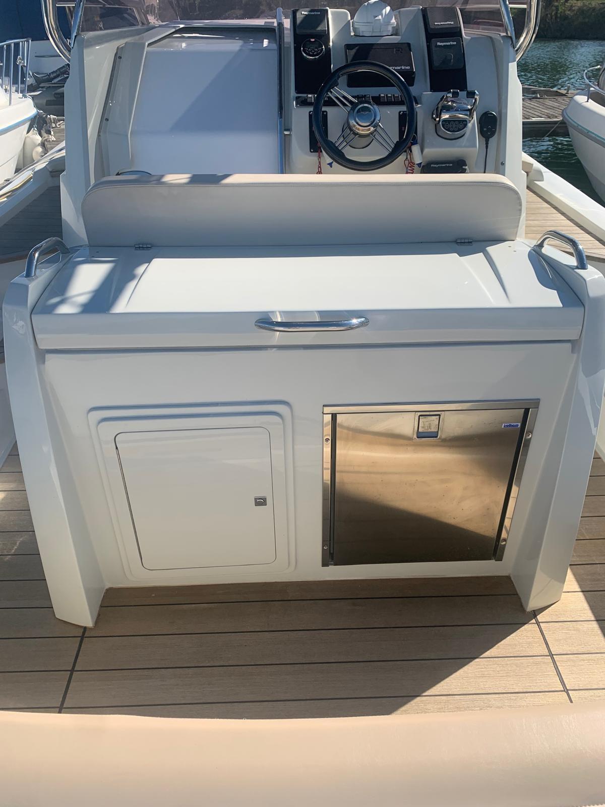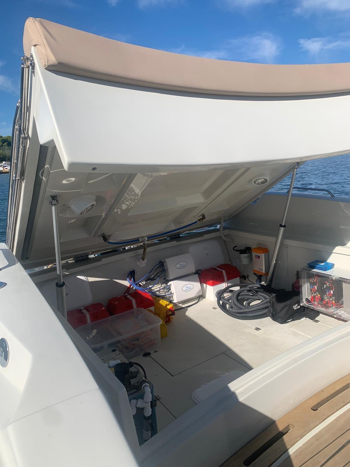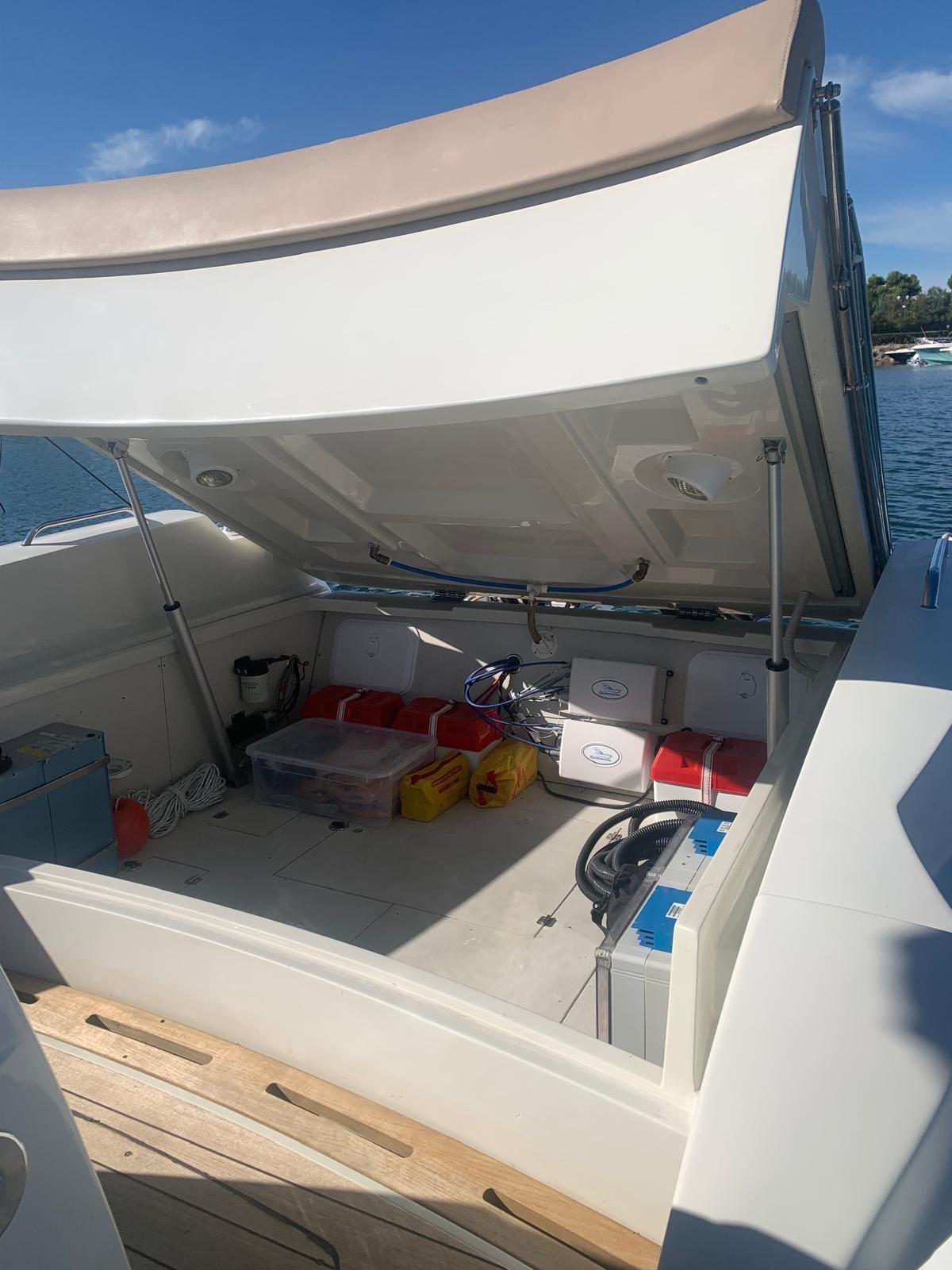 Allarme motore, Autoclave, Camminamenti laterali in teak, Doccia esterna (calda e fredda), Piattaforma, Pompa di sentina automatica, Pompa di sentina manuale, Ponte in teak, Pozzetto Teak, Presa 220V banchina, Salpa Ancore Elettrico, Scaletta da bagno, Tavolo pozzetto.