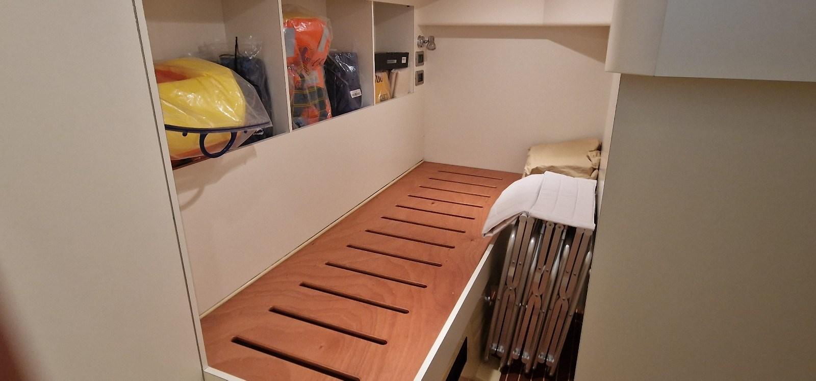 Allarme motore, Allarme sentina, Autoclave, Camminamenti laterali in teak, Doccia esterna, Flap idraulici, Impianto antincendio, Lavandino nel Pozzetto, Luci di cortesia, Passerella, Piattaforma, Porta ingresso, Pozzetto Teak, Presa 220V banchina, Salpa Ancore Elettrico, Scaletta da bagno, Tender, Tromba, Winch tonneggio di poppa.