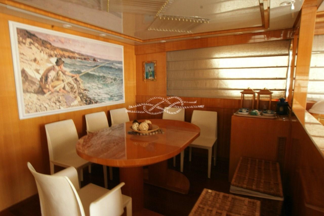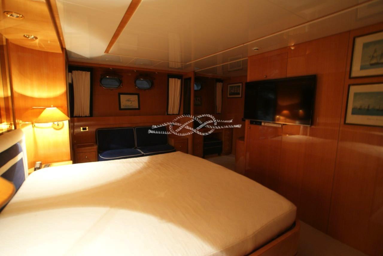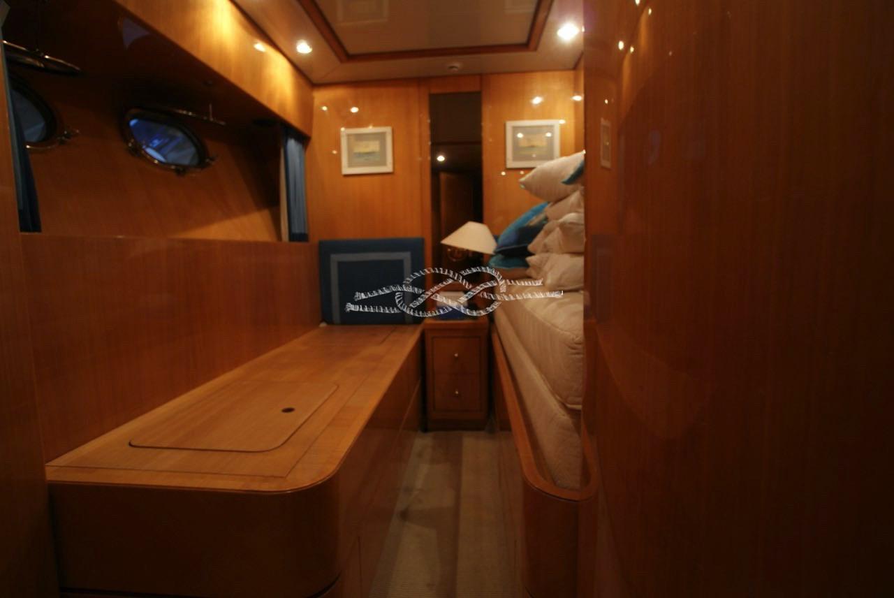 Cabina armatoriale con letto matrimoniale, cabina armadio, bagno con doccia separata - cabina Vip a centro barca con letto matrimoniale e bagno - cabina ospiti a prua con due letti in piano e terzo letto a scomparsa, bagno - cabina ospiti con due letti in piano e terzo letto a scomparsa, bagno - alloggio equipaggio con due cabine per tre e servizi.