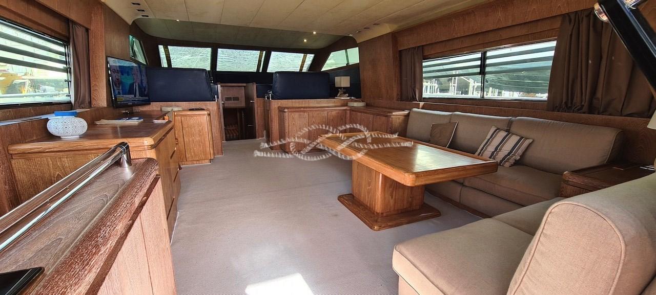 Allarme motore, Allarme sentina, Autoclave, Camminamenti laterali in teak, Doccia esterna, Doppia timoneria, Flap idraulici, Indicatori Flaps, Lavaggio catena, Passerella, Piattaforma, Porta ingresso, Presa 220V banchina, Presa acqua banchina, Salpa Ancore Elettrico, Scaletta da bagno, Tavolo pozzetto, Tender, Tromba, Winch tonneggio di poppa.