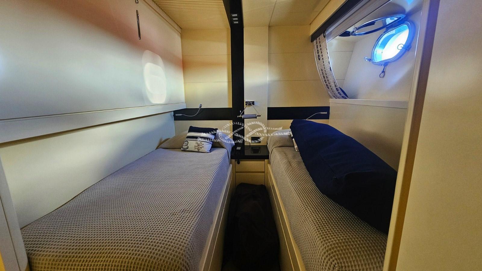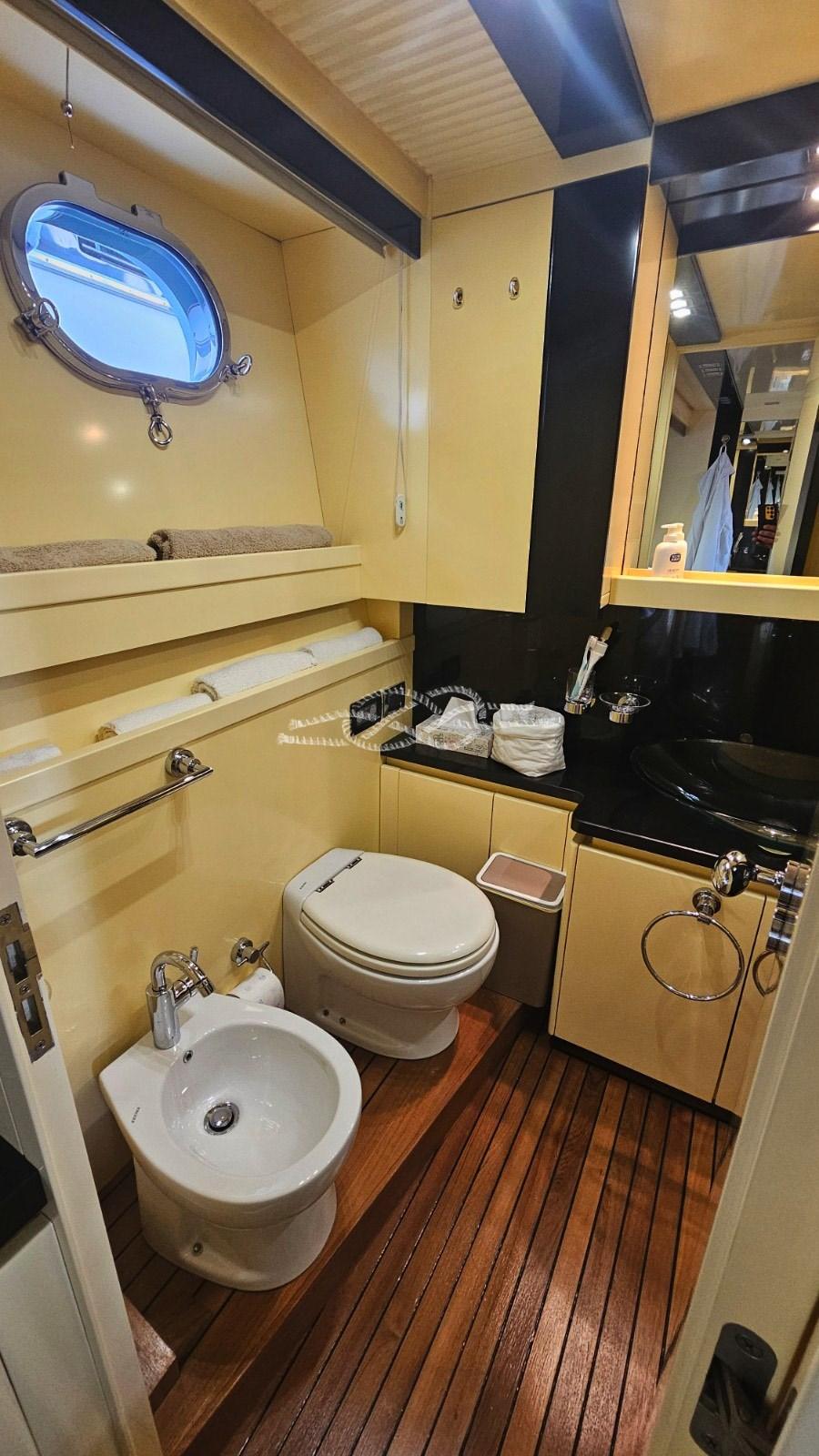 Cabina armatoriale con letto matrimoniale, cabina armadio, bagno con doccia separata e bidet - cabina Vip con due letti in piano, cabina armadio, bagno con doccia separata e bidet - cabina ospiti con due letti in piano e terzo letto a scomparsa, bagno con doccia separata e bidet (il bagno ha doppio accesso così da assolvere anche a bagno ospiti) - cabina ospiti con due letti in piano e terzo letto a scomparsa, bagno con doccia separata e bidet.