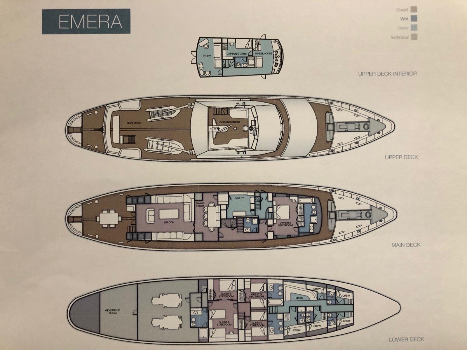 Lavori 2019: nuovo certificato R.I.Na. - nuovi motori Baudoin 2 x 1.300 Hp (12M33.2) - rifacimento completo della sala macchine con sabbiatura, nuove tubazioni, prese a mare - nuove casse acque grigie - nuove casse acque - manutenzione sistema Hamman - manutenzione sistema Alfa Laval - manutenzione completa e miglioramento sistema toilets - nuove autoclavi - nuovo sistema Wi-Fi.