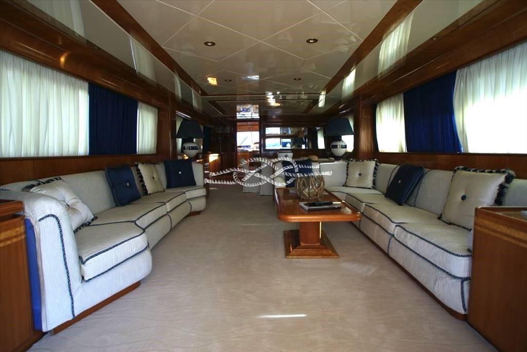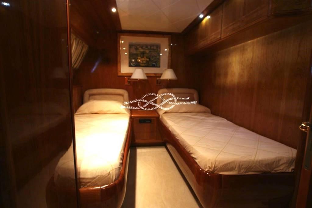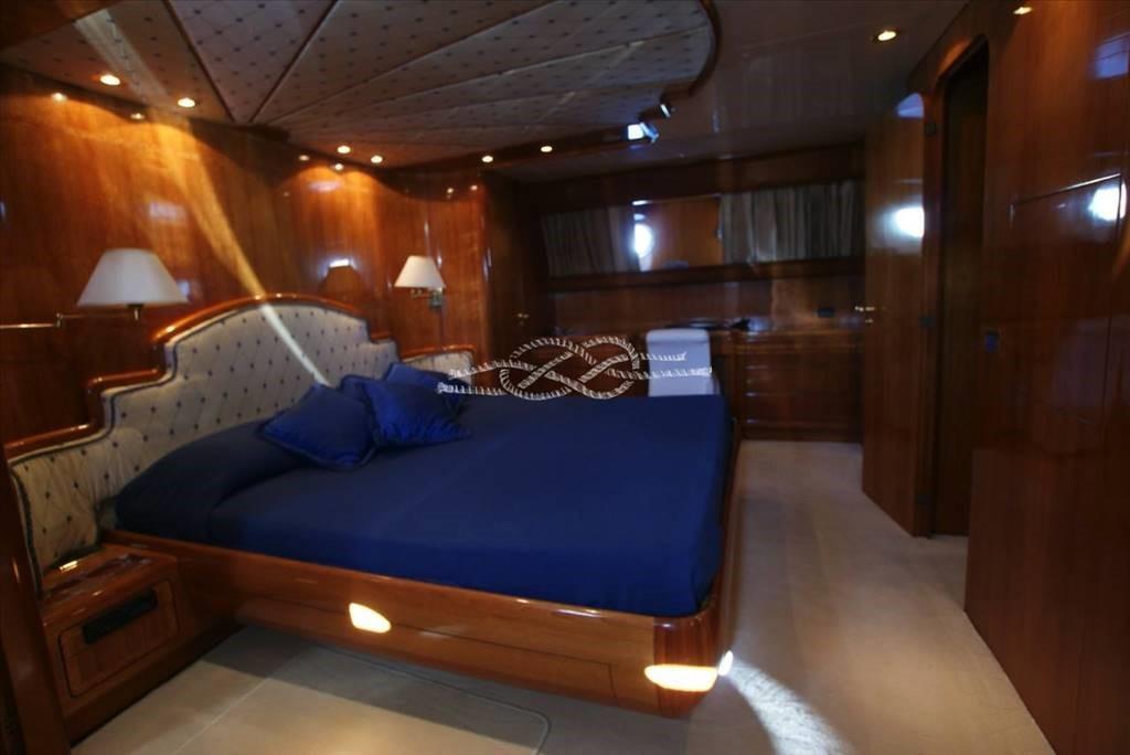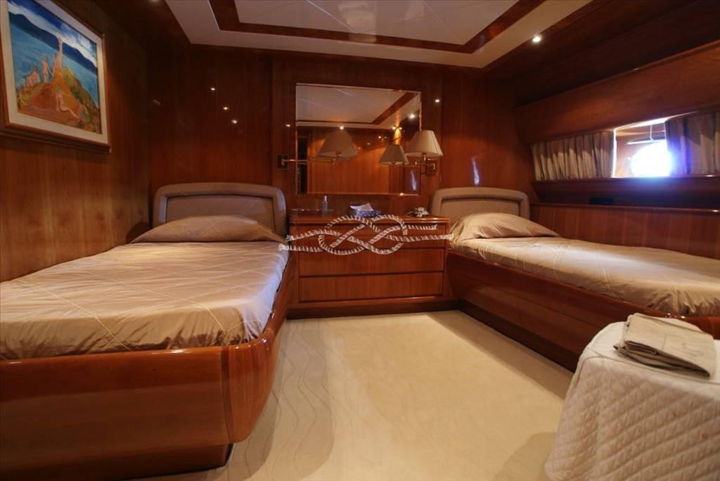 Cabina armatoriale con letto matrimoniale, cabina armadio e bagno - cabina Vip con due letti e bagno - cabina ospiti con due letti e bagno - cabina ospiti con due letti e bagno - equipaggio: cabina doppia con bagno a prua, cabina singola con bagno a poppa. Tutti i bagni hanno docce separate.