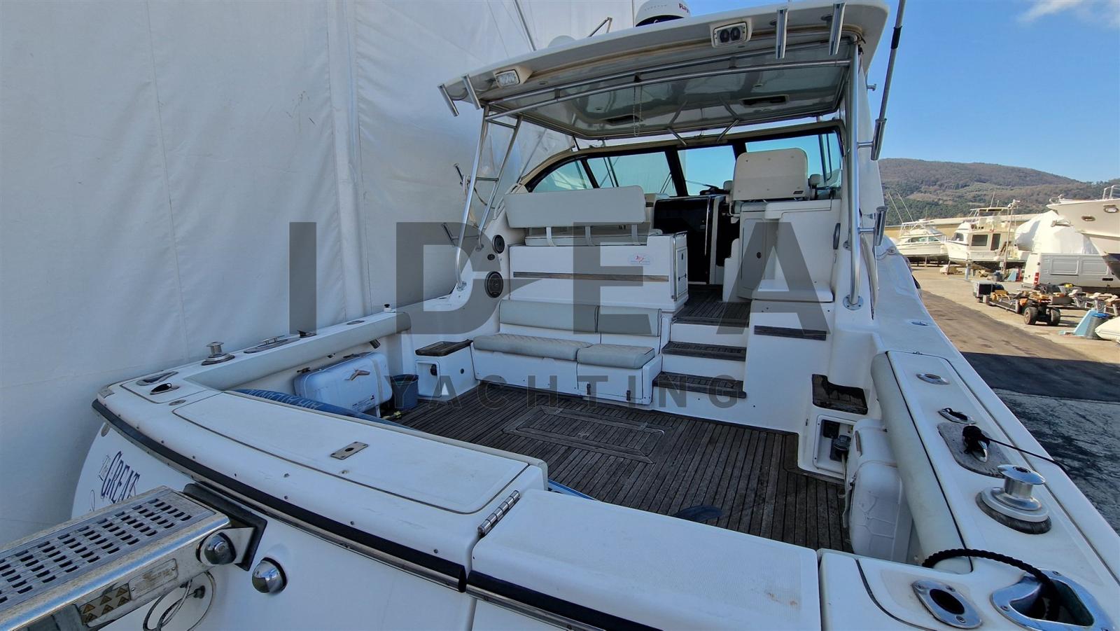 The exterior of the Tiara 4200 Open features a striking profile characterized by its sporty silhouette and a spacious cockpit area. The large, open deck is designed for fishing or entertaining, with ample space for rods, tackle and gear. The helm station is ergonomically designed, offering excellent visibility and easy access to controls, making it a breeze to manoeuvre in various conditions. The boat is equipped with high-quality stainless steel fittings and durable materials that enhance its seaworthiness and aesthetic appeal.