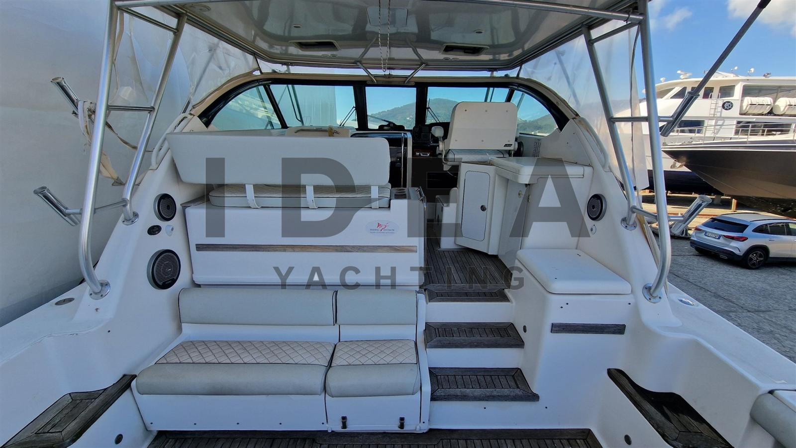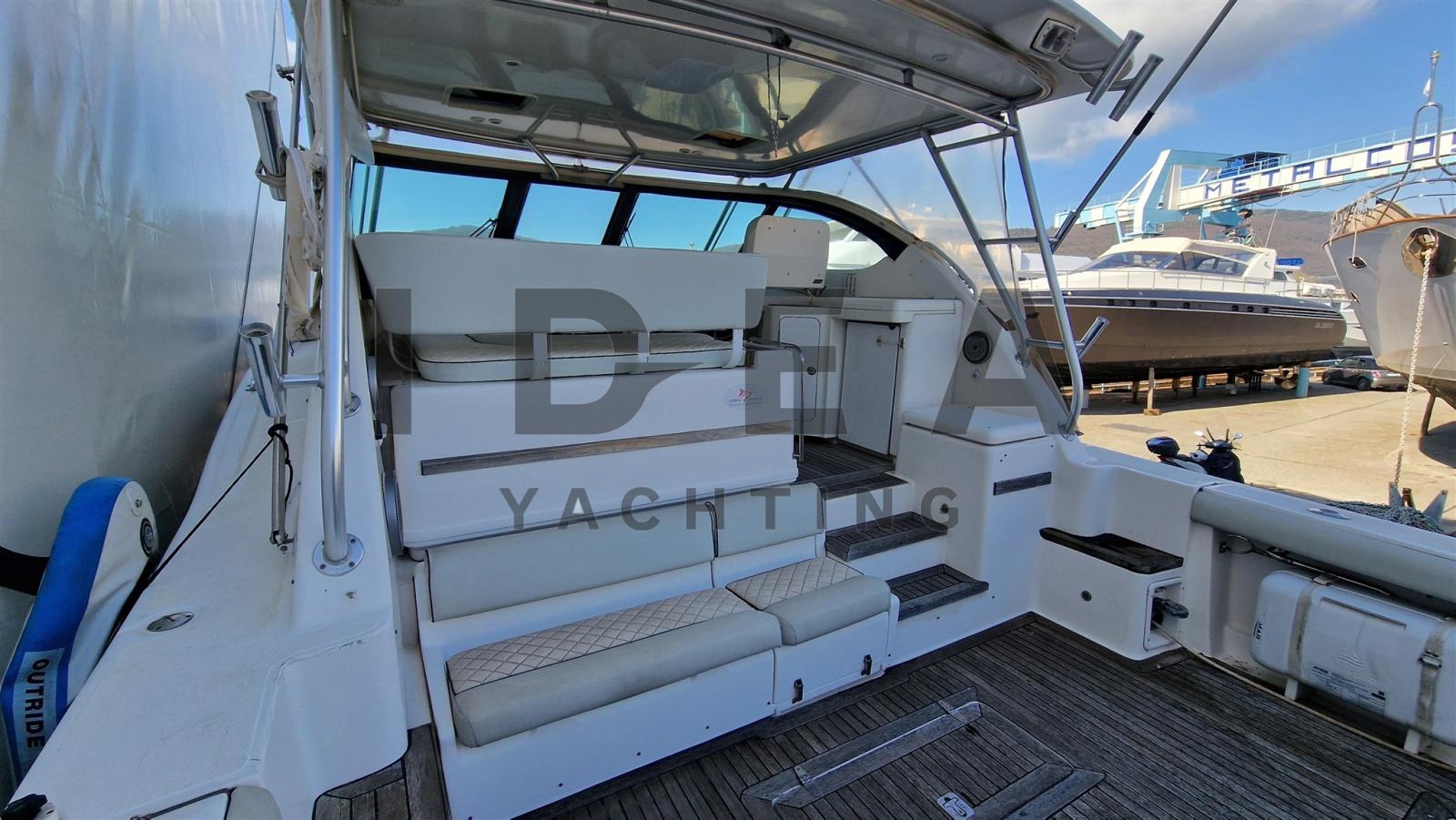 Allarme fumo/gas, Allarme motore, Allarme sentina, 3 Autoclave (1 sea water deck pump, 2 fresh water pump), Bitte Abbattibili, 2 Caricabatterie (1 Quick 80A, 1 Charles 30A), Doccia esterna, 2 Fari fissi a poppa, Flap elettrici, Impianto antincendio, Lavandino nel Pozzetto, Luci di cortesia, Passerella (Opacmare Hydraulic), Piattaforma, Pompa di sentina automatica, Pozzetto Teak, Presa 220V banchina, Salpa Ancore Elettrico, Scaletta da bagno, Tavolo pozzetto (in teak), Tavolo Salone Abbattibile, Tromba, T-Top, 2 Winch tonneggio di poppa.