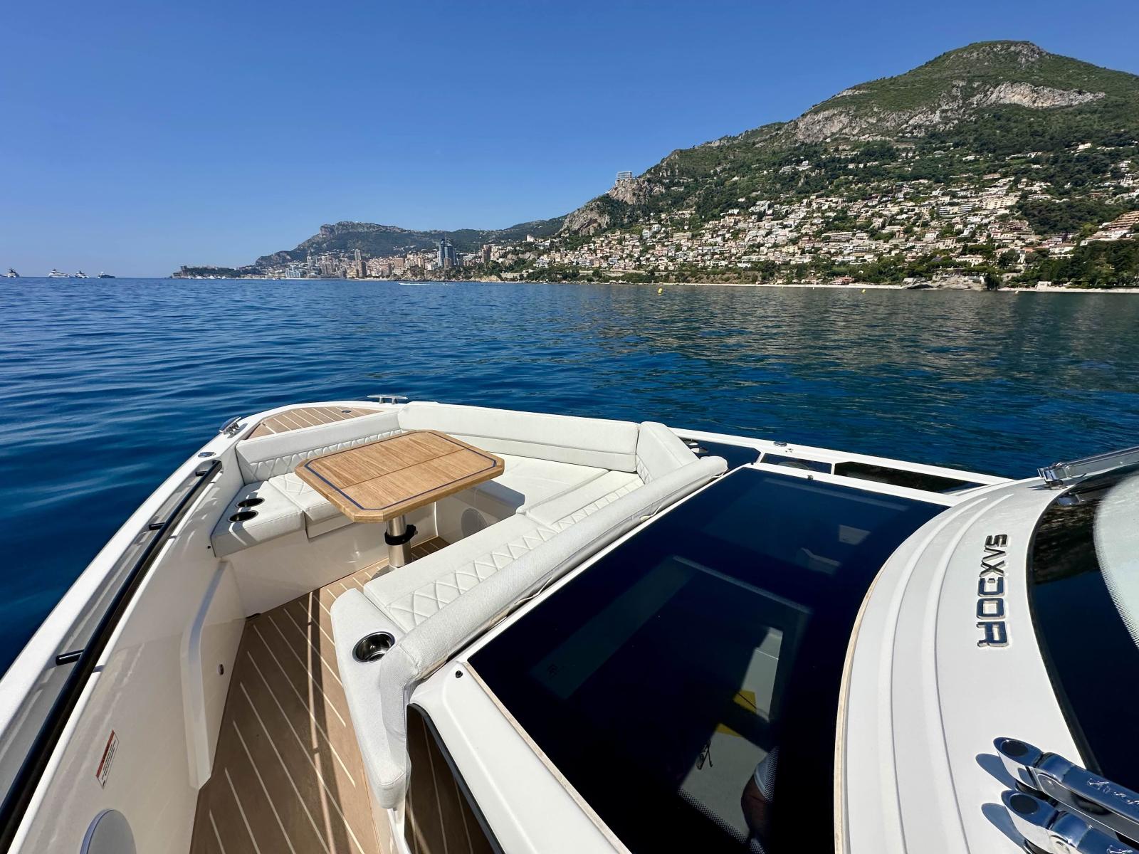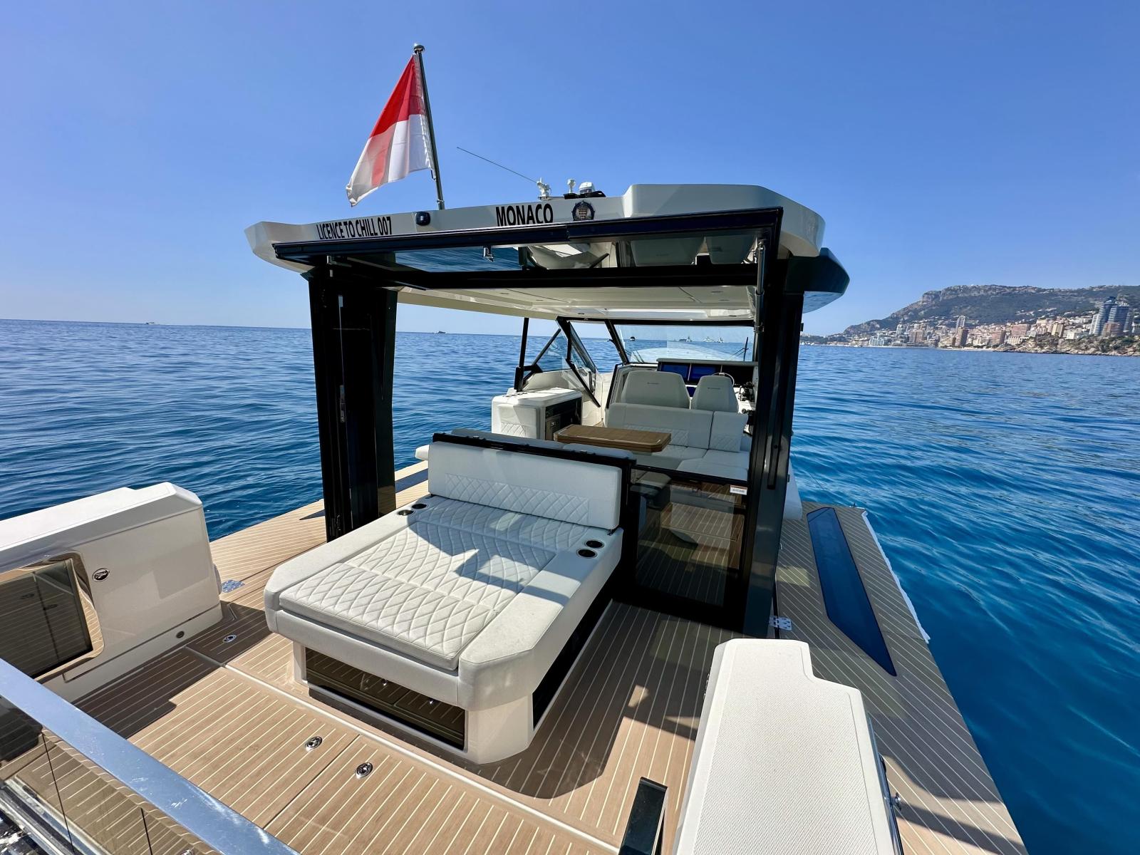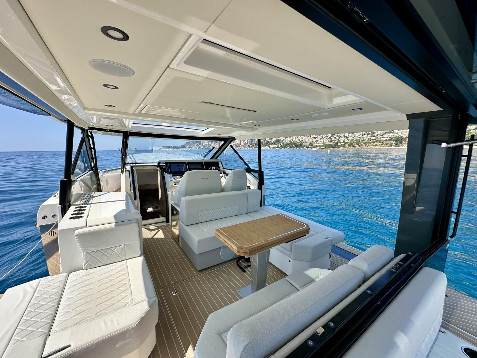 L’area esterna offre due balconi laterali apribili, tetto rigido apribile elettricamente, porta posteriore in vetro e rivestimento in Flexiteek. Il pozzetto è spazioso e modulare, con panche convertibili in prendisole, tavolo a scomparsa e zona lounge a prua per sei persone.