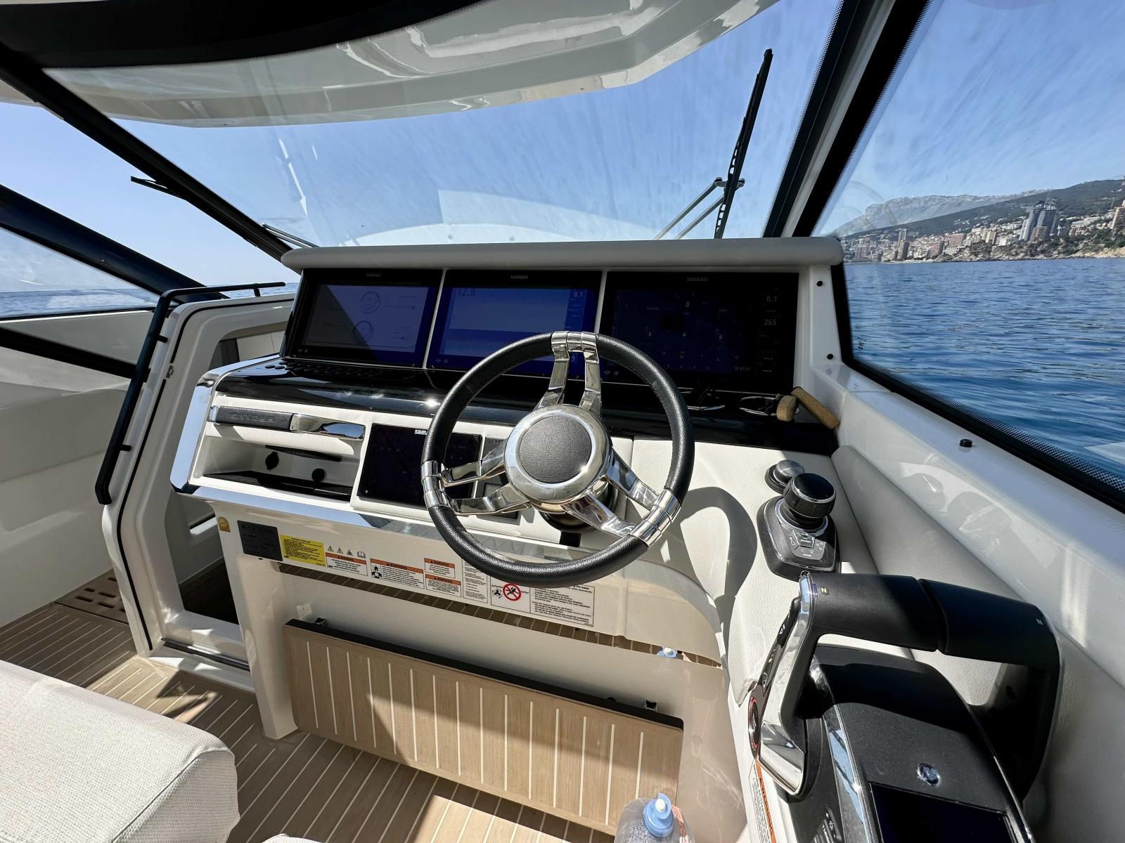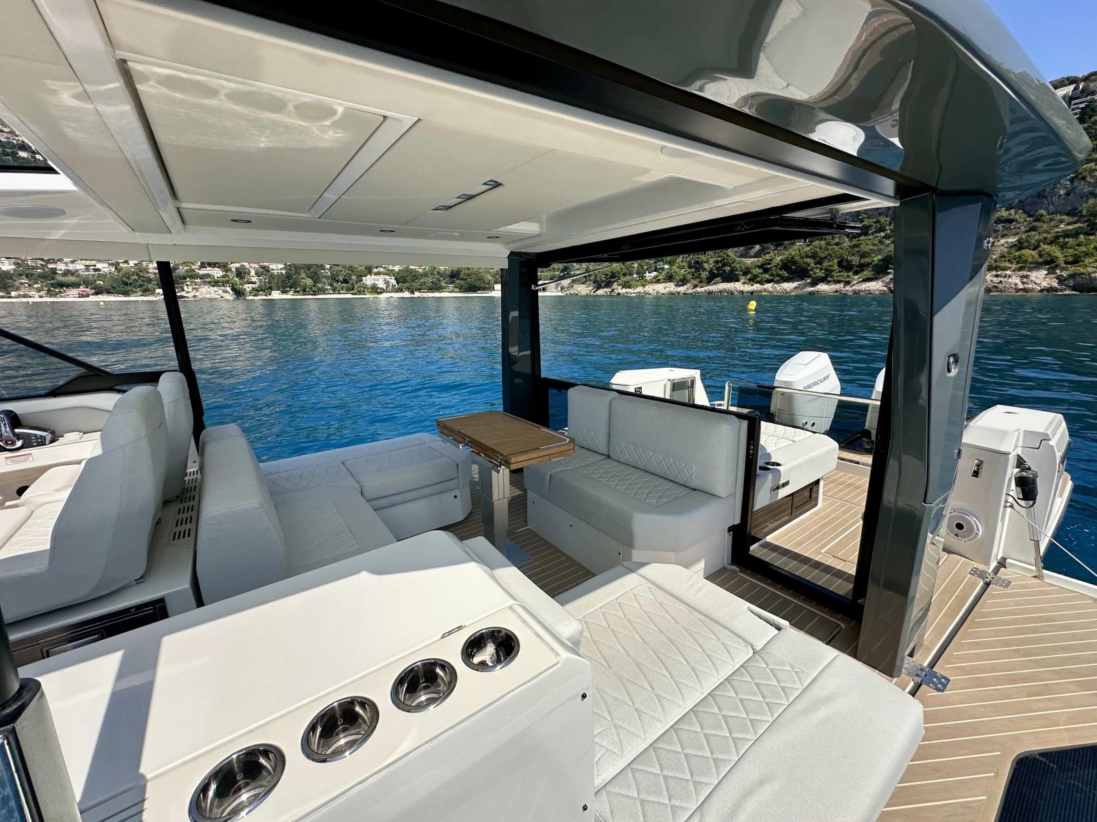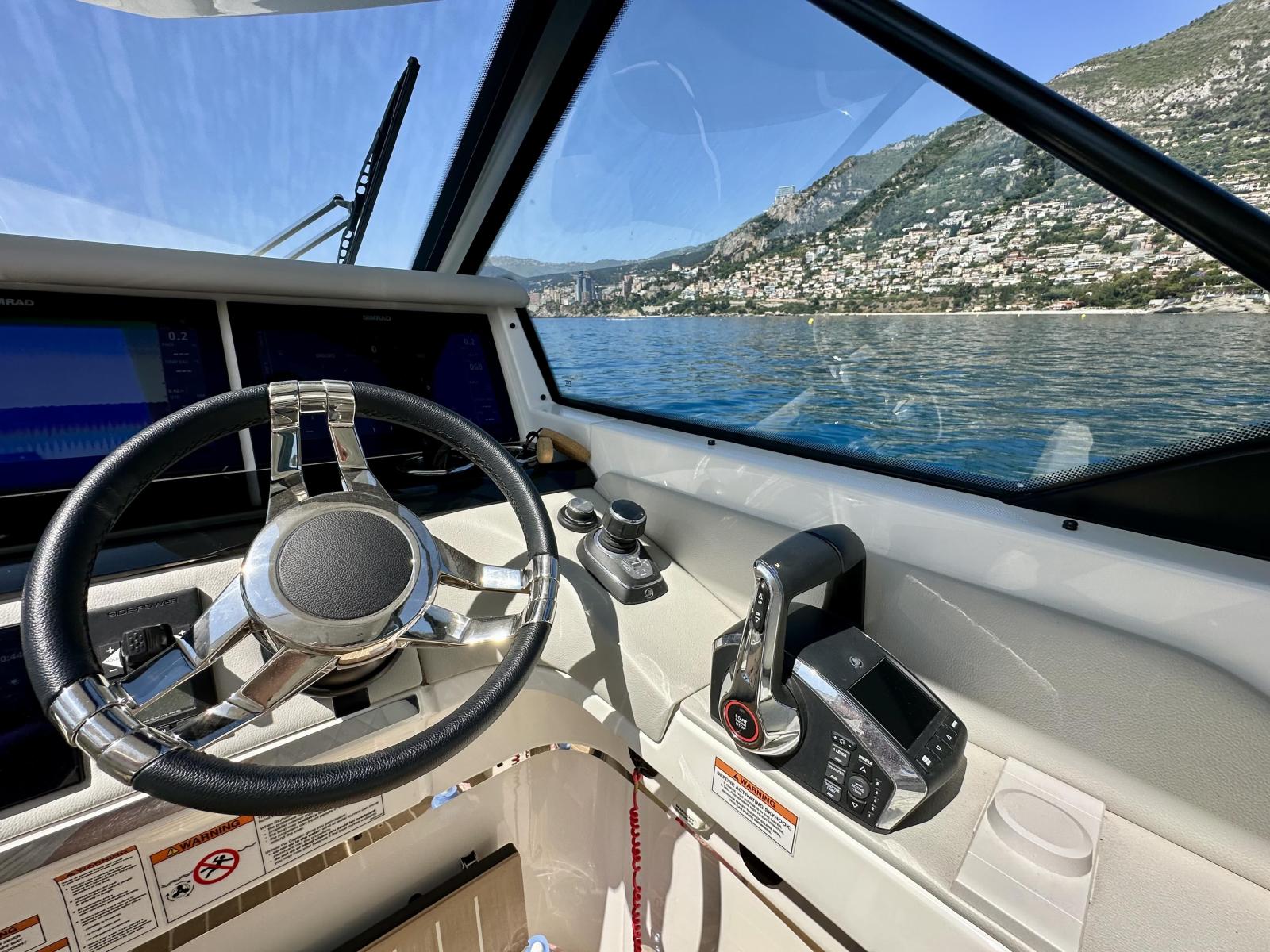La motorizzazione è ottimizzata con joystick di manovra, elica di prua e pacchetto tecnologico completo Mercury, offrendo un'esperienza di guida fluida, precisa e piacevole. La postazione di comando è dotata di tre schermi Simrad e radar di ultima generazione, integrati nel pacchetto di navigazione avanzato.