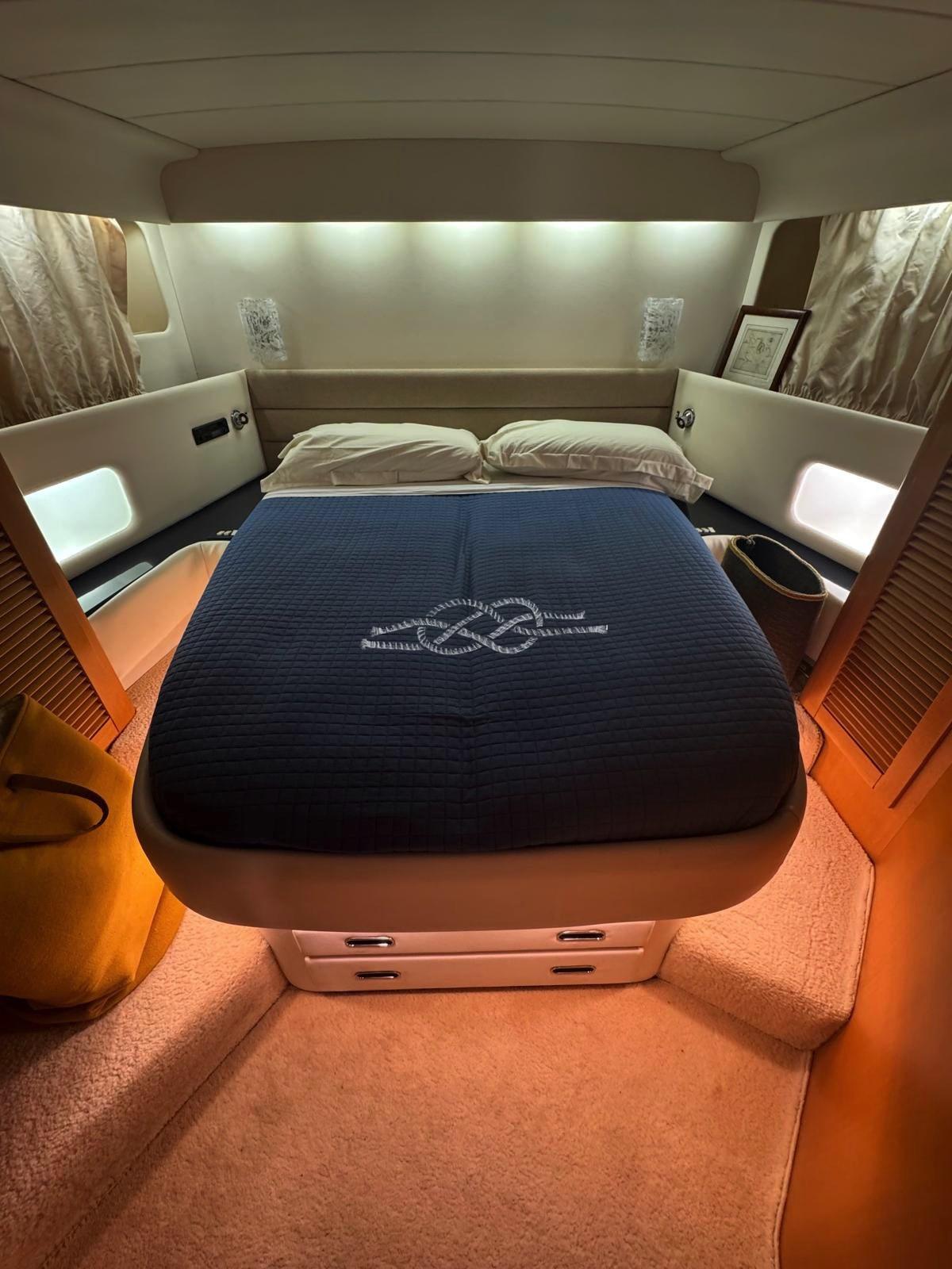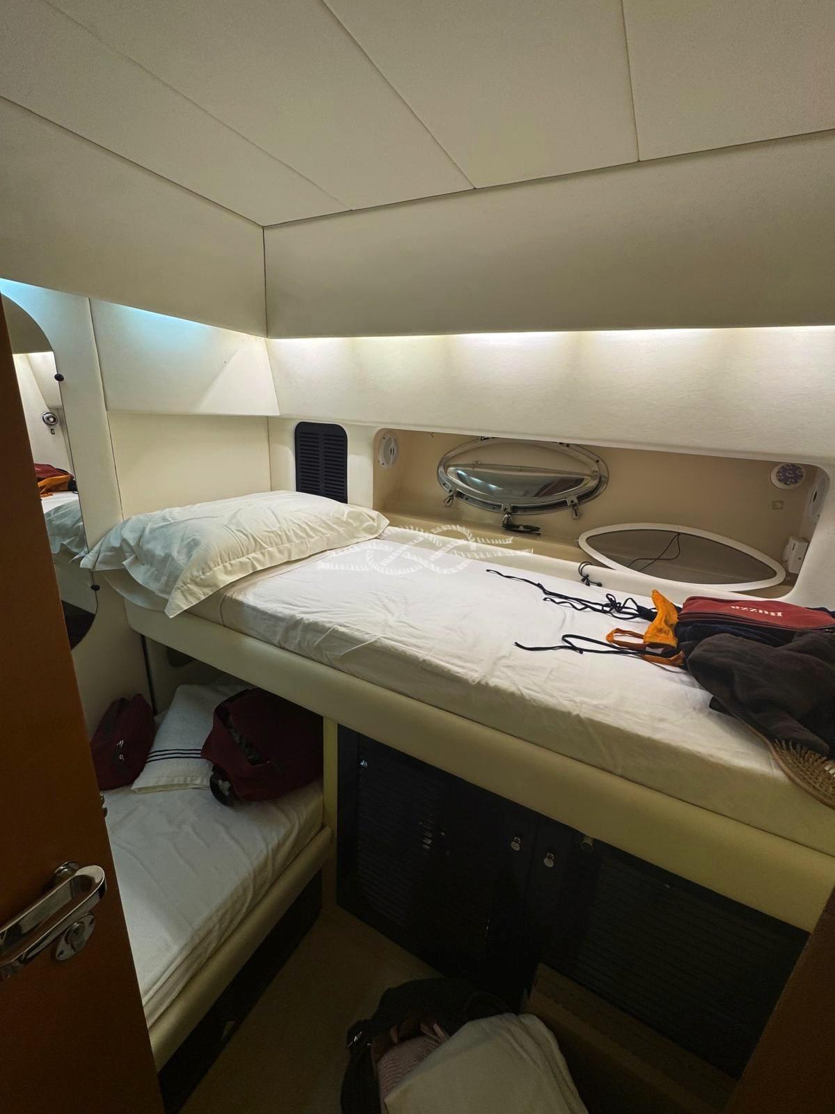 Cabina armatoriale con letto matrimoniale - cabina ospiti con due letti a castello - bagno.