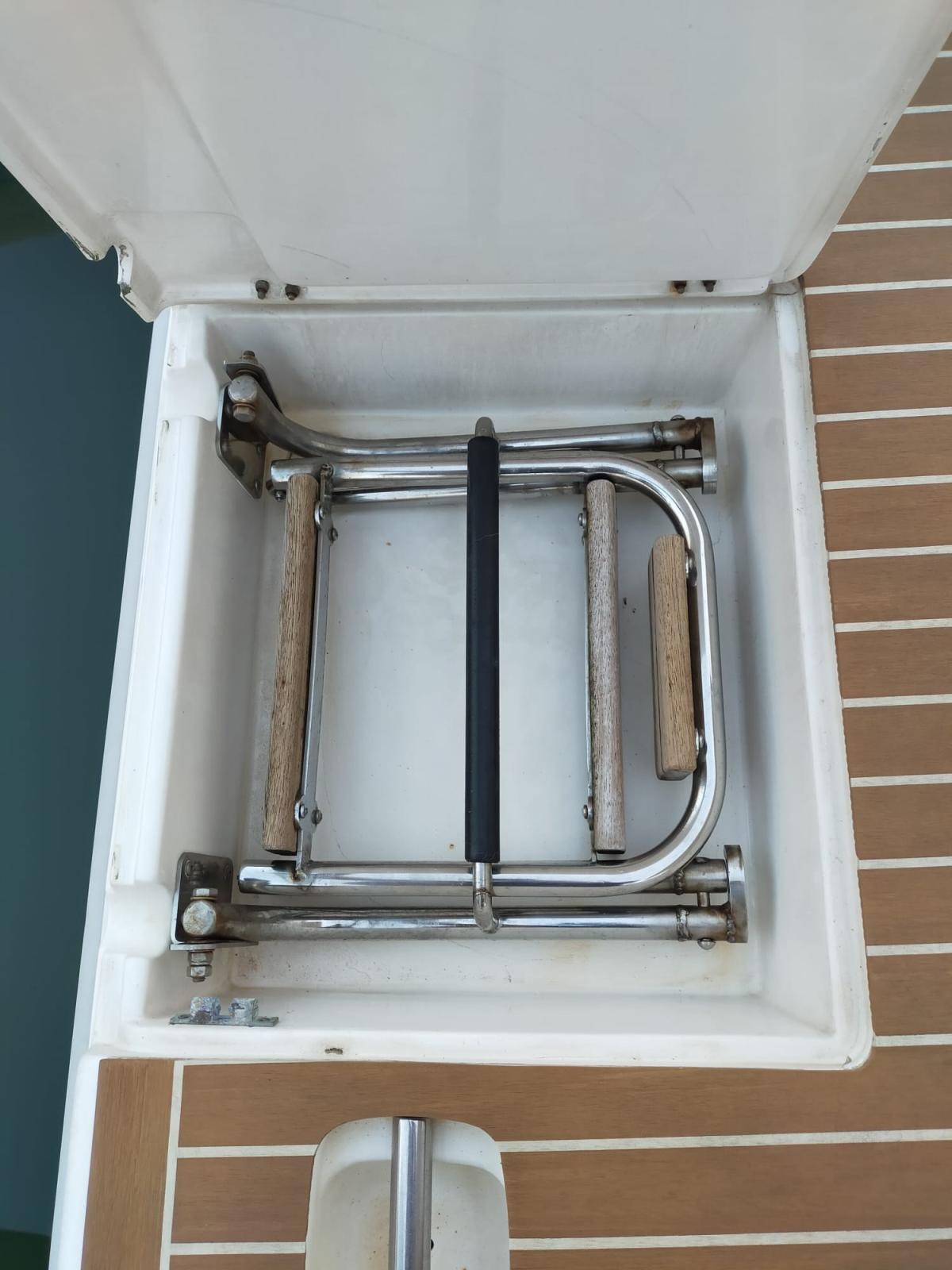 Allarme motore, 2 Batterie (180ah), Caricabatterie (nuovo 2023), Doccia esterna, Flap idraulici, Indicatori Flaps, Luci subacquee, Pannelli Solari, Piattaforma (in teak sintetico), Pompa di sentina manuale, Porta ingresso, Presa 220V banchina, Salpa Ancore Elettrico, Scaletta da bagno, Tavolo pozzetto, Tender (2mt + fuoribordo Honda 2,3hp).