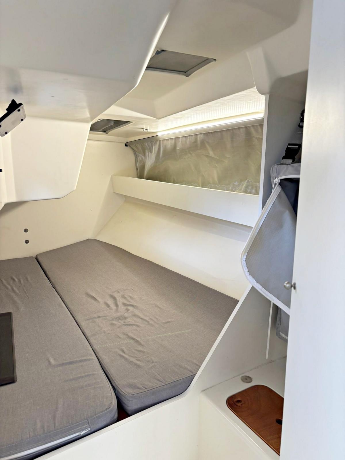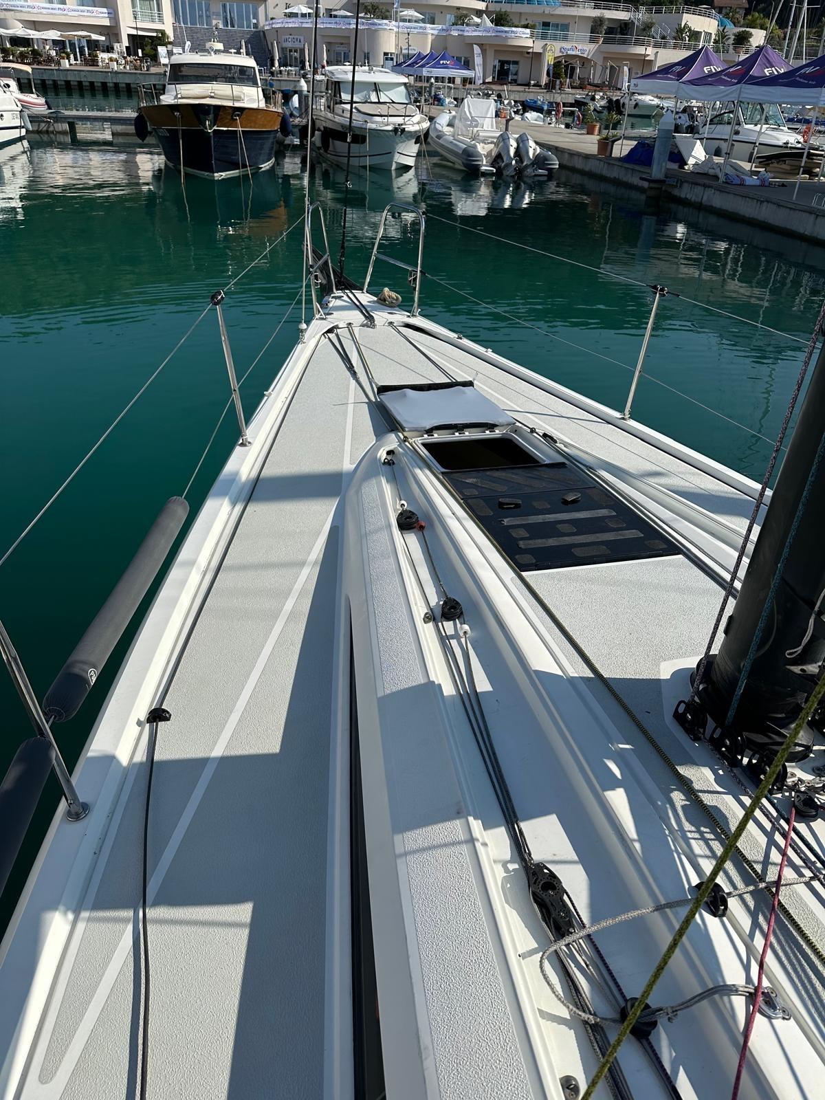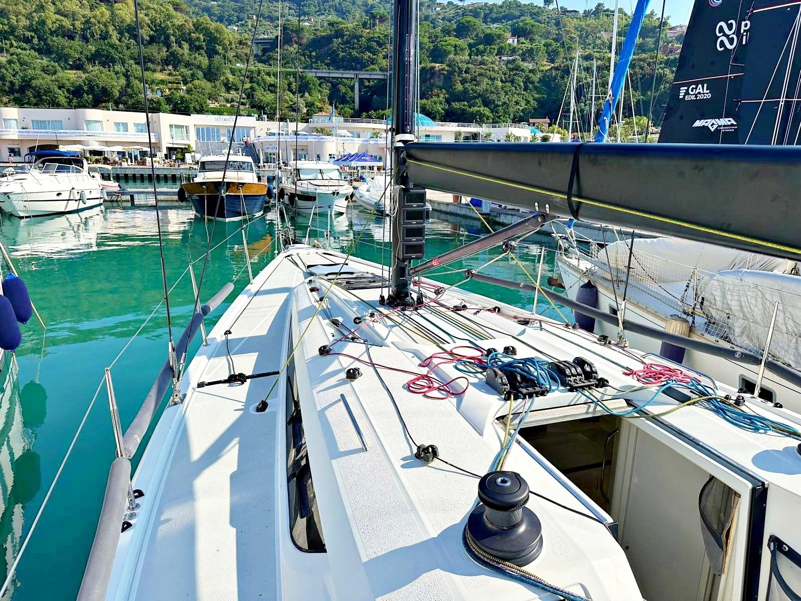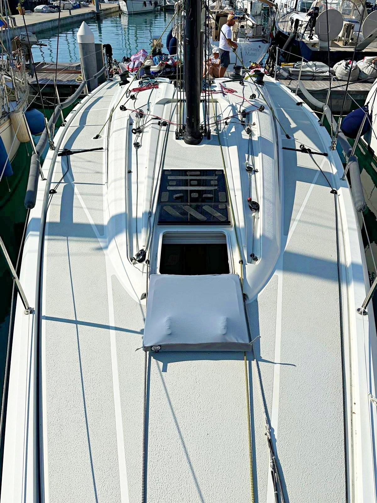 3 cabine, 2 bagni, 1 wc manuale, dinette con zona carteggio e cucina. Strumentazione completa B&G H5000 con ripetitori all'albero. Riscaldamento Webasto. Boma in carbonio, albero in carbonio, sartie nuove in carbonio EC3 Southern Spars 2025, paterazzo in tessile con magic wheel e strallo in PBO, cilindro idraulico per strallo di prua con centralina e pompa manuale in pozzetto Bamar, tuff luff nuovo 2025, tangone in carbonio, delfiniera più lunga nuova in carbonio 2025. Scotte e drizze in Dyneema® nuove 2025 Gleinstain, winch Harken Performa ad alto grip. Barra del timone in carbonio. Bulbo e pinna in piombo realizzato a controllo numerico nuovo e completamente ottimizzato 2023. Timone nuovo 2023 ed ottimizzato 2025. Alleggerimenti interni 2025: sostituzione di tutti i portelli con portelli in tela. Ri-siliconatura di tutta l’attrezzatura di coperta 2025. Dotazioni di sicurezza per regate ORC categoria 3.