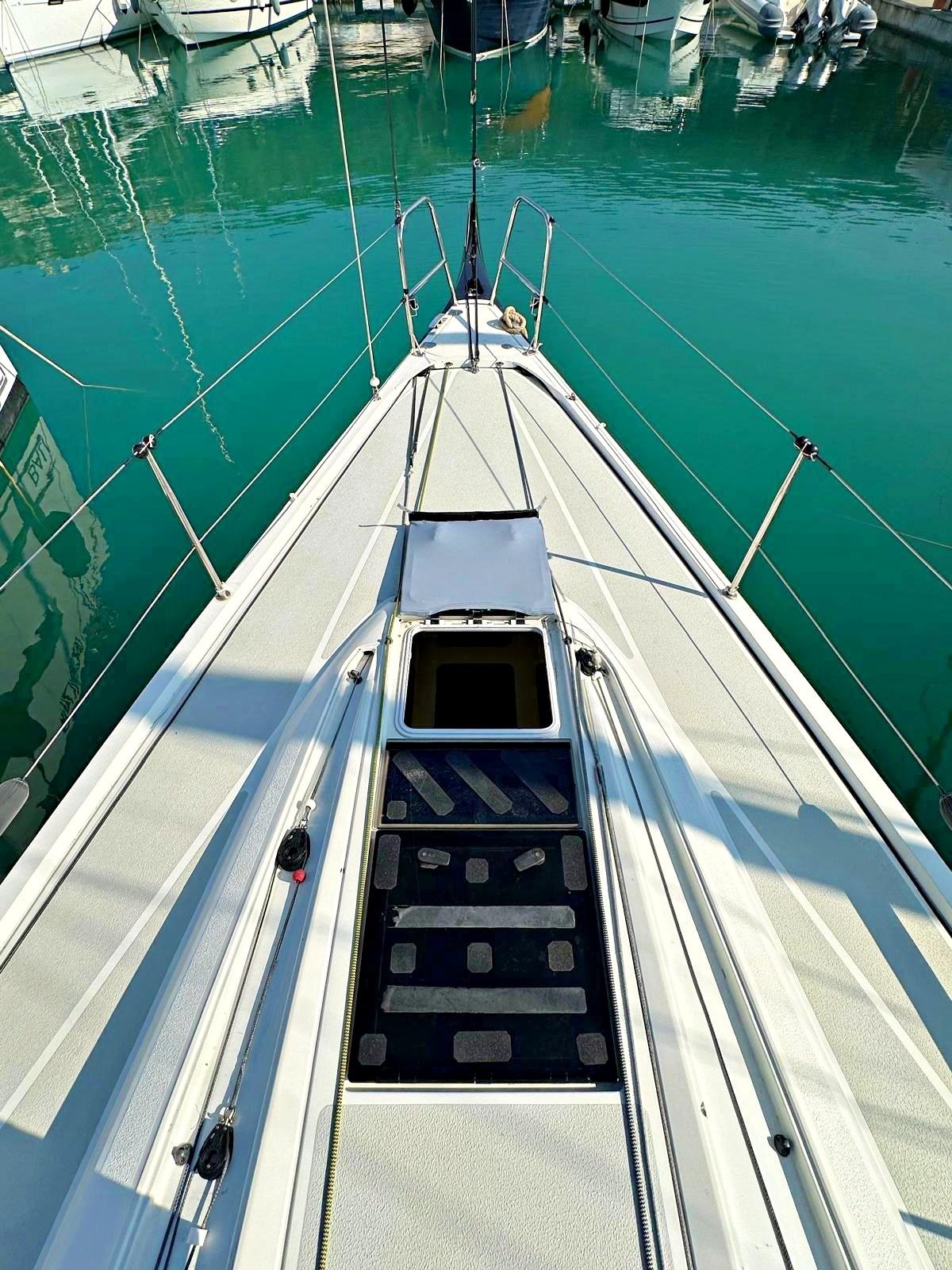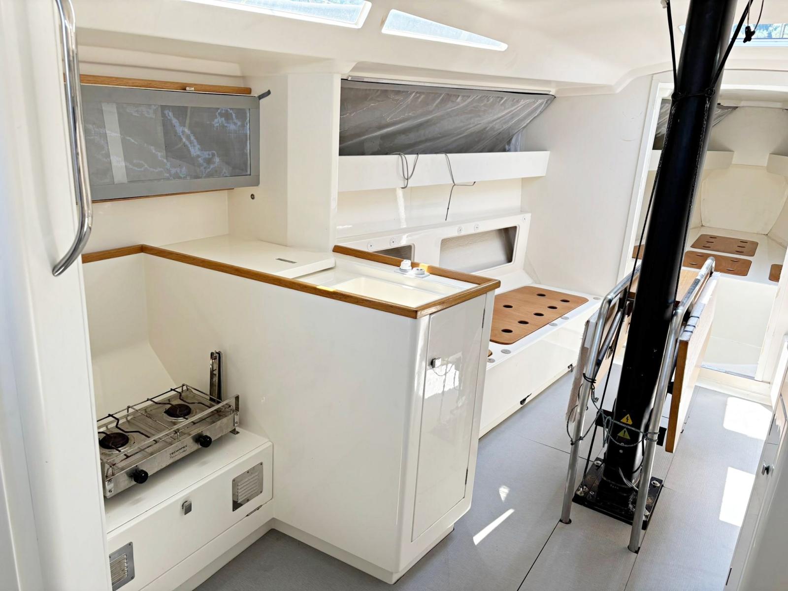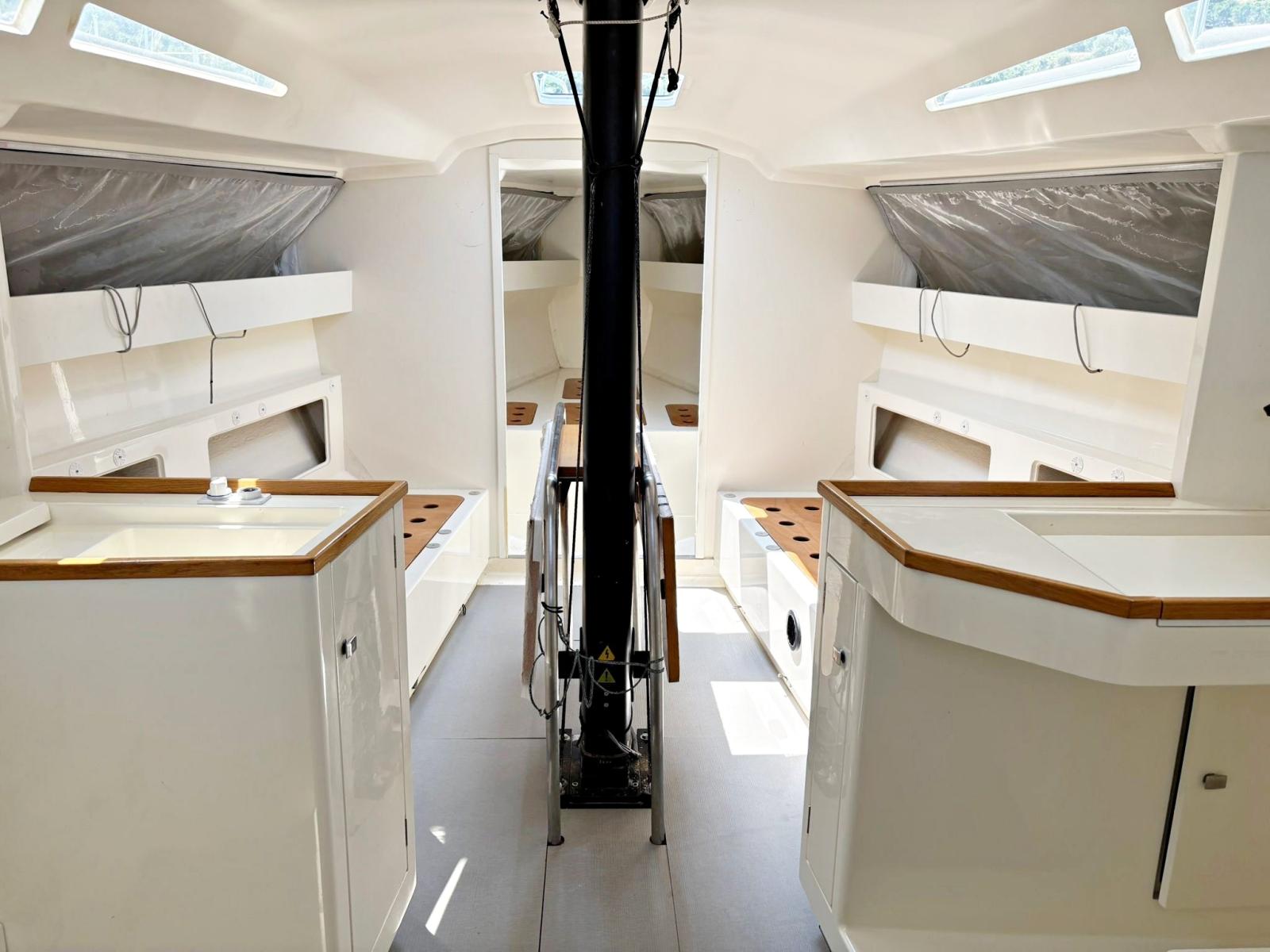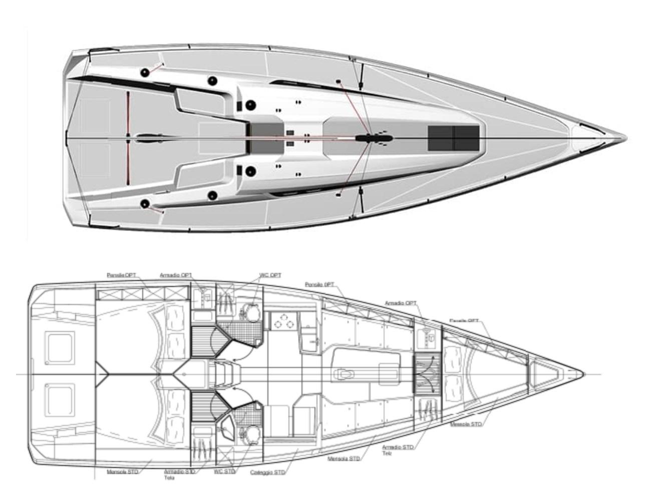 3 cabine, 2 bagni, 1 wc manuale, dinette con zona carteggio e cucina. Strumentazione completa B&G H5000 con ripetitori all'albero. Riscaldamento Webasto. Boma in carbonio, albero in carbonio, sartie nuove in carbonio EC3 Southern Spars 2025, paterazzo in tessile con magic wheel e strallo in PBO, cilindro idraulico per strallo di prua con centralina e pompa manuale in pozzetto Bamar, tuff luff nuovo 2025, tangone in carbonio, delfiniera più lunga nuova in carbonio 2025. Scotte e drizze in Dyneema® nuove 2025 Gleinstain, winch Harken Performa ad alto grip. Barra del timone in carbonio. Bulbo e pinna in piombo realizzato a controllo numerico nuovo e completamente ottimizzato 2023. Timone nuovo 2023 ed ottimizzato 2025. Alleggerimenti interni 2025: sostituzione di tutti i portelli con portelli in tela. Ri-siliconatura di tutta l’attrezzatura di coperta 2025. Dotazioni di sicurezza per regate ORC categoria 3.