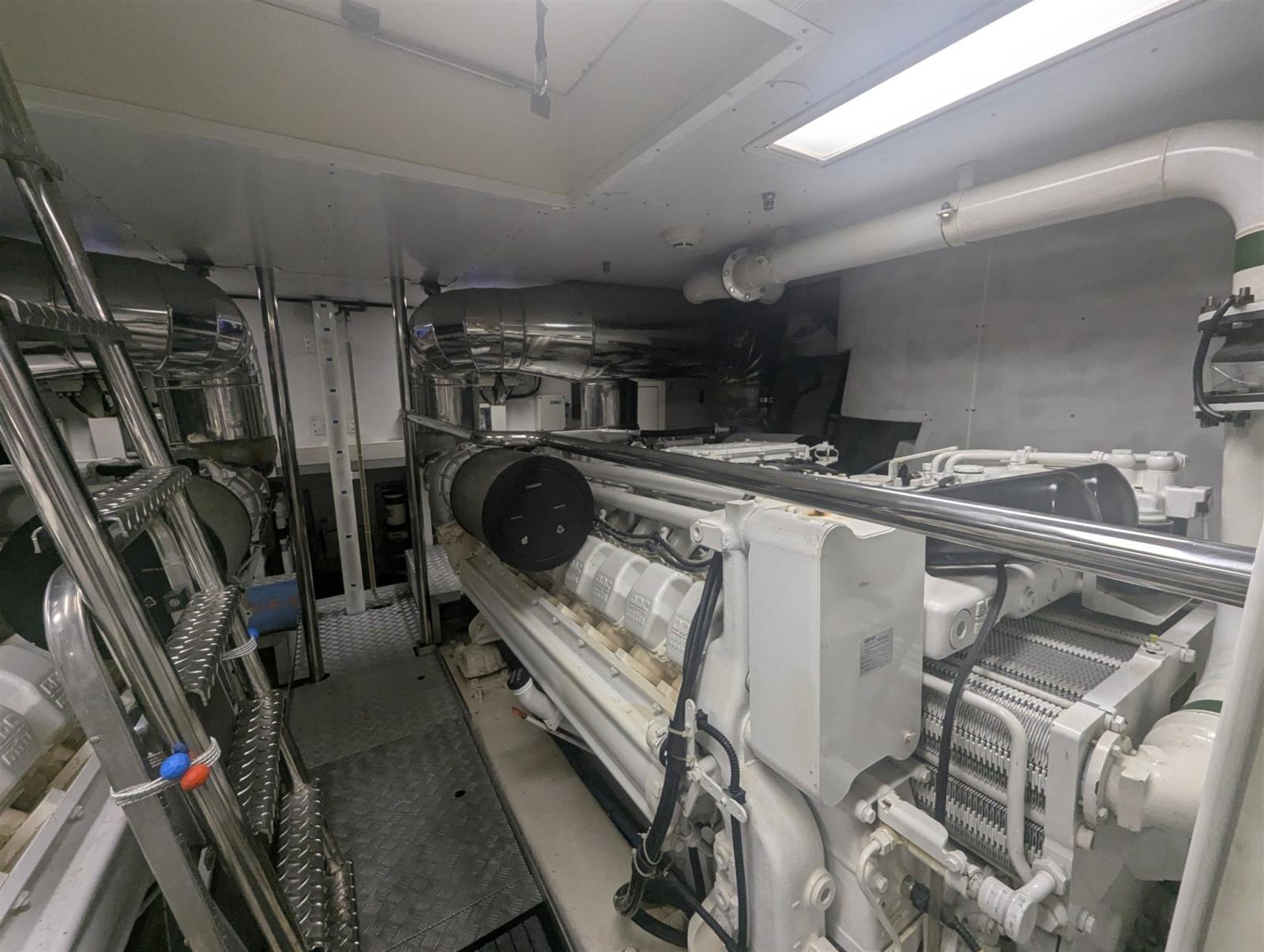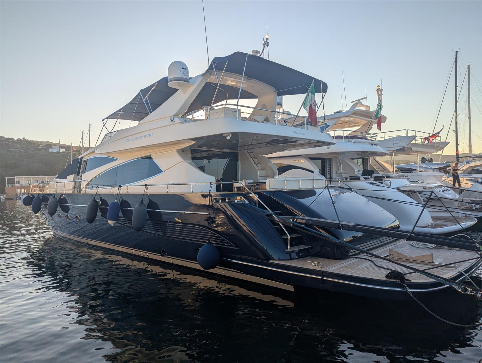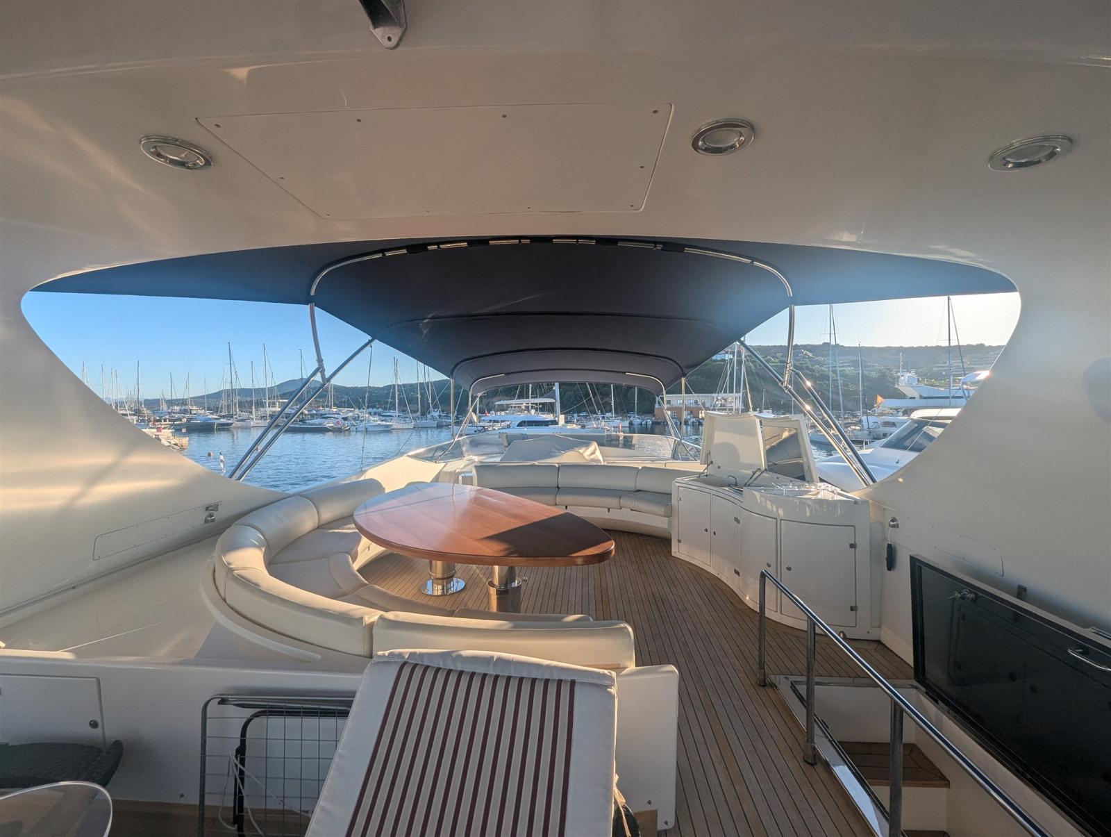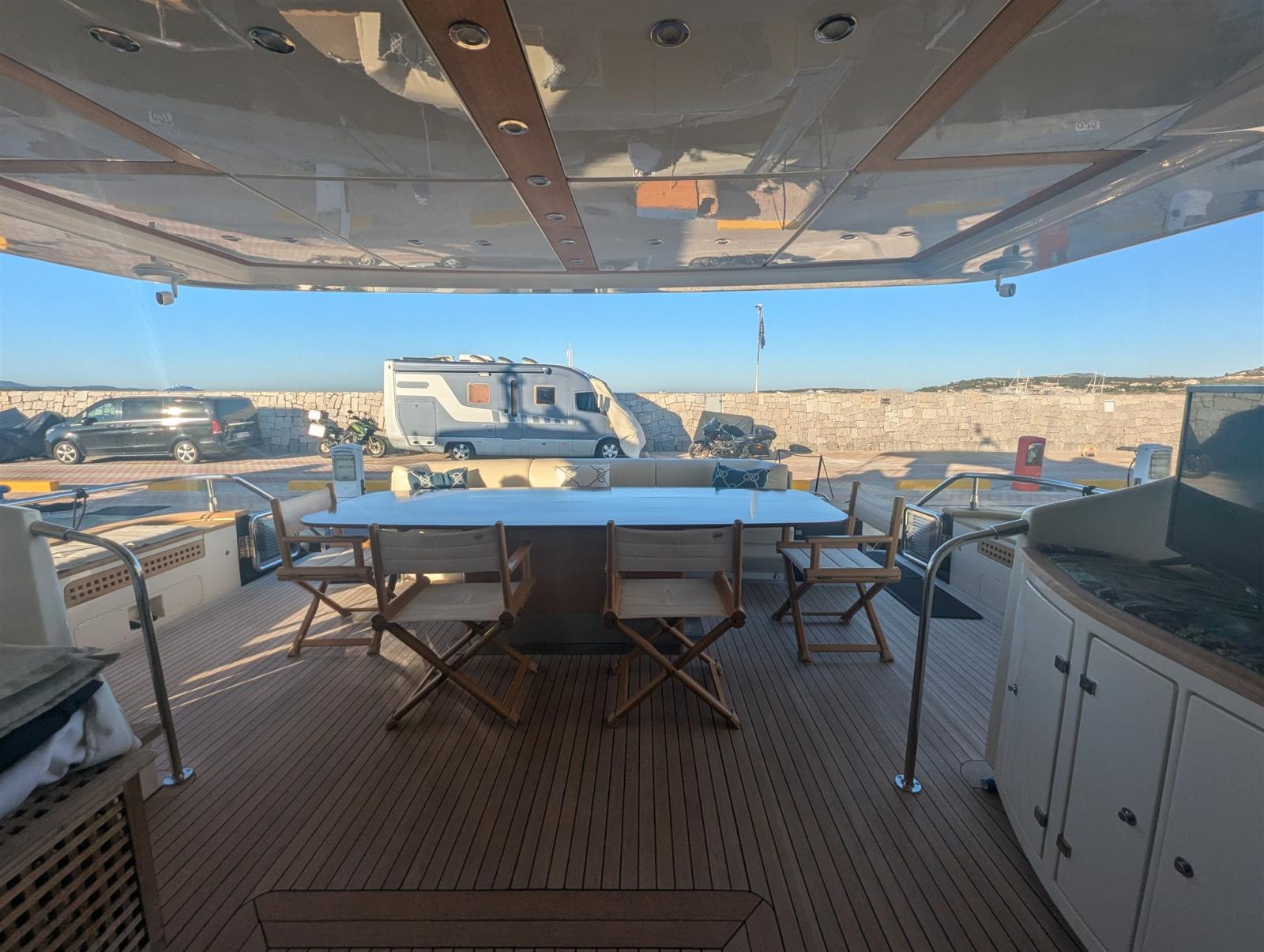 2 Allarme motore, Allarme sentina, Alternatore, Autoclave, Camminamenti laterali in teak, 2 Caricabatterie, Colorazione speciale (Blu), Doccia esterna, Doppia timoneria, Fari fissi a poppa, Faro orientabile, Flap idraulici, Garage per tender, Gruette per tender su fly, Impianto antincendio, Indicatori Flaps, Lavaggio catena, Luci di cortesia, Luci subacquee, Passerella (elettroidraulica), Piattaforma (custom, elettroidraulica), 6 Pompa di sentina automatica, Ponte in teak, Porta ingresso, 2 Porta laterale, Pozzetto Teak, Presa 220V banchina, Presa acqua banchina, Raddrizzatore, Rollbar (in Vtr), Salpa Ancore Elettrico, Scaletta da bagno, Selle per Tender, Tavolo pozzetto, Tromba, 2 Winch tonneggio di poppa, 2 Winch tonneggio di prua.