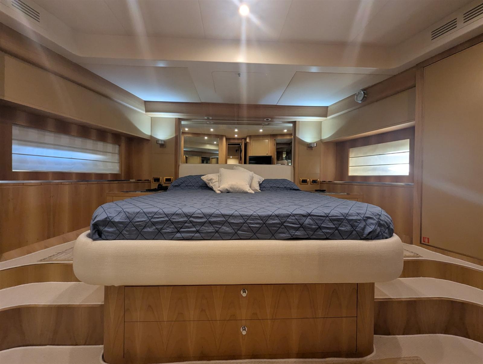 Il Riva 85 Opera è una icona di eleganza e prestazioni. Con una lunghezza fuori tutto di 26 metri, ma con omologazione sotto i 24, offre tutti i vantaggi di un superyacht restando nella categoria delle imbarcazioni da diporto. Questa rara versione a tre cabine e tre bagni è pensata per l’armatore che mette il comfort e la privacy al primo posto. La suite armatoriale, a tutta larghezza, è un vero e proprio appartamento sul mare, arricchito da uno studio privato per lavorare o rilassarsi in totale riservatezza. La cabina VIP e la cabina doppia, entrambe con bagno ensuite, garantiscono agli ospiti degli spazi generosi e finiture di pregio, offrendo un livello di abitabilità e comfort che le configurazioni a quattro cabine non possono eguagliare. Il grande salone, luminoso e curato nei minimi dettagli, conduce ad una galley separata a prua, con accesso latarale per il personale di bordo. Sul Fly, ampio e ben curato, trovano spazio l’area comando, una grande dinette coperta ed un’area relax a poppa. Questo Riva 85 Opera rappresenta l’essenza dello yachting privato di alta gamma: pochi ospiti, spazi generosi, privacy assoluta e il fascino intramontabile del design Riva.