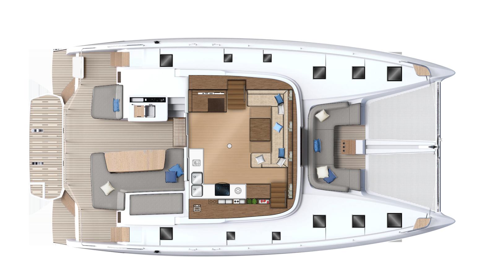 Le nouveau concept d'accès à bord et de circulation offre une sensation inédite. Les jupes arrière ne sont plus uniquement un espace de circulation, mais un véritable espace de vie au mouillage, pour cuisiner en plein air ou simplement rêver au ras de l’eau…