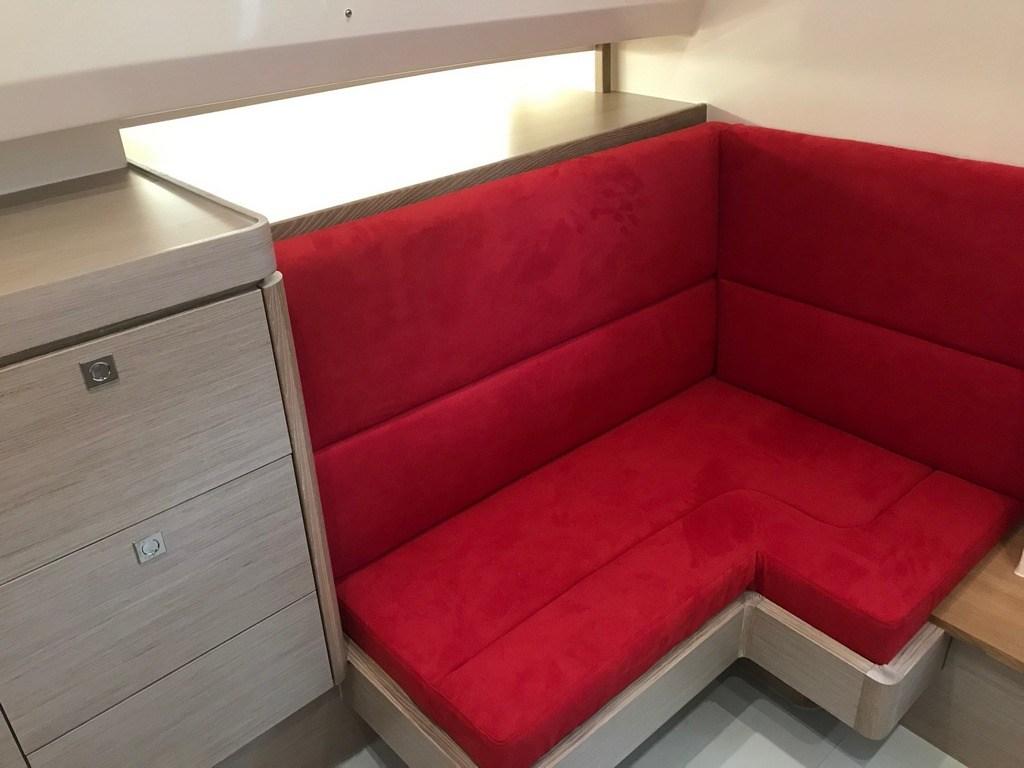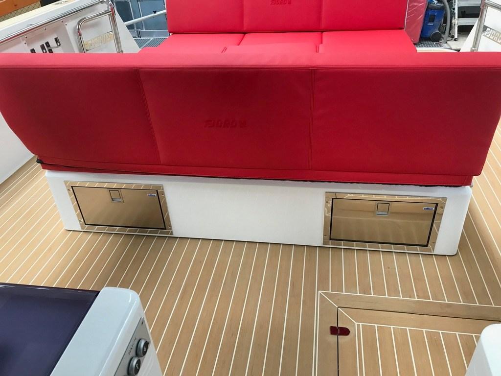 Bimini (aft black mash + 2 poles), 3 Cuscineria completa (Pilot seats Silvertex red), 3 Cuscineria di prua (Silvertex red), 5 Cuscineria Pozzetto (Silvertex red), 6 Telo coprisedile (light grey).