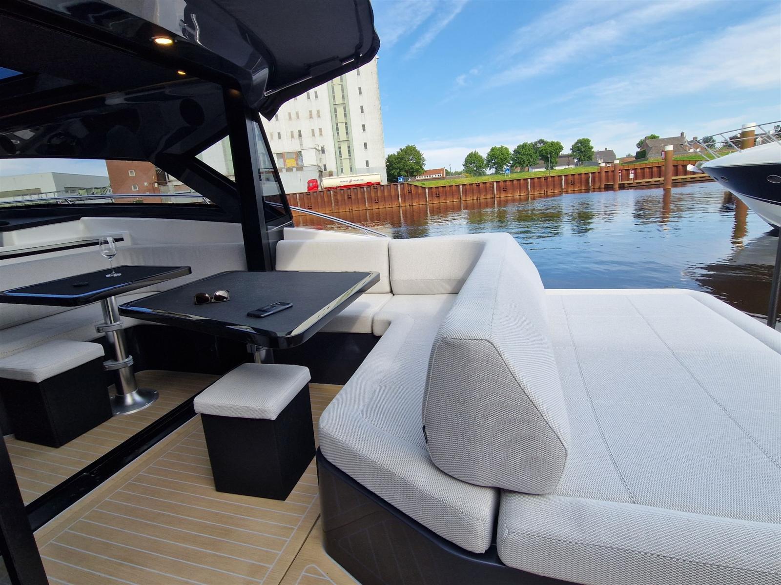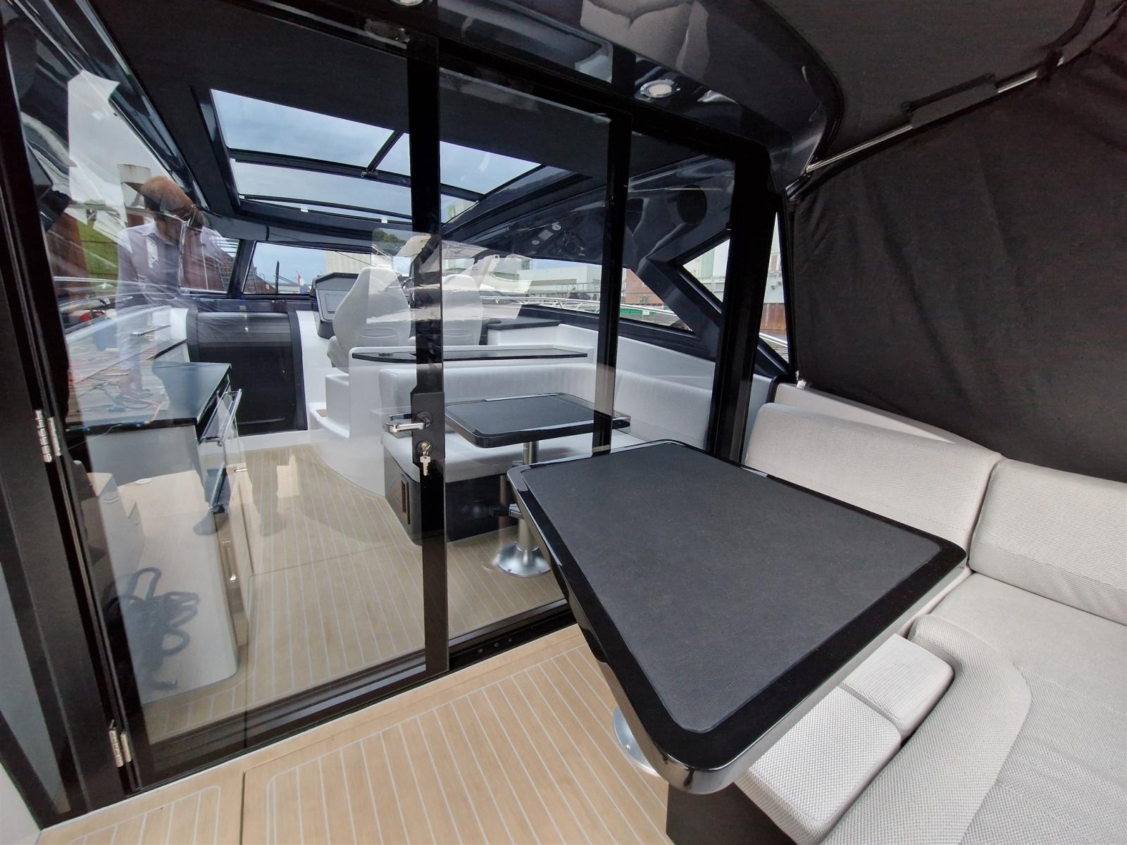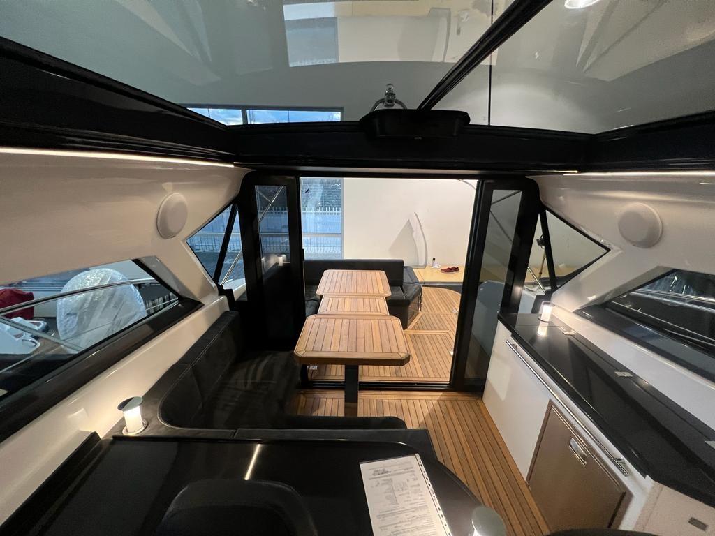 Musone di prua in acciaio inox con fermo ancora. 10 oblò apribili. Corrimano hard top in acciaio inox. sedili pilota e copilota regolabili. Mobile bar con piano in kerrock. Indicatori motore (giri al minuto, pressione olio, temperatura liquido di raffreddamento, voltmetro, indicatore Power-trim, spie di allarme, livello carburante). Tridata. Prese di corrente 230 V. Pavimento in legno in dinette. Wet bar in pozzetto in Kerrock
