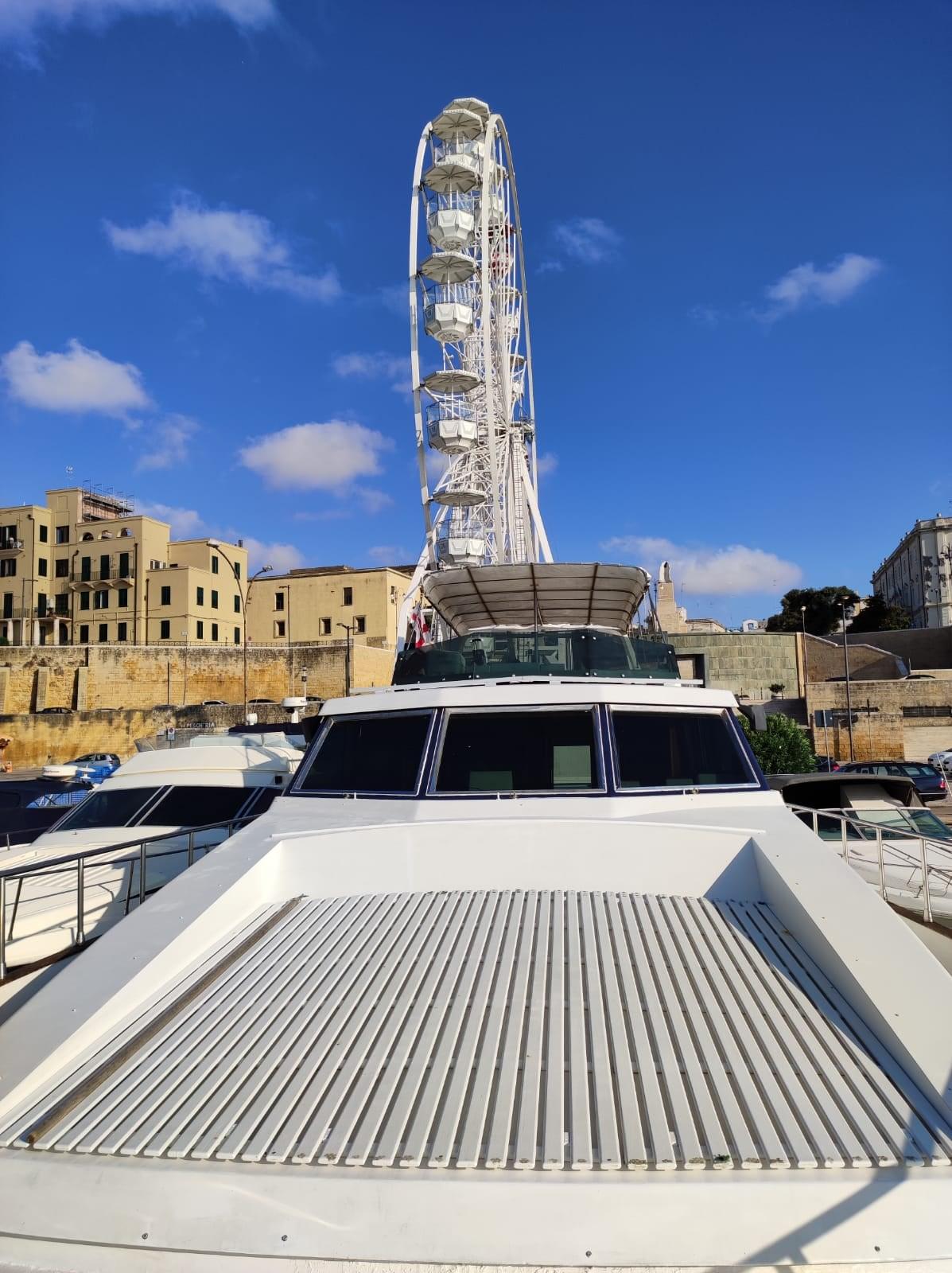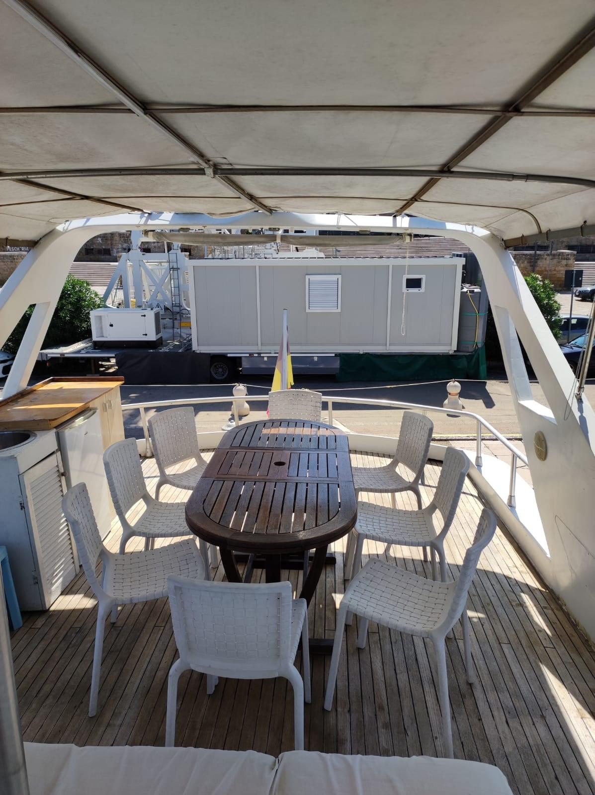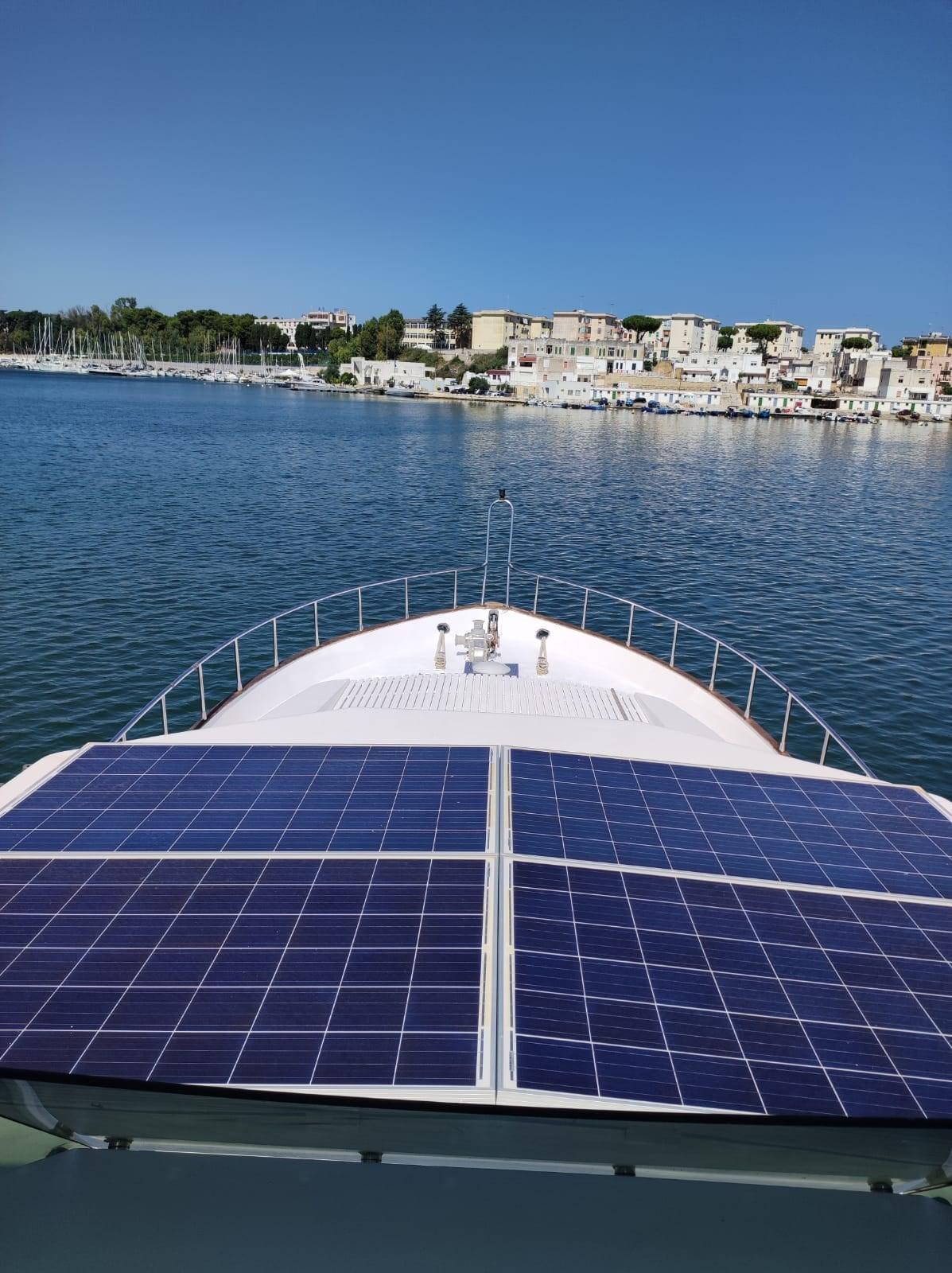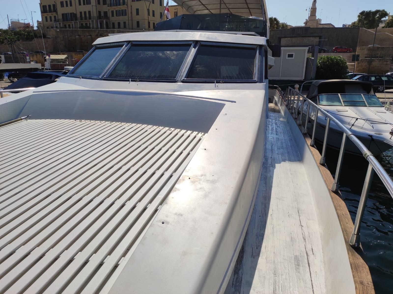 Allarme fumo/gas, Allarme motore, Autoclave, 14 Batterie, Camminamenti laterali in teak (verniciato bianco da meta' barca), Doccia esterna, Doppia timoneria, 4 Pannelli Solari, Passerella (elettroidraulica), Pompa di sentina automatica, Porta ingresso, Porta laterale, Pozzetto Teak, Presa 220V banchina, Presa acqua banchina, Raddrizzatore, Salpa Ancore Elettrico, Scaletta da bagno, Tavolo pozzetto, Tromba.