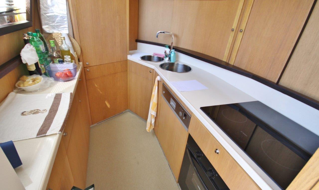 Il salone è disposto, come ormai consuetudine su imbarcazioni di questa tipologia, su due livelli, ma in questo caso si è particolarmente insistito sul concetto di separare nettamente la zona living a poppa, la zona pranzo nella sezione mediana e la zona operativa a pruavia. Molto bella la cucina, in diretto contatto con la zona da pranzo, così come la zona di governo, posizionata centralmente e arricchita da un comodo divanetto di servizio e dal portellone di accesso al camminamento esterno di dritta. La zona notte è compartimentata in modo da offrire quattro comode cabine con servizi privati: VIP a prua, due cabine ospiti a poppavia cabina VIP (una con letti in piano e una con letti sovrapposti a L) e infine la suite armatoriale a centro barca. Suite nel vero senso della parola, arricchita da un locale bagno con doccia-Jacuzzi, un locale spogliatoio, la zona beauty e il comodo divanetto per due con tavolo.