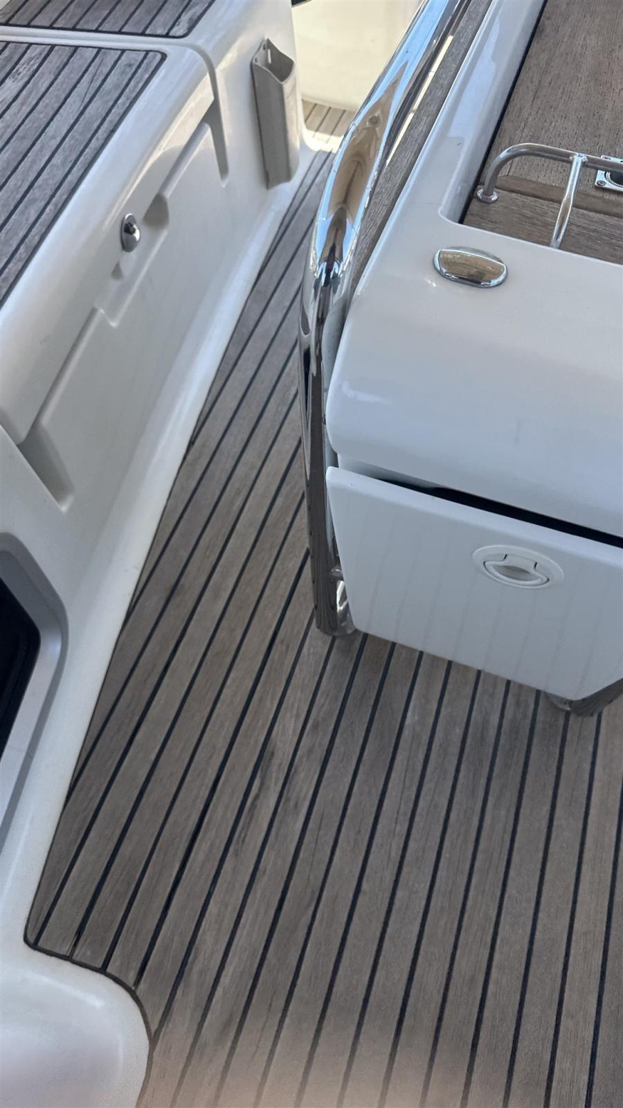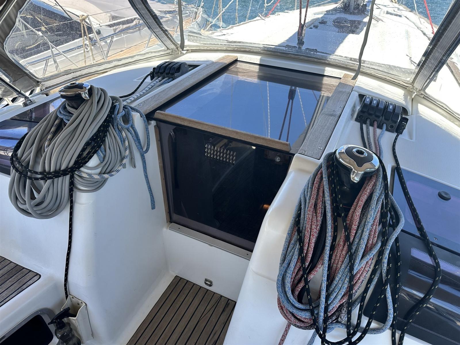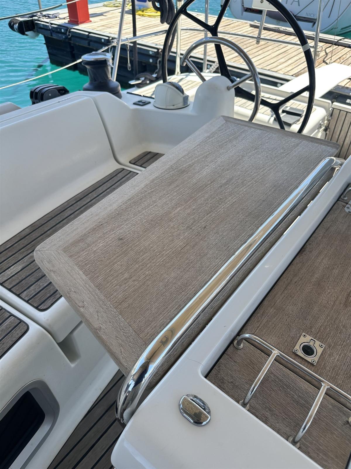 Pozzetto ampio con doppia timoneria. Tavolo da pozzetto integrato con ghiacciaia. Winch maggiorati per manovre in equipaggio ridotto. Plancetta di poppa abbattibile . Passavanti ampi e comodi