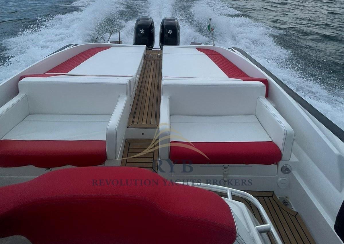 Camminamenti laterali in teak, Doccia esterna (PRUA E POPPA), Lavandino nel Pozzetto, Luci di cortesia, Piattaforma (TEAK), Pozzetto Teak, Presa 220V banchina, Salpa Ancore Elettrico.