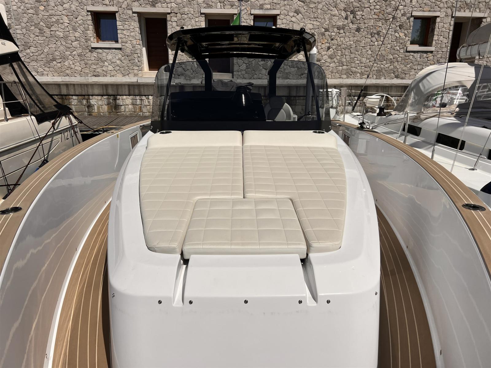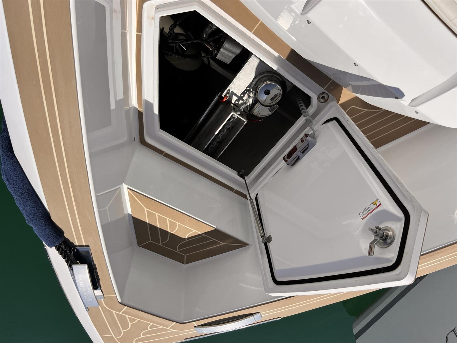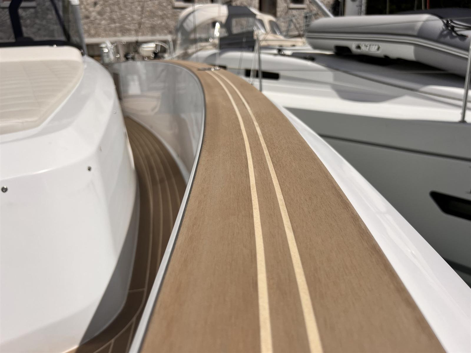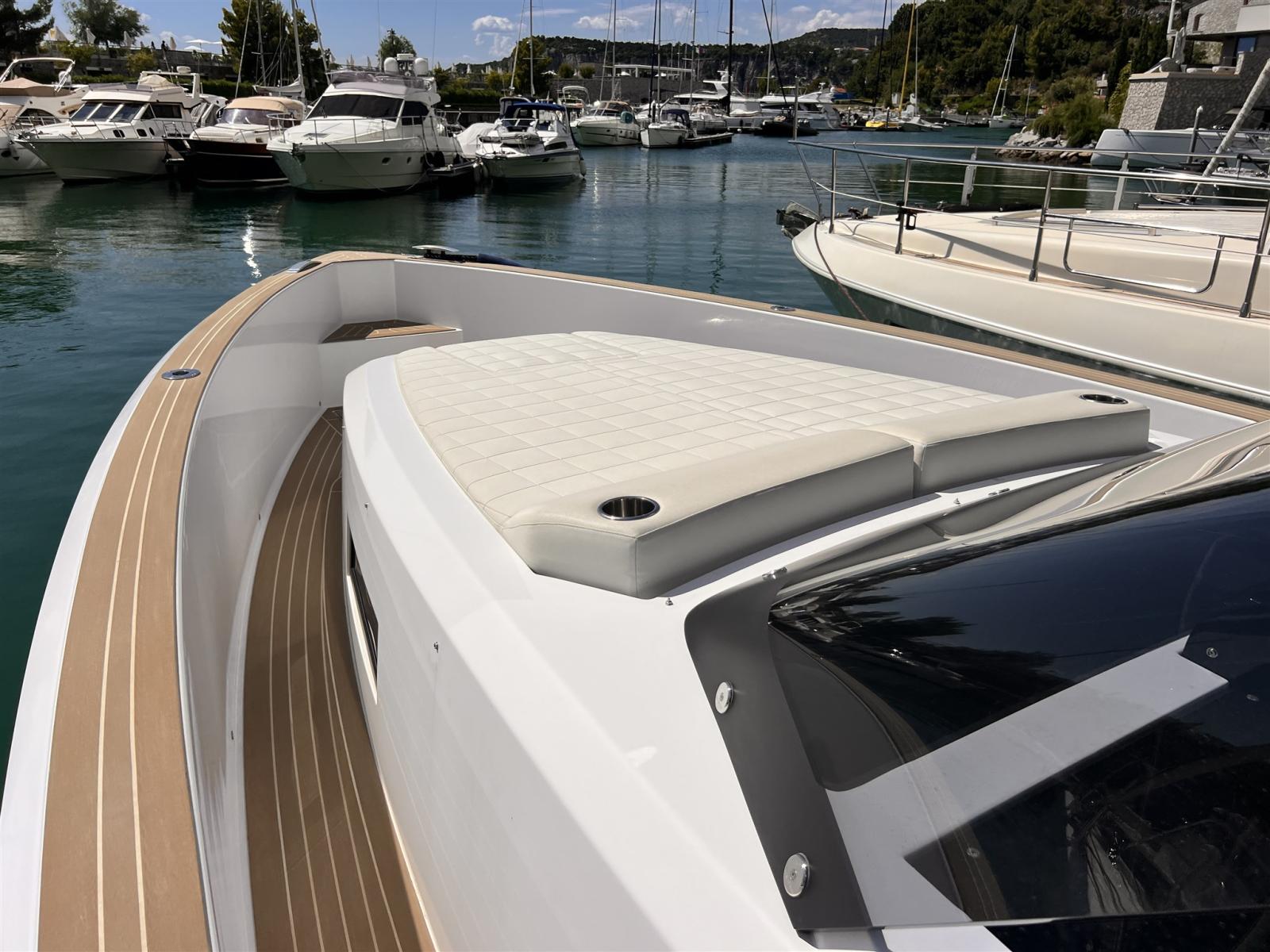 Allarme motore, Allarme sentina, Ancora (13KG, 50 M CHAIN 8MM), Auto Dynamic Trim Interceptor, Autoclave, 2 Batterie (2X90Ah), Camminamenti laterali in teak, Doccia esterna, Lavandino nel Pozzetto, Luci di cortesia, Piattaforma, Ponte in teak (Flexiteak), Pozzetto Teak (Flexitwak), Presa 220V banchina, Salpa Ancore Elettrico (Trefoil anchor electric system), Scaletta da bagno, Tavolo pozzetto.