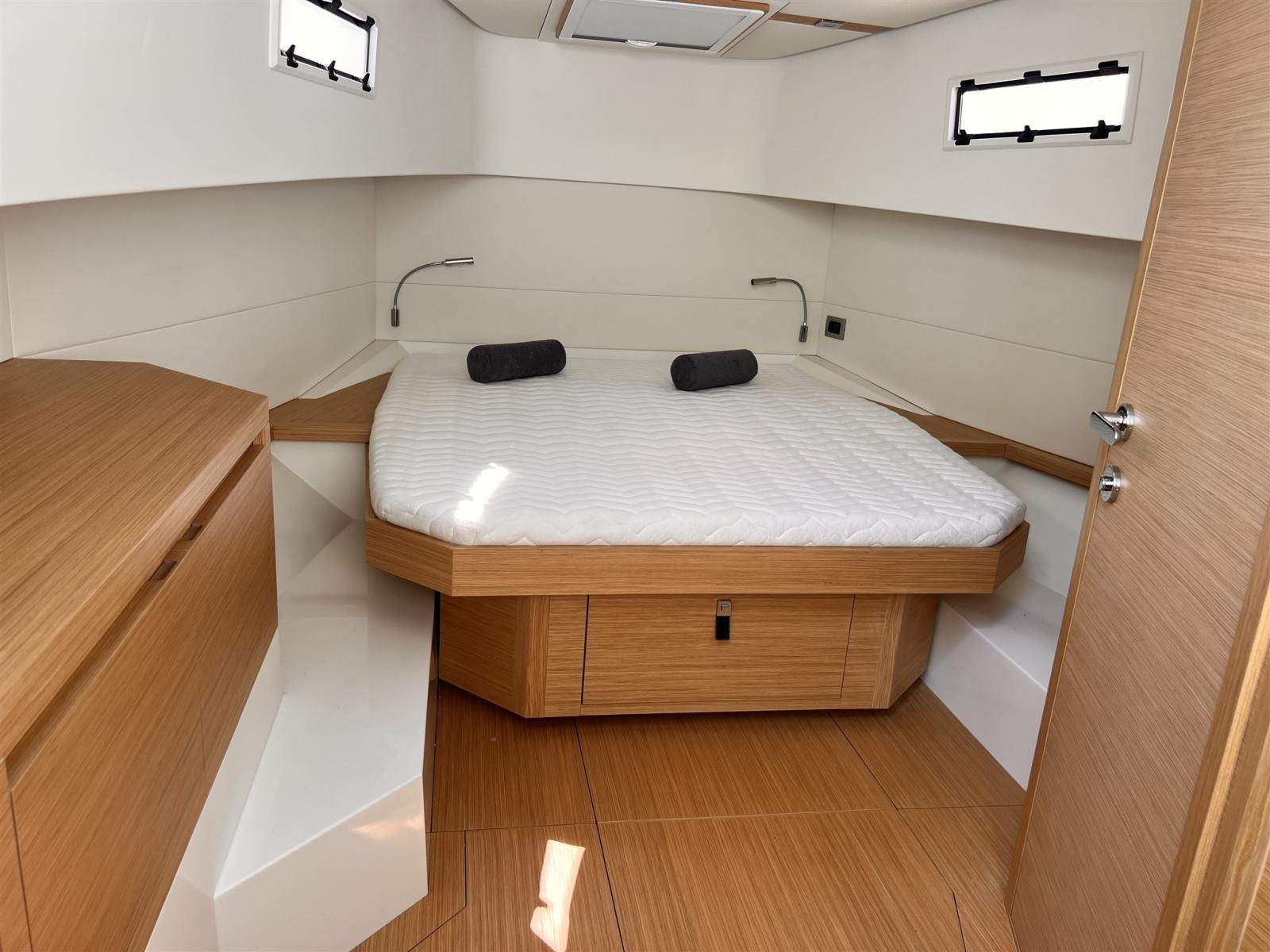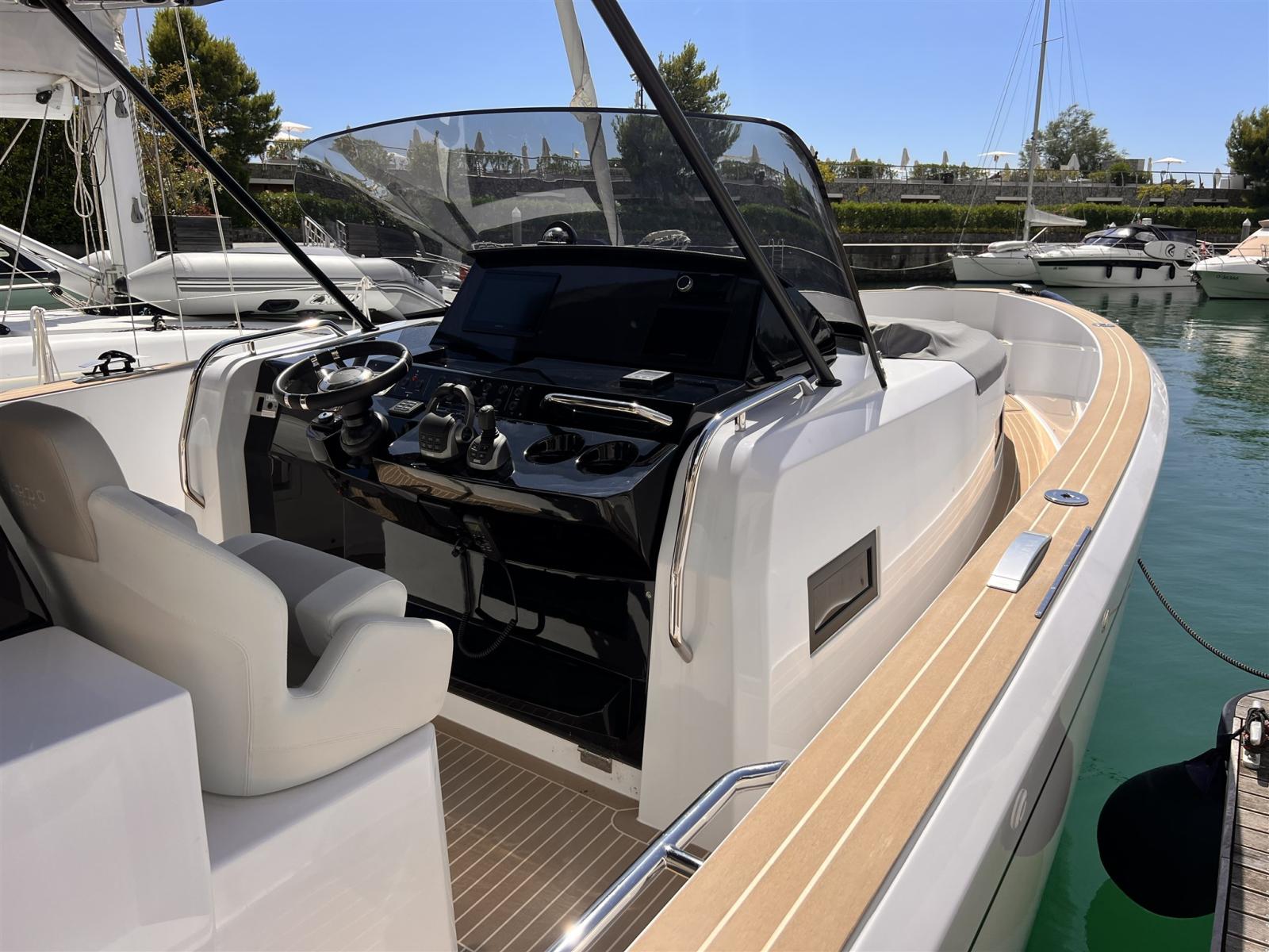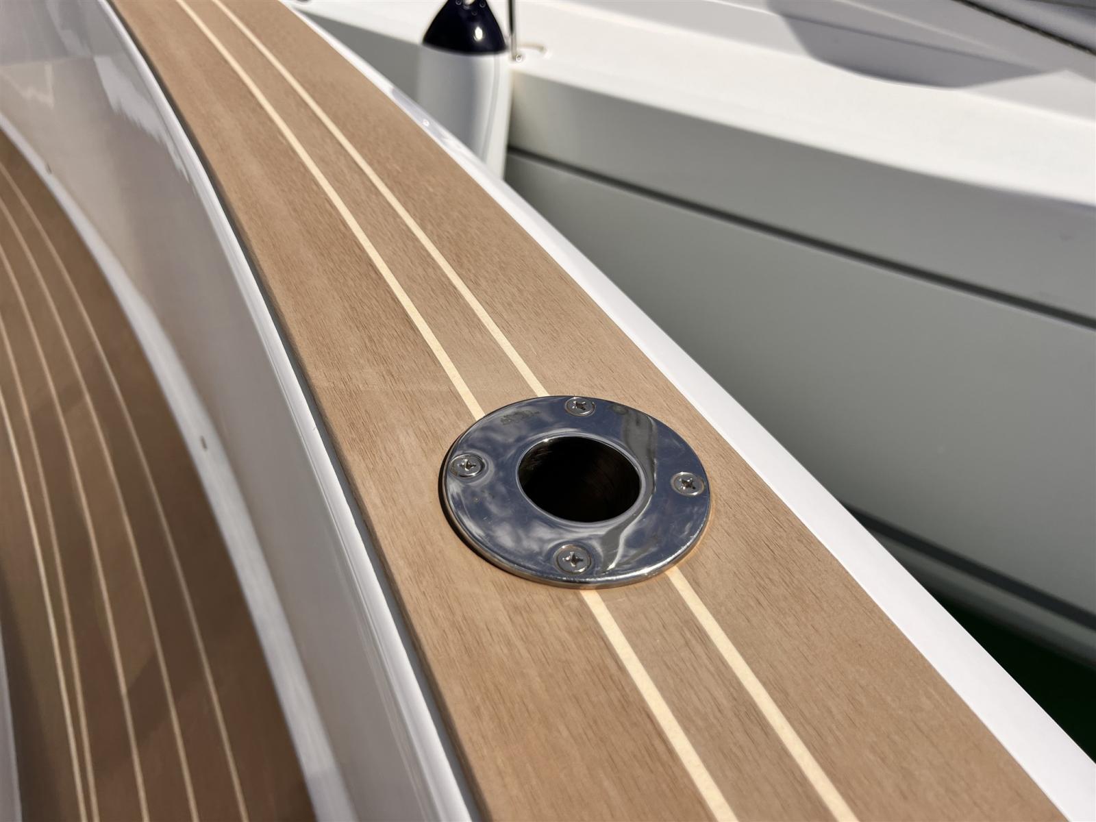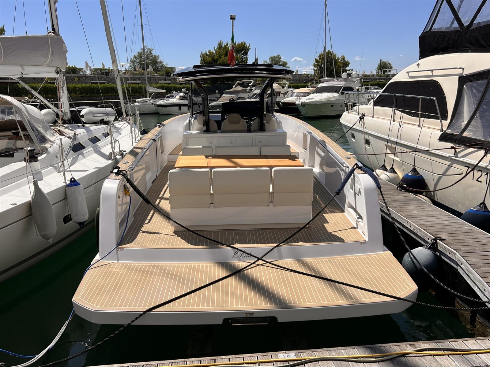 Allarme motore, Allarme sentina, Ancora (13KG, 50 M CHAIN 8MM), Auto Dynamic Trim Interceptor, Autoclave, 2 Batterie (2X90Ah), Camminamenti laterali in teak, Doccia esterna, Lavandino nel Pozzetto, Luci di cortesia, Piattaforma, Ponte in teak (Flexiteak), Pozzetto Teak (Flexitwak), Presa 220V banchina, Salpa Ancore Elettrico (Trefoil anchor electric system), Scaletta da bagno, Tavolo pozzetto.