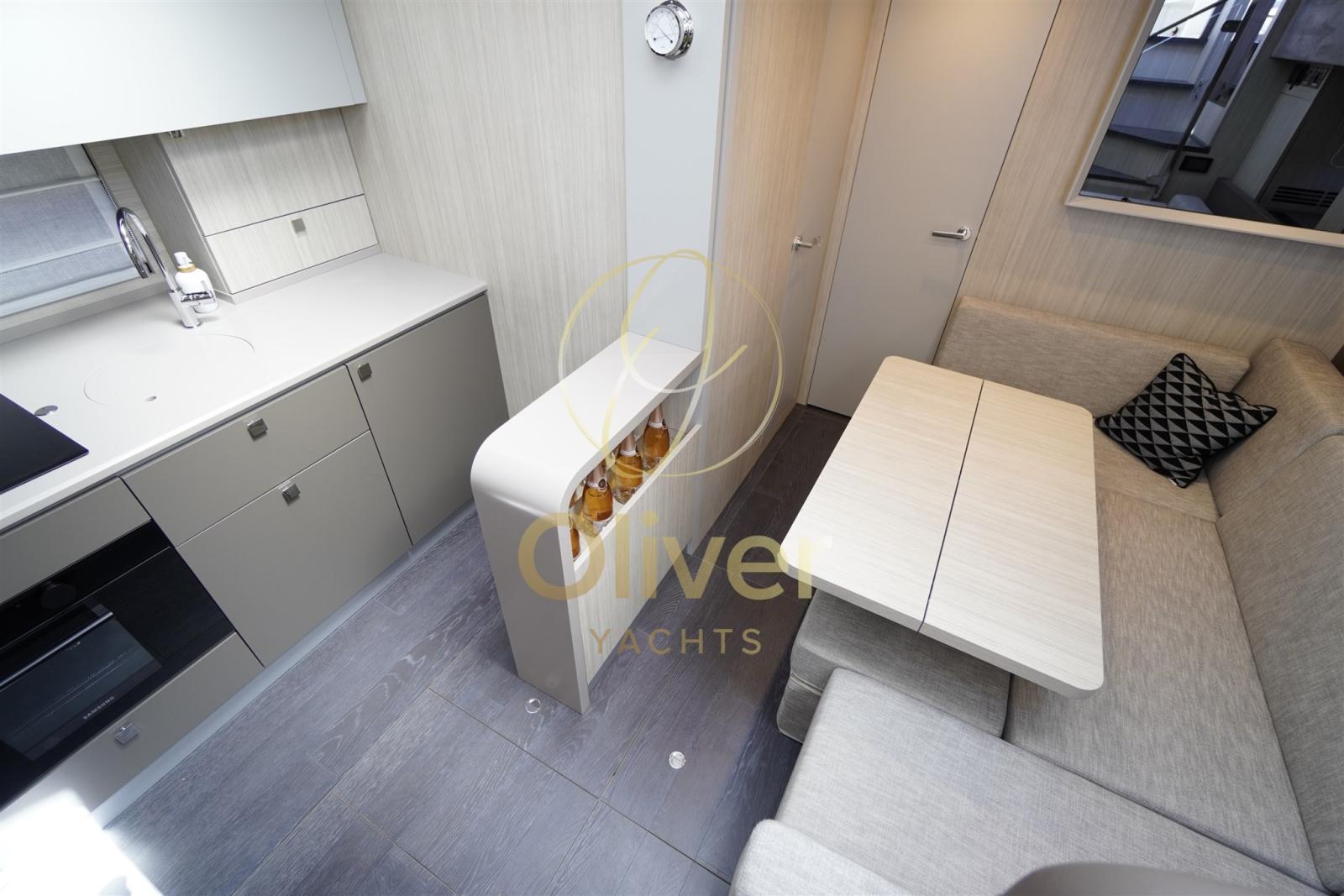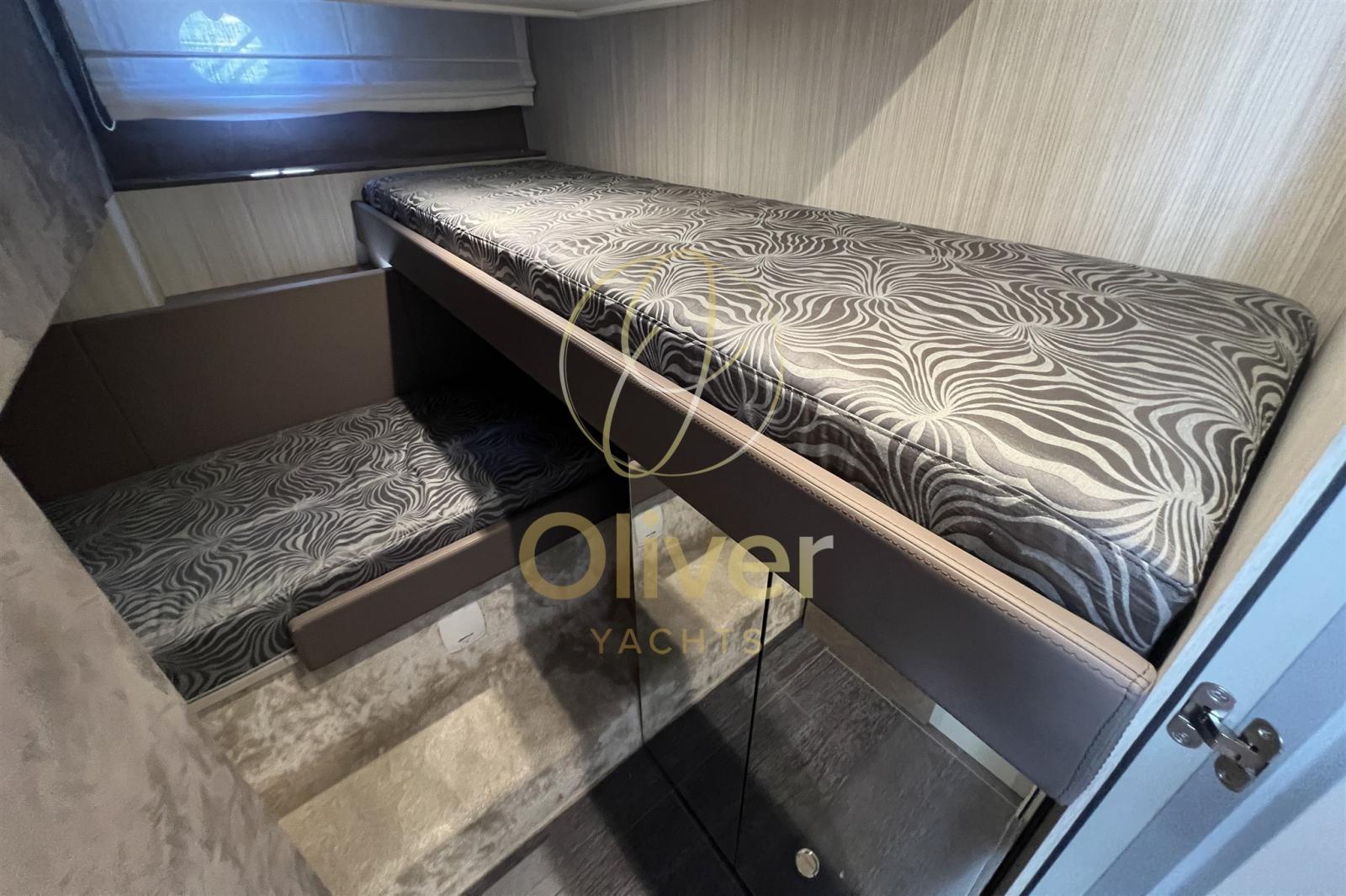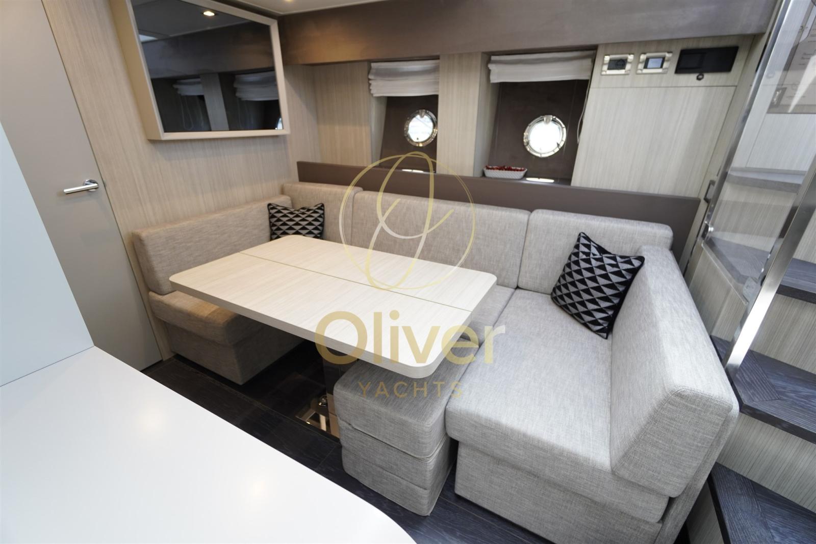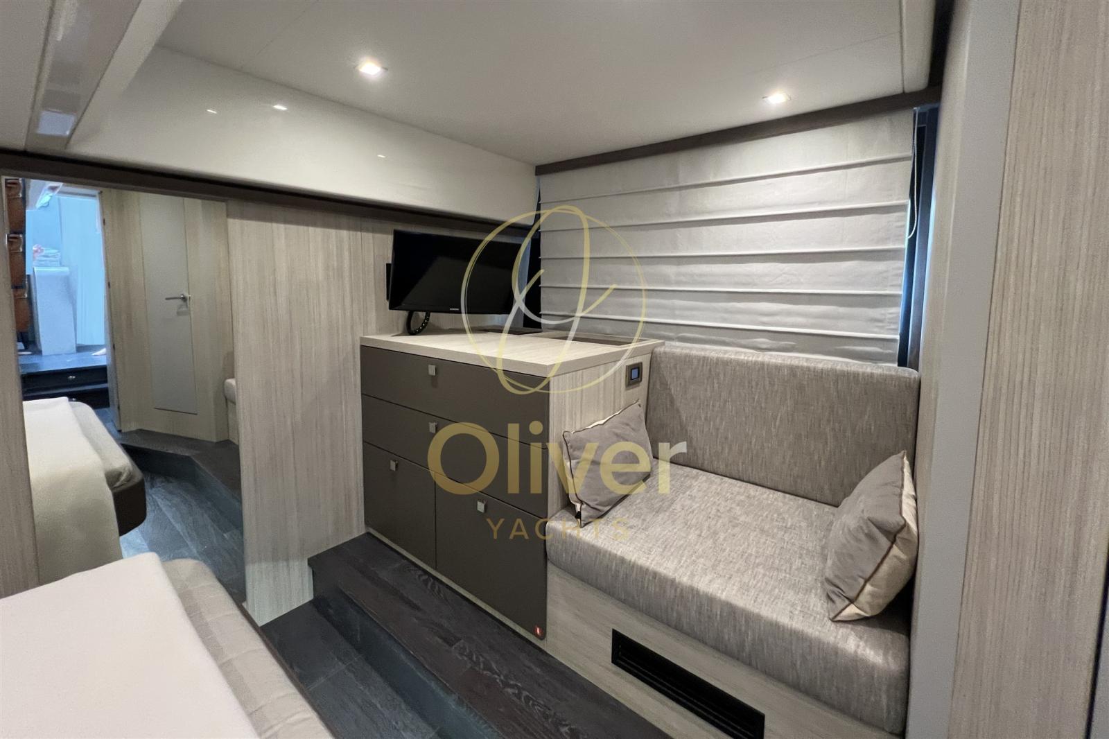 Gli interni del Cranchi 60 ST sono un trionfo di design contemporaneo, comfort e funzionalità, pensati per offrire un’atmosfera elegante e rilassante durante ogni navigazione. I materiali sono selezionati con estrema cura: rivestimenti chiari effetto legno spazzolato, tessuti pregiati, pavimentazione in doghe di rovere scuro e inserti in alcantara creano un ambiente caldo e sofisticato. Il layout prevede un ampio salone con zona pranzo convertibile, una cucina attrezzata con piano cottura a induzione, forno, lavastoviglie e ampi spazi di stivaggio. Sono presenti tre cabine per gli ospiti. La master cabin a centro barca è una vera suite, completa di bagno privato e ampio armadio. La VIP cabin a prua accoglie due persone con grande comfort, mentre la terza cabina con letti incrociati è perfetta per bambini o ospiti. L’illuminazione LED ben studiata, i numerosi oblò e le finestrature panoramiche garantiscono luce naturale e ariosità in ogni ambiente. Gli interni del 60 ST sono pensati per vivere il mare con stile e praticità, con soluzioni intelligenti che ottimizzano ogni spazio e materiali che trasmettono un’eleganza senza tempo. È un vero yacht da vivere, non solo da ammirare.