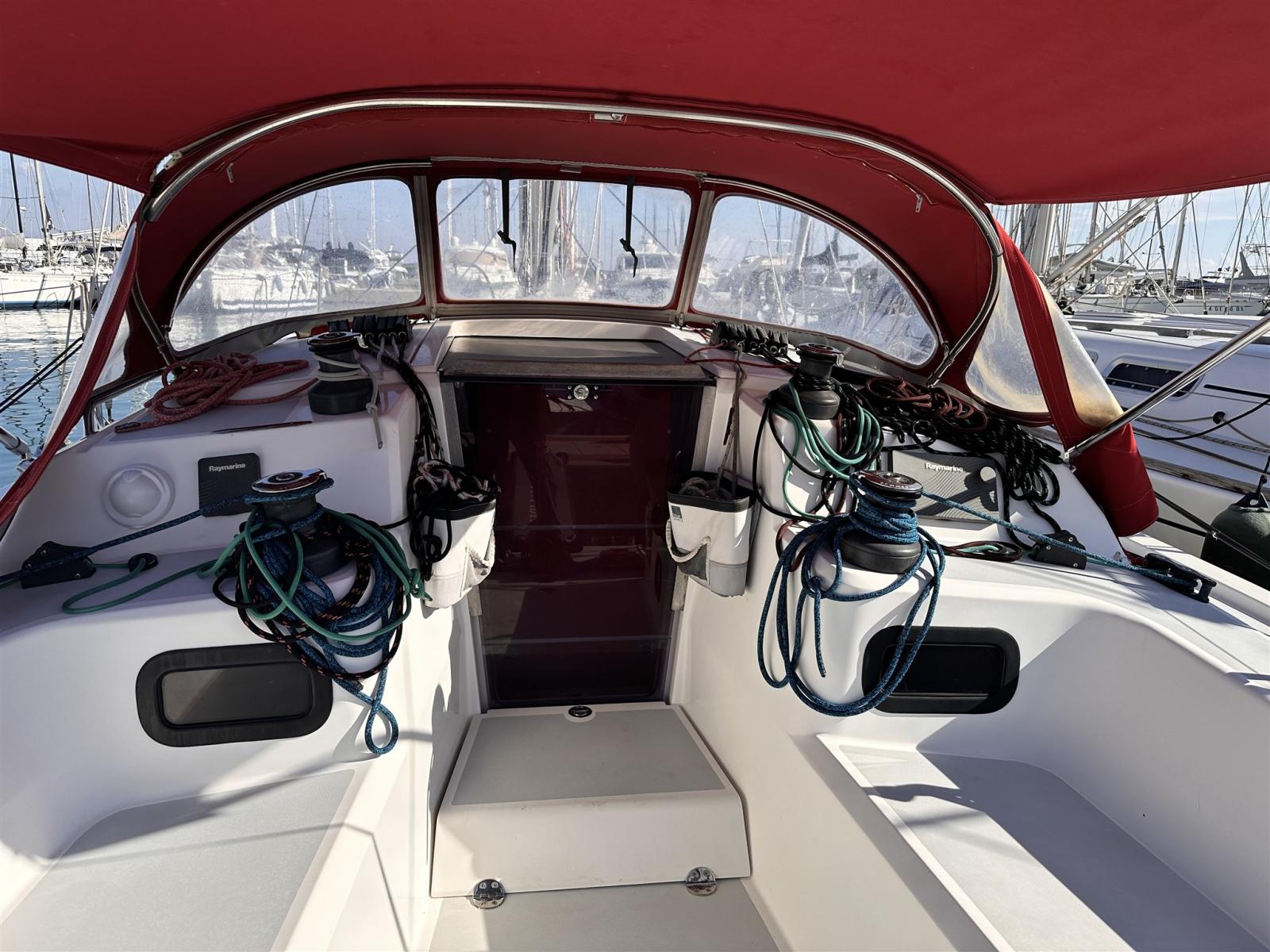 AIS (Attivo), Angolo barra, Antenna radar (Rayamrine), Contamiglia (Raymarine), Ecoscandaglio (Raymarine), Log (Raymarine), Pilota automatico (Raymarine inboard), Plotter con antenna GPS (Raymarine), Radar (Raymarine), Stazione vento (Raymarine).