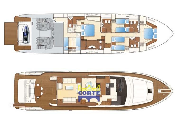 Con i suoi 24 metri (78 piedi) è caratterizzato da ampi spazi e dalla scelta di finiture e masselli in teak invece del tradizionale legno di ciliegio utilizzato nelle imbarcazioni Ferretti Yachts di queste dimensioni.Accedendo dal pozzetto al salone del nuovo Ferretti 780 si nota subito come la disposizione degli arredi consenta di godere al massimo della zona living, dotata di apparecchiature audio-video altamente sofisticate. Il nuovo layout con la scala di accesso al flying bridge integrata nella murata della barca offre una soluzione visiva continuativa, da poppa verso prua. La zona pranzo, separata da un gradino dal salone, ospita un tavolo per otto persone, mentre sotto la scala è stato ricavato un mobile bar con anta in vetro opalino illuminata all'interno.Dalla zona pranzo è possibile raggiungere a destra la plancia di comando e la scala per la discesa sottocoperta, a sinistra l'ampia cucina in teak e il portellone laterale per l'uscita esterna, che consente all'equipaggio di non attraversare il salone, tutelando quindi la privacy dell'armatore e dei suoi ospiti. La plancia di comando, con finiture grigio antracite antigraffio, può essere dotata di tutta la tecnologia di ultima generazione che contraddistingue le imbarcazioni Ferretti Yachts: il sistema di controllo Naviop e gli stabilizzatori giroscopici ARG. A fianco della postazione di comando si trova un comodo divano a L che consente all'armatore di condividere con famiglia e ospiti i momenti della navigazione. Un tavolino estraibile a ridosso del divano offre una comoda dinette. Scendendo sottocoperta, si accede alla cabina armatoriale, posta sulla sinistra e completamente isolata acusticamente dalla zona motori grazie all'interposizione degli alloggi dell'equipaggio e del serbatoio. Per godere al massimo delle due ampie finestrature, con oblò apribili - segno ormai distintivo di Ferretti Yachts il layout della cabina armatoriale (con letto frontale rispetto all'entrata, posizionato nel senso della navigazione) presenta una grande porta scorrevole per separare la zona bagno dalla camera. La cabina risulta molto luminosa ed è possibile vedere il mare stando comodamente stesi sulla chaise longue o dalla sala da bagno, attrezzata con una spaziosa doccia fissa con porta in cristallo temperato. Un lavabo semi-circolare è posizionato centralmente sotto la finestra che può essere oscurata da un doppio pannello scorrevole che presenta uno specchio all'interno.La cabina, molto ampia, offre anche una zona più intima che ospita la cabina armadio e un vanity, mentre il letto è affiancato da due comodini sospesi, con luce di lettura integrata, che ne definiscono lo stile contemporaneo ed essenziale.A prua si trova una confortevole cabina VIP, con letto matrimoniale e doppi armadi. Le due cabine con letti gemelli offrono un'alternativa interessante per coloro che desiderano ospitare una coppia di amici in più: quella di sinistra infatti, su richiesta dell'armatore, può essere dotata di letto matrimoniale anziché di due letti singoli. Ogni cabina del Ferretti 780 ha un bagno con doccia fissa integrata con vetri in cristallo temperato. Per quanto riguarda lo spazio all'aperto, sul Ferretti 780 non mancano le occasioni per godere al meglio del sole. Il flying bridge è attrezzato con due ampi prendisole - uno in particolare, grazie allo spostamento dell'osteriggio a murata - una zona grill e un comodo divano semi-circolare che accoglie un tavolo centrale.A poppa un ampio pozzetto ospita un tavolo in teak con quattro sedie e un divanetto. Un'ulteriore innovazione progettuale è rappresentata dal portellone di poppa apribile elettricamente che, oltre ad ospitare moto d'acqua e tender, si trasforma in un'ampia spiaggetta rivestita in teak, accessibile grazie a due comode scalette laterali.Per quanto riguarda le prestazioni, la configurazione standard del Ferretti 780 prevede 2 motori MTU 2000 da 1660 cavalli di potenza in grado di raggiungere 26 nodi a velocità di crociera e 30 di velocità massima.