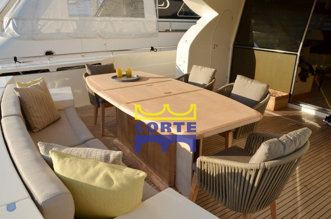 Allarme fumo/gas, Allarme motore, Allarme sentina, Ancora (tipo Bruce 50 Kg diff. da 30 Kg), Autoclave, 8 Batterie, Camminamenti laterali in teak, Doccia esterna, Doppia timoneria, Flap idraulici, Gruette per tender su fly, Impianto antincendio, Luci di cortesia, 2 Luci subacquee (LED), Pannelli Solari, Passerella (elettroidraulica in legno teak), Piattaforma (in teak), Pompa di sentina automatica, Porta ingresso, Porta laterale, Pozzetto Teak, Presa 220V banchina, Presa acqua banchina, Ripetitore strumentazione, Rollbar, Salpa Ancore Elettrico, Scaletta da bagno, Stabilizzatori (Anti RollingGyro), Tavolo pozzetto, Tender, Tromba, 2 Winch tonneggio di poppa, 2 Winch tonneggio di prua.