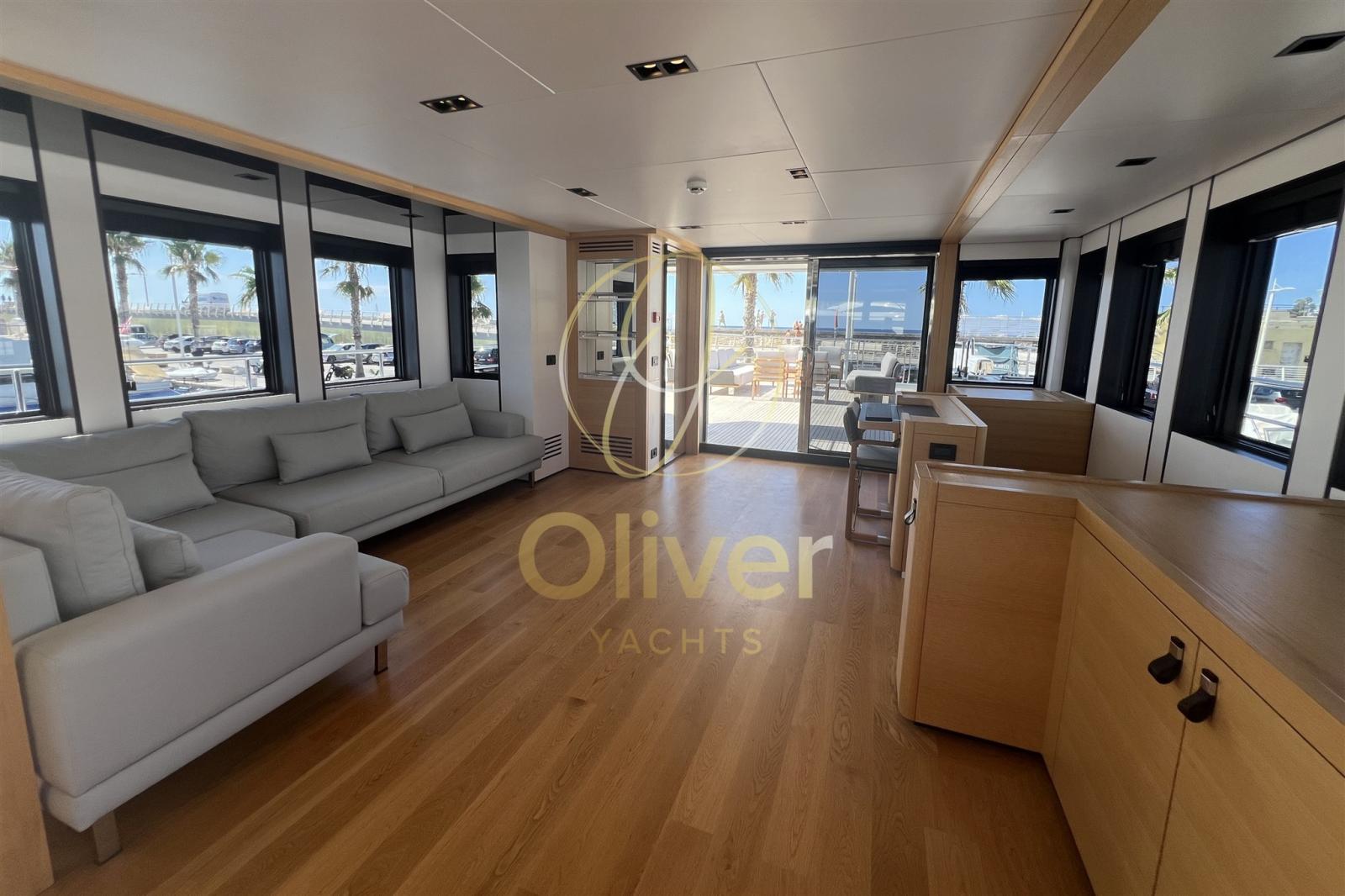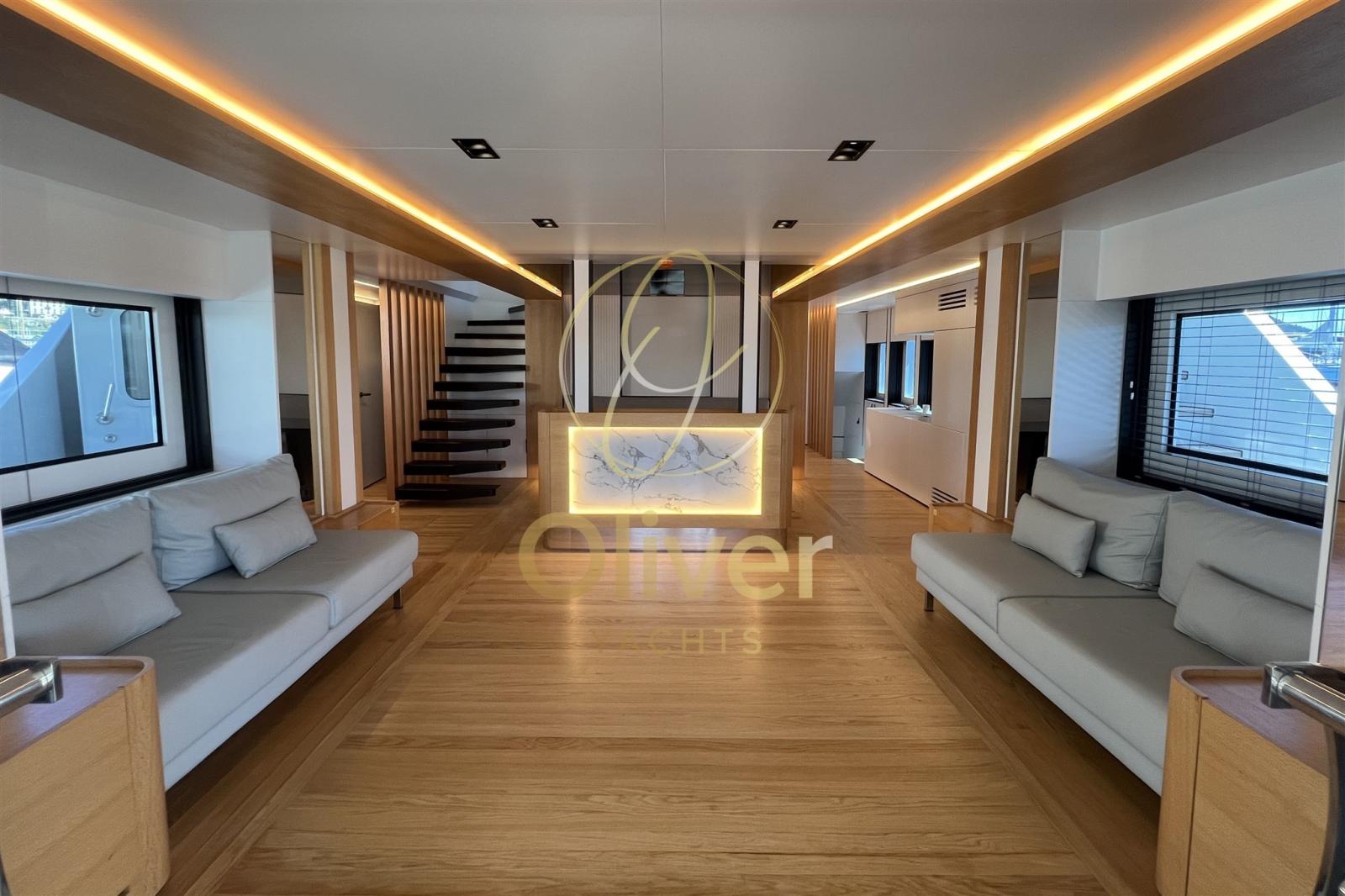 La zona giorno principale si sviluppa sul main deck con un ampio salone open space, che include zona living con divani profondi, tavolo da pranzo e una grande cucina attrezzata separabile. Il design interno è modulabile e adatto sia alla vita familiare che a quella da charter di lusso.