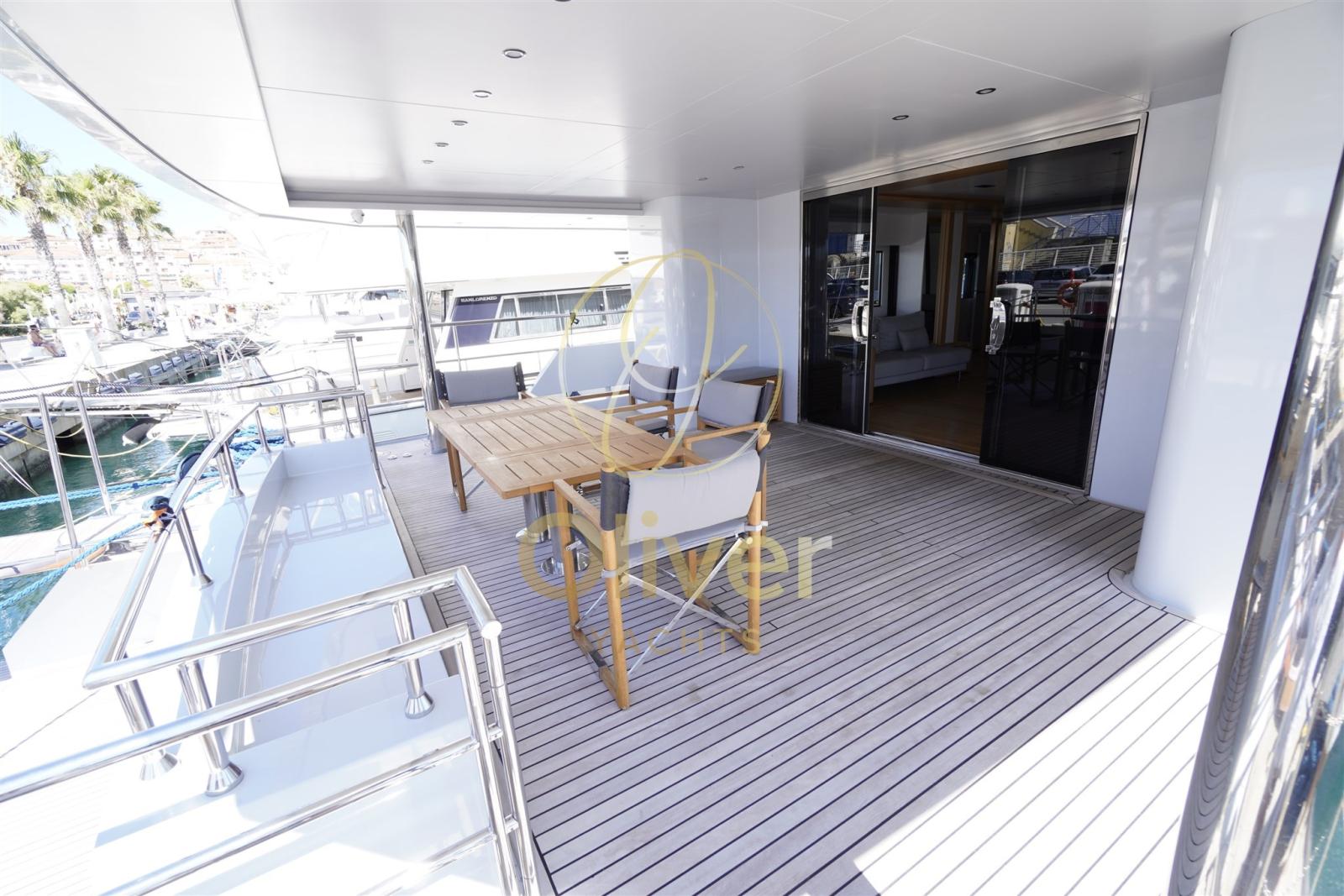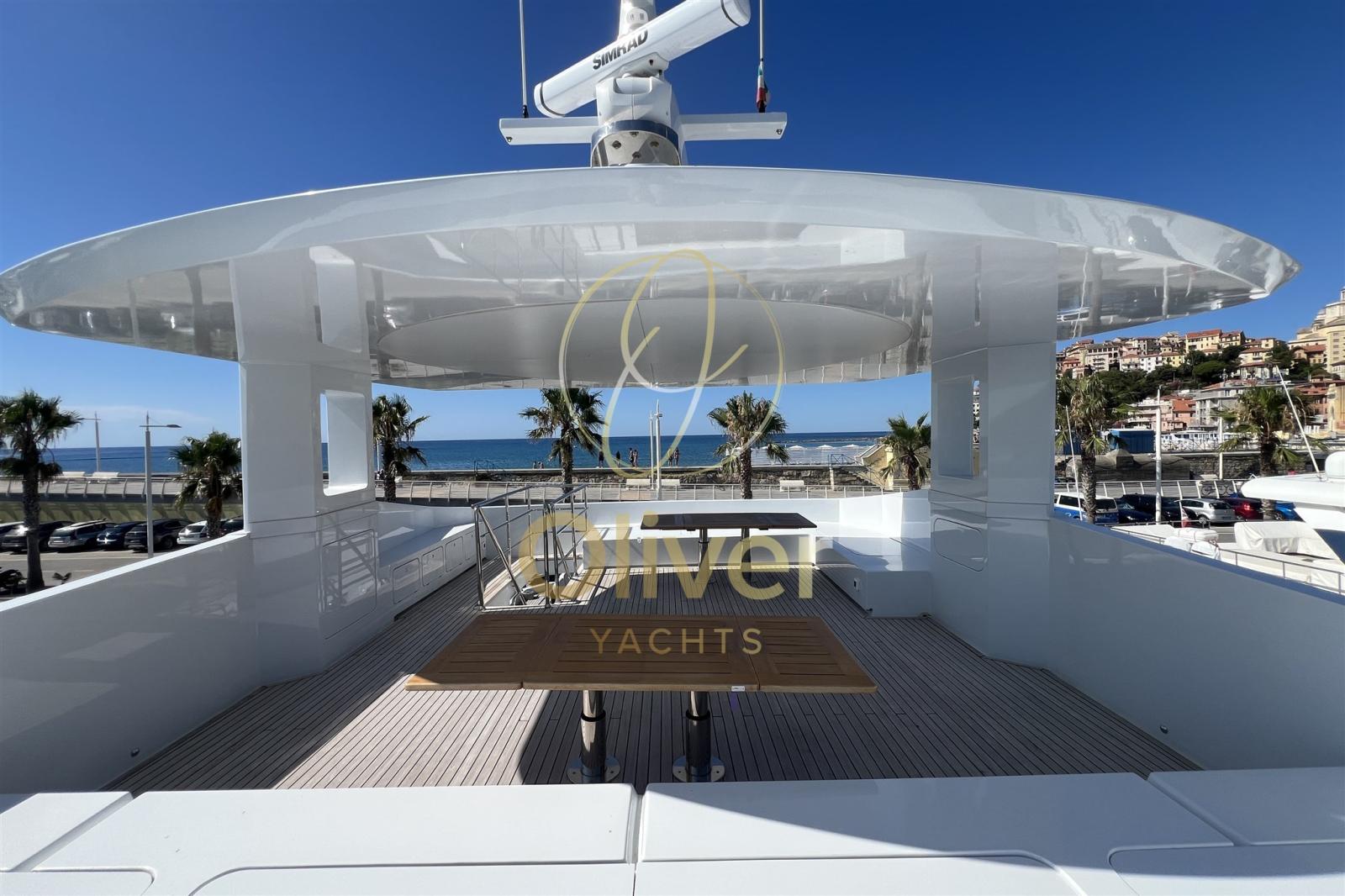 Allarme fumo/gas, Allarme motore, Allarme sentina, Alternatore, 2 Ancora (100 KG HHP HULL TYPE), Autoclave, 10 Batterie, Bitte Abbattibili, Camminamenti laterali in teak, Doccia esterna, Elica di poppa - stern thruster (29 KW), Elica di prua - bow thruster (29 KW), Fari fissi a poppa, Faro orientabile, Flap idraulici, Gruette per tender, Gruette per tender su fly, Hard top, Impianto antincendio, Impianto Aria Compressa, Lavaggio catena, Lavandino nel Pozzetto, Luci di cortesia, Luci subacquee, Passerella, Piattaforma, Pompa di sentina automatica, Pompa di sentina manuale, Ponte in teak, Porta ingresso, Porta laterale, Pozzetto Teak, Presa 220V banchina, Presa acqua banchina, Raddrizzatore, 2 Salpa Ancore Idraulico (DZC), Scaletta da bagno, Selle per Tender, Sistema Depurazione acque nere, Stabilizzatori (SIDE-POWER SPS94B VF1350 1,4), Tavolo pozzetto, Tender, Tientibene con cancelletti, Tromba, T-Top, Winch tonneggio di poppa, Winch tonneggio di prua.