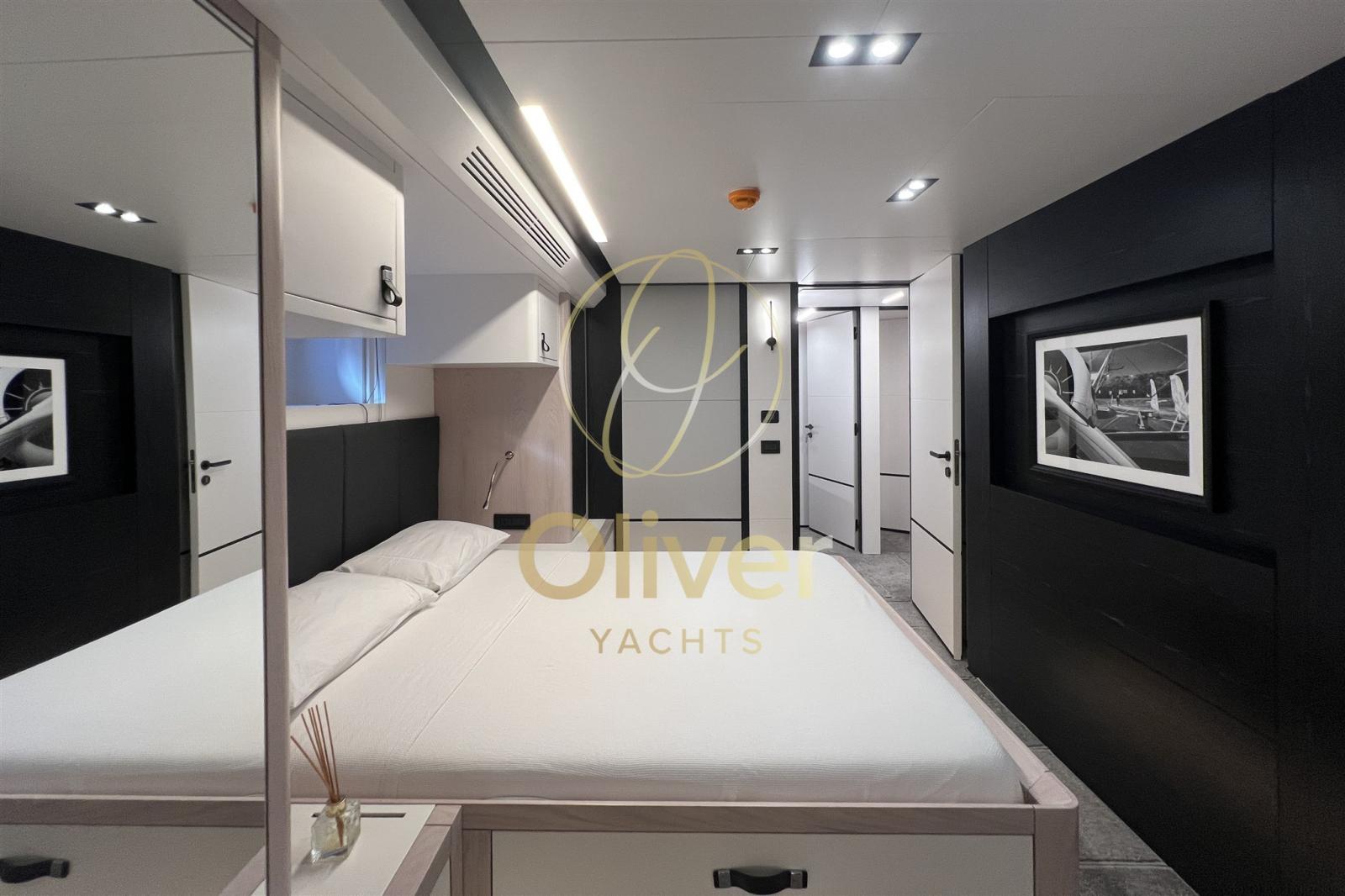 Il layout prevede fino a 5 cabine per un totale di 10 ospiti, tra cui una grande cabina armatoriale full beam sul ponte principale con bagno en-suite, una VIP a prua, due matrimoniali, una doppia con letti incrociati. Tutte le cabine sono dotate toilette ensuitte di aria condizionata, ampi armadi, TV e finiture curate nei minimi dettagli.