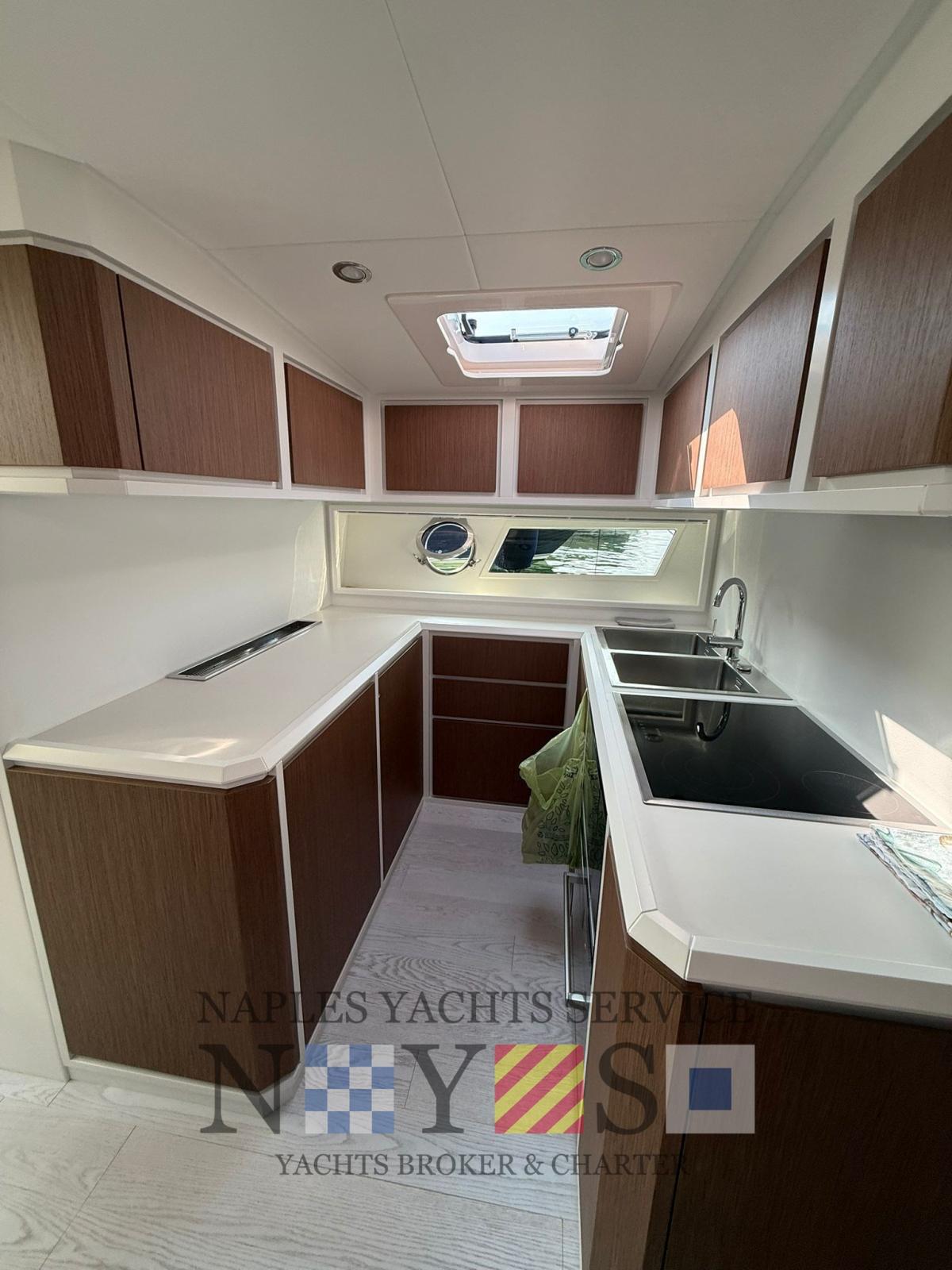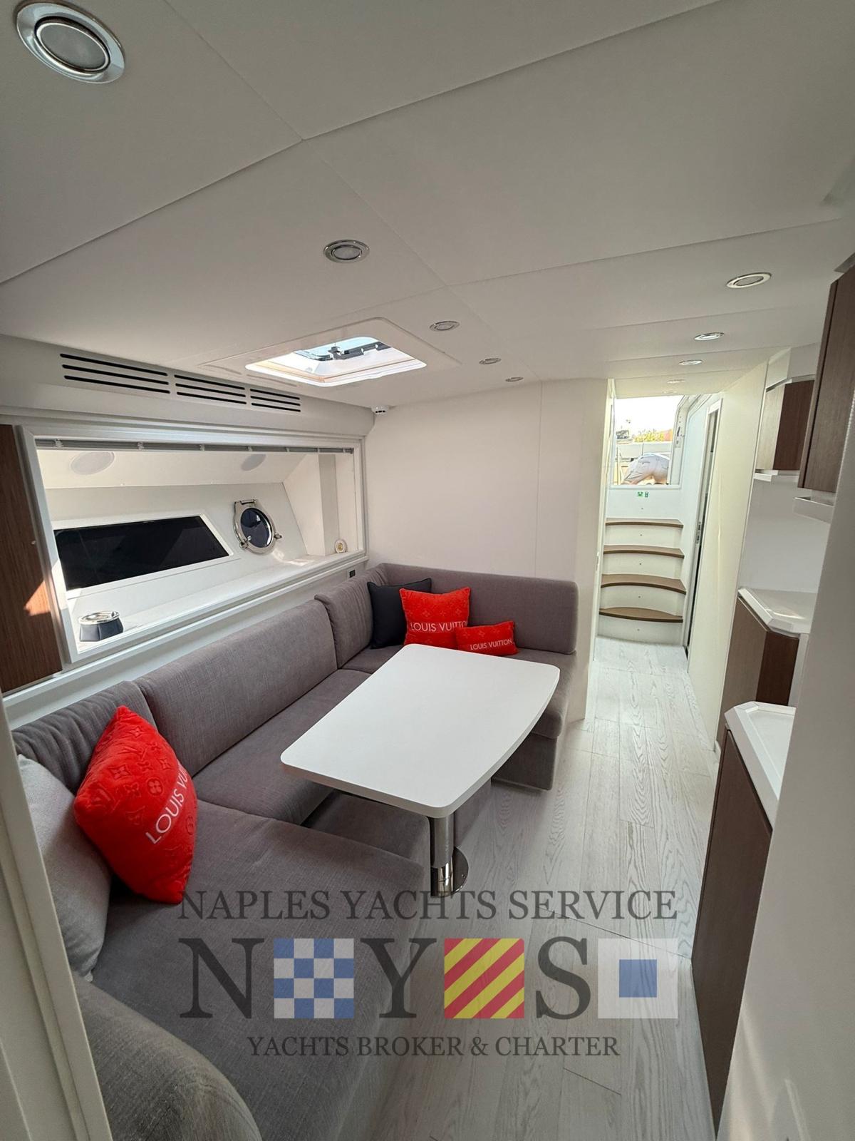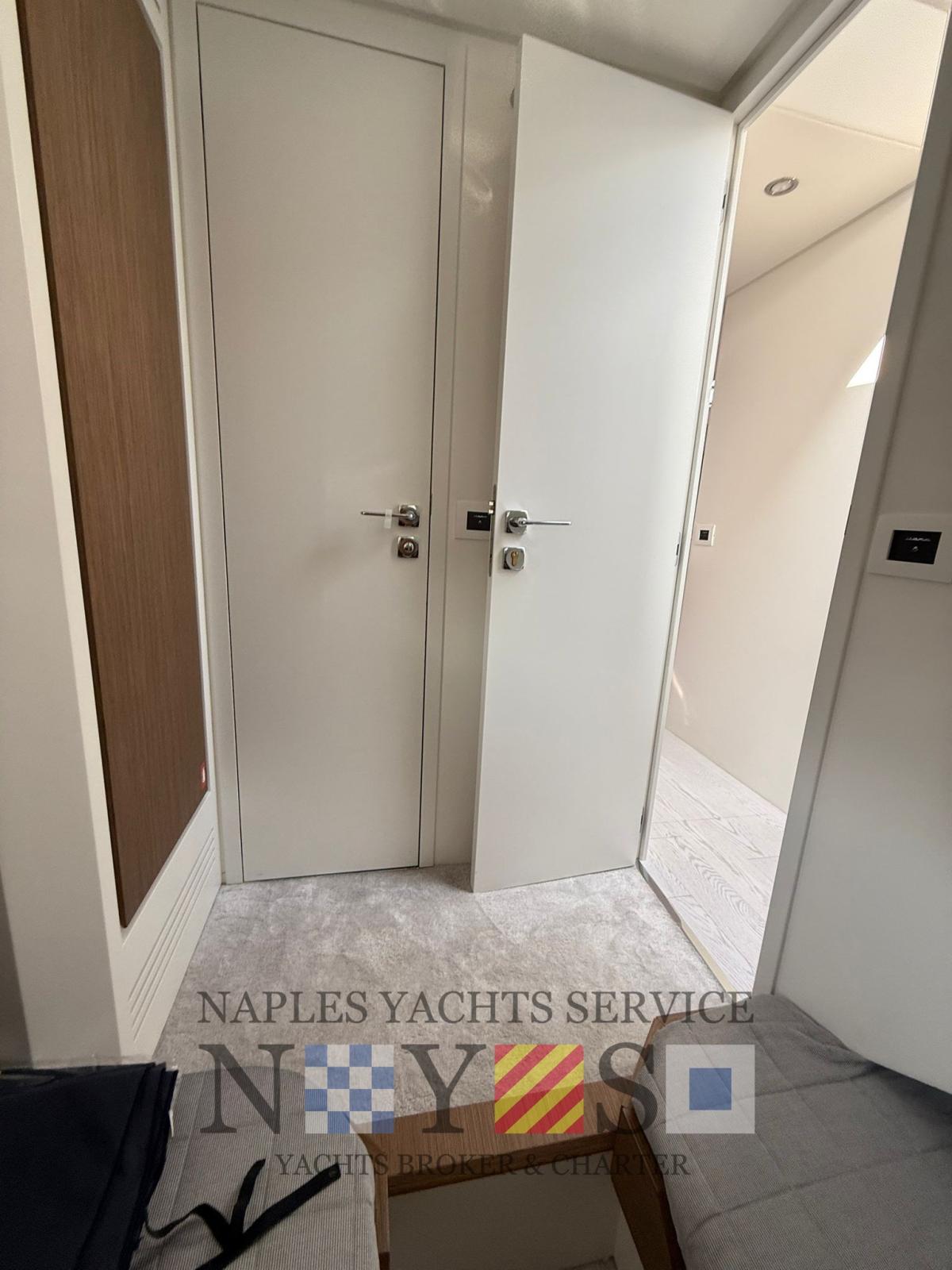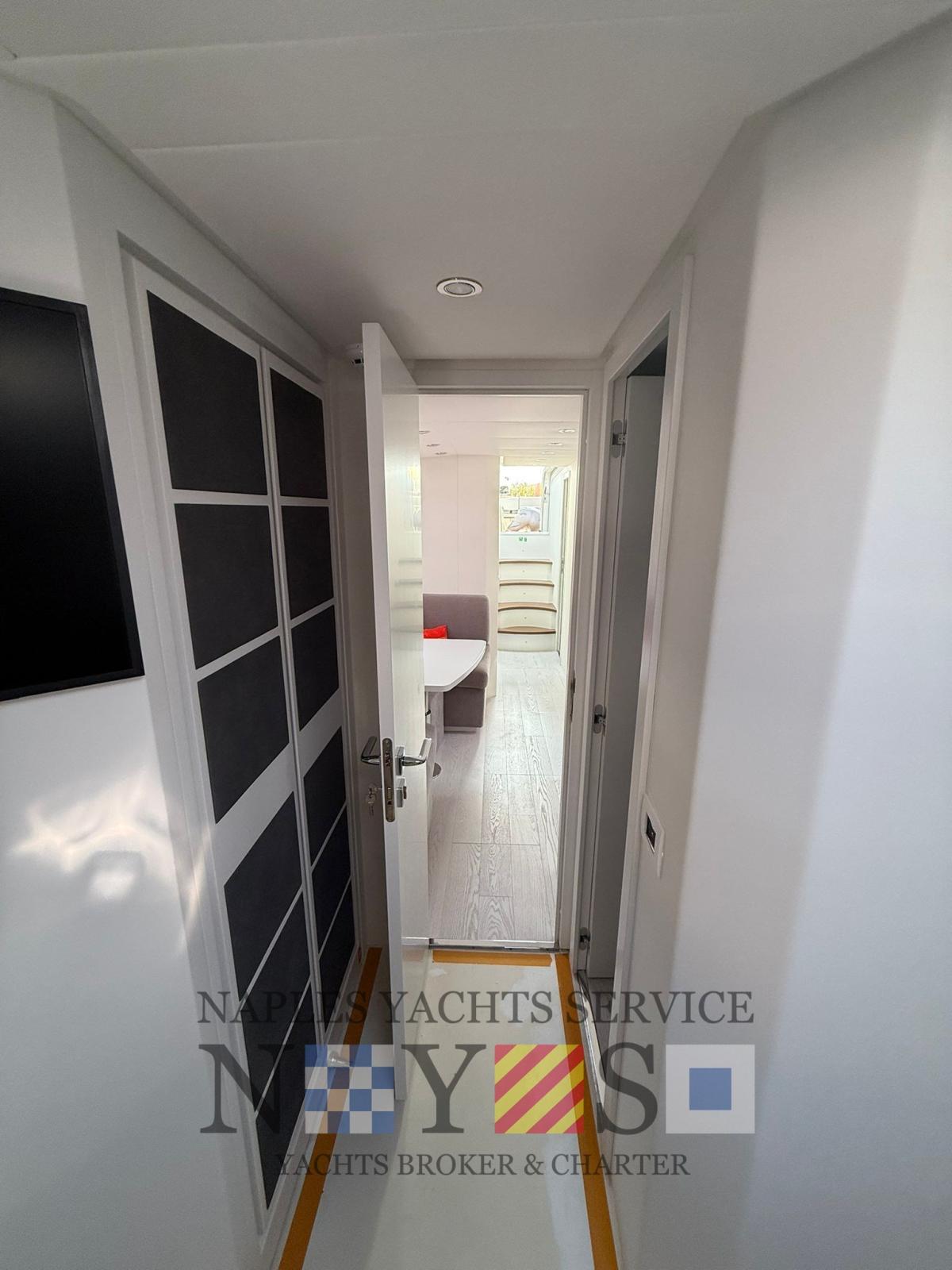 Gli interni, sobri ma raffinati, combinano eleganza e funzionalità. La disposizione è pensata per offrire privacy e comodità a bordo, con ambienti luminosi, arredi essenziali e materiali pregiati. Ogni spazio è progettato per garantire una vita a bordo piacevole, che si tratti di una breve crociera o di un’intera vacanza in mare.