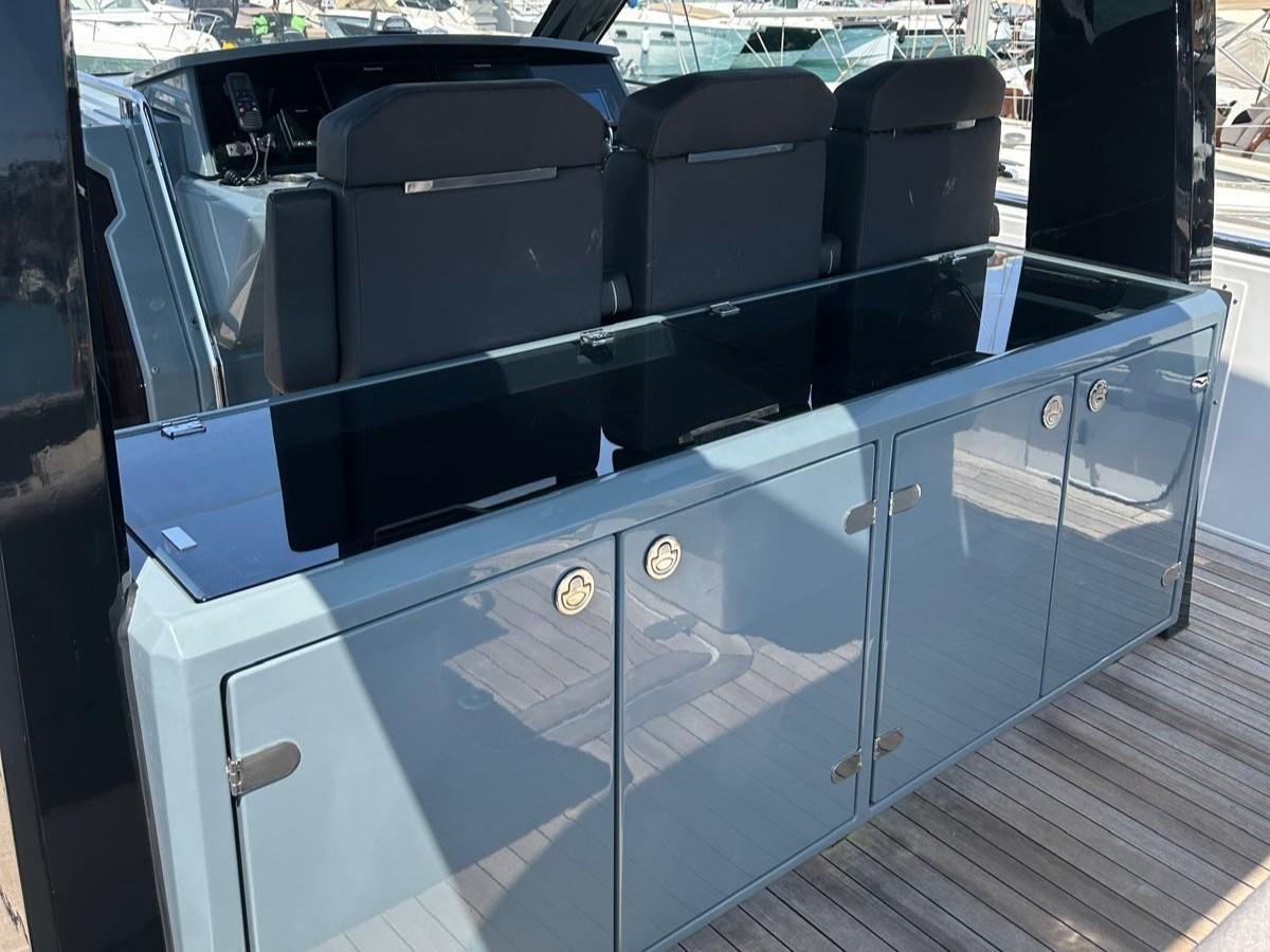 Cucina (Exterior under ttop with working surface, sink and storage), 3 Frigorifero esterno (2 cool boxes drawer type under benches), Frigorifero interno (std in exterior galley).