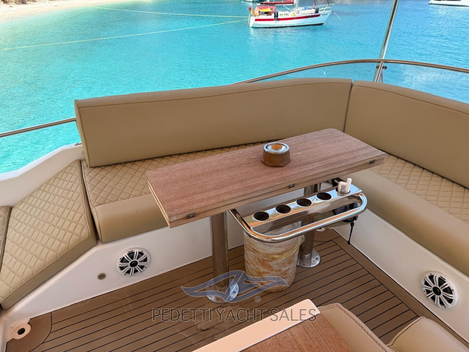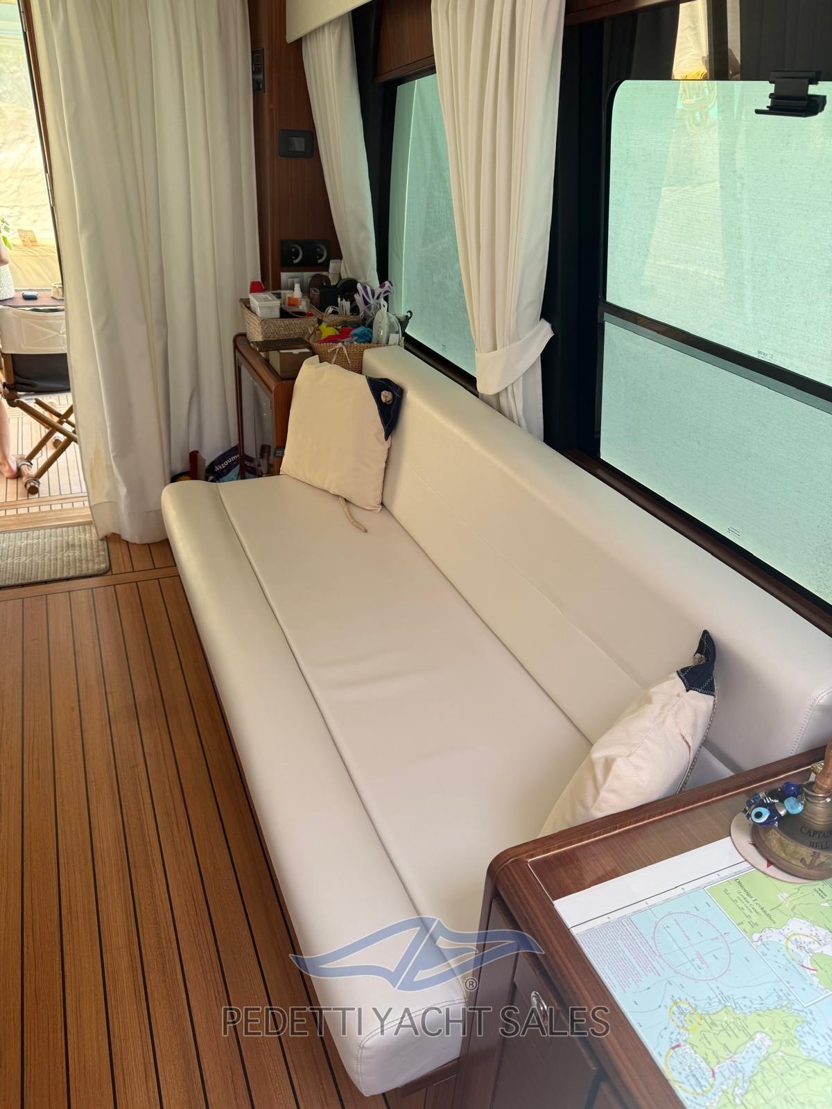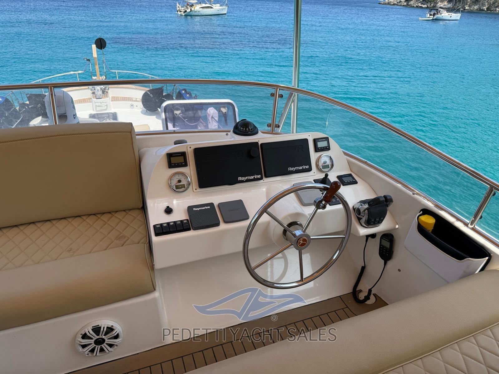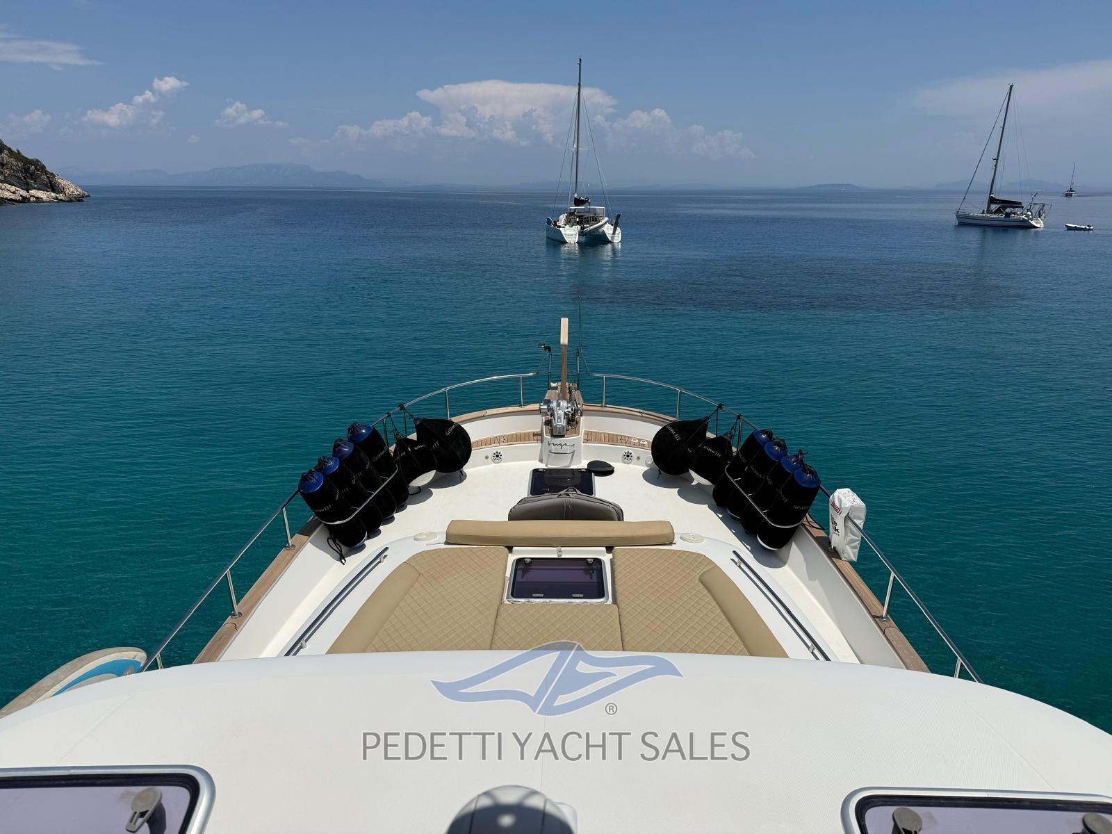 2xVolvo Penta 435 Hp con 1.400 ore di moto, completamente revisionati (aqnche il genratore) nel 2025 con fatture disponibili, stabilizzatori dinamici Humphree elettrici con due pack batterie e 2 caricabatterie dedicati, pannelli solari calpestabili su fly bridge ad alto rendimento, dissalatore 140 lt/h, dotazioni sicurezza, EPIRB, elettronica completa raymarine con radar e strumenti vento con doppio schermo in timoneria e sul flybridge, telecomando pilota automatico, contametri catena ancora, piattaforma di poppa idraulia, passerella idraulica a scomparsa, generatore 10 Kw, elica di prua e di poppa, aria condizionata, TV a scomparsa nel salone, impianto stereo con altoparlanti esterni ed interni con fader control, Yacht controller, cuscineria 10esterna nuova 2023, Tendalino fly bridge custom, tendalino di prua, tenalini pozzetto, telecamere FLIR poppa e prua con augmented reality, teak in pozzetto, porte esterne in teak naturale, mobile grill con lavello e frigorifero sul flybridge, tavolo sul fly bridge, divano a poppa in pozzetto, con gavoni, ancora Ultramarine in acciaio, luci subacquee a poppa, 3 frigoriferi (cucina, salone e fly bridge), congelatore a pozzetto in cucina, lavastoviglie, lavasciuga, cucina a gas tre fuochi con fermapentole, presa acqua porto, uscita acqua dolce a prua, doccia esterna nuova con supporto, tender in fibra di carvbonio con fuoribordo 20hp, trattamento Prospeed assi ed eliche.