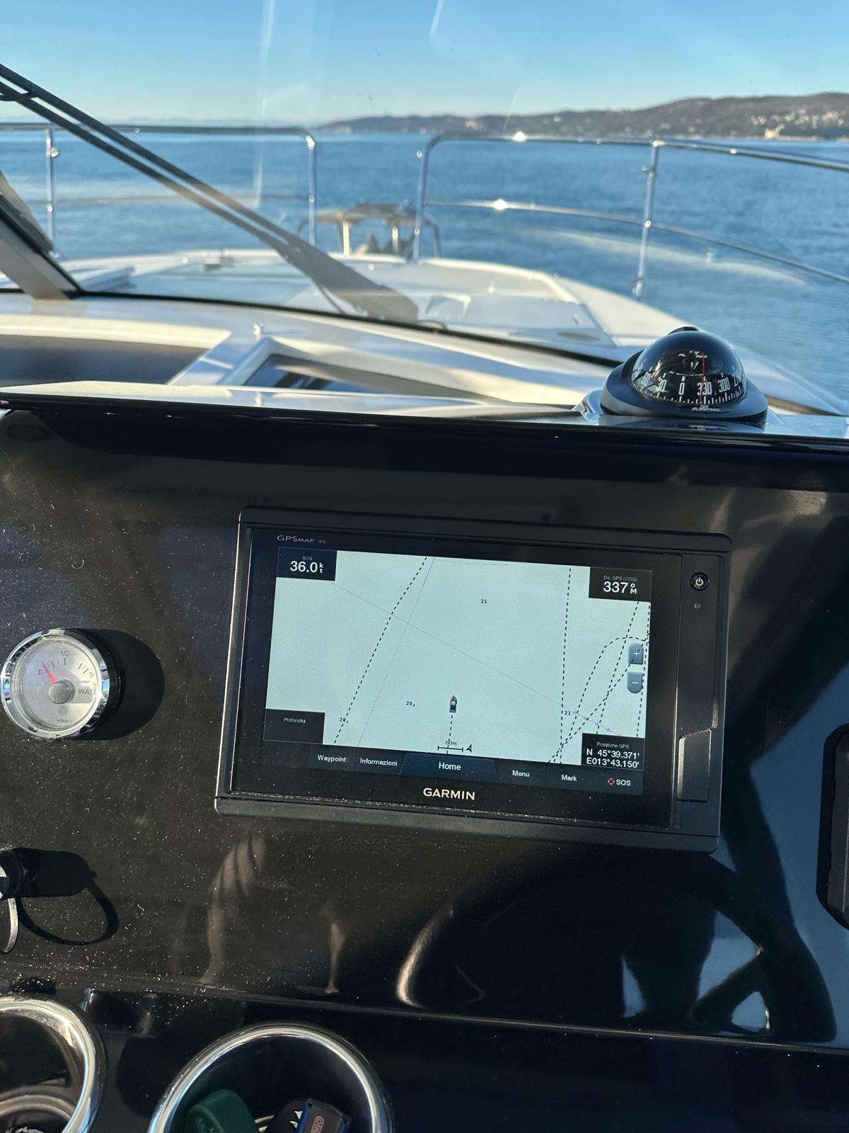 Allarme motore, Allarme sentina, Autoclave, Camminamenti laterali in teak, Doccia esterna, Faro orientabile, Flap elettrici, Indicatori Flaps, Luci di cortesia, Pannelli Solari, Pompa di sentina automatica, Porta laterale, Pozzetto Teak, Presa 220V banchina, Salpa Ancore Elettrico, Scaletta da bagno, Tromba.