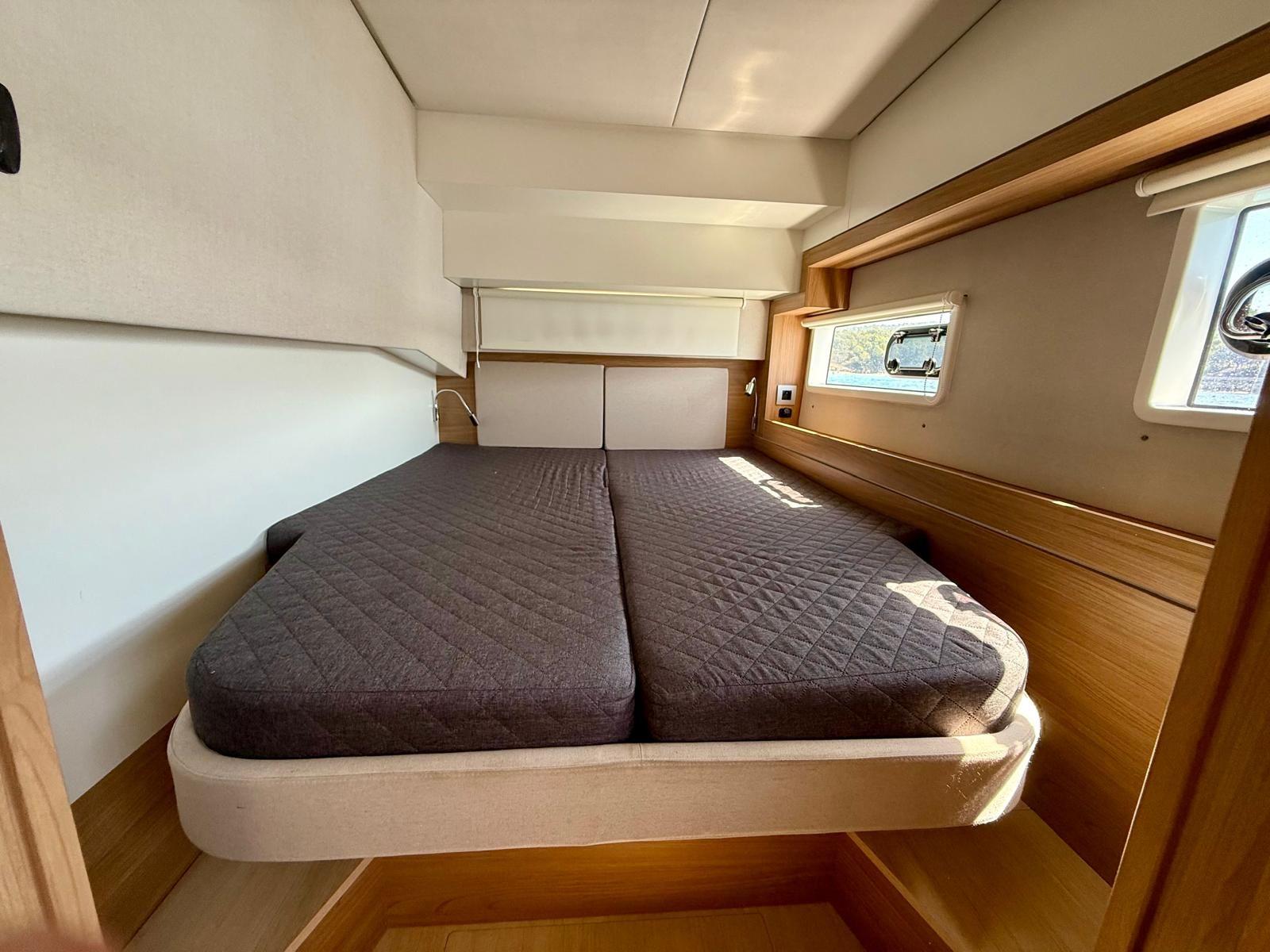 Le sue vele ad alte prestazioni, l’elettronica Raymarine completa e i winch elettrici garantiscono una navigazione fluida e piacevole. Gli ampi spazi esterni invitano al relax: prendisole generosi sul flybridge e nel pozzetto, plancha integrata per momenti conviviali e vista mare mozzafiato per godere appieno di ogni scalo.