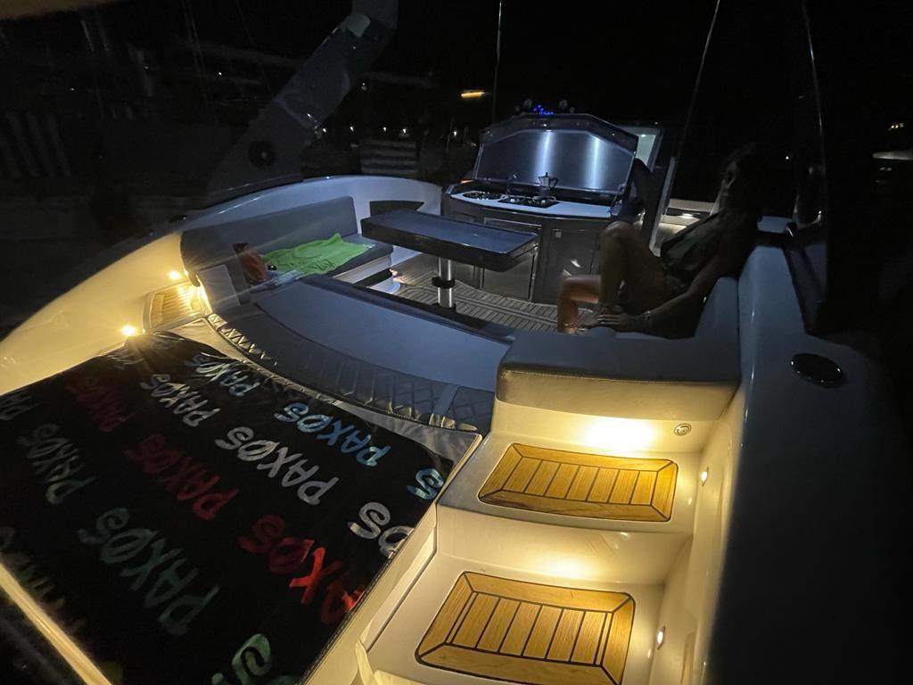 Allarme motore, Apertura Vano Motore Elettrica, 3 Batterie (150ah), Camminamenti laterali in teak, Doccia esterna, Lavandino nel Pozzetto, Luci di cortesia, Piattaforma (teack), Pompa di sentina automatica, Pozzetto Teak, Presa 220V banchina, Rollbar, Salpa Ancore Elettrico (con telecomando), Scaletta da bagno, Tavolo, Tromba.
