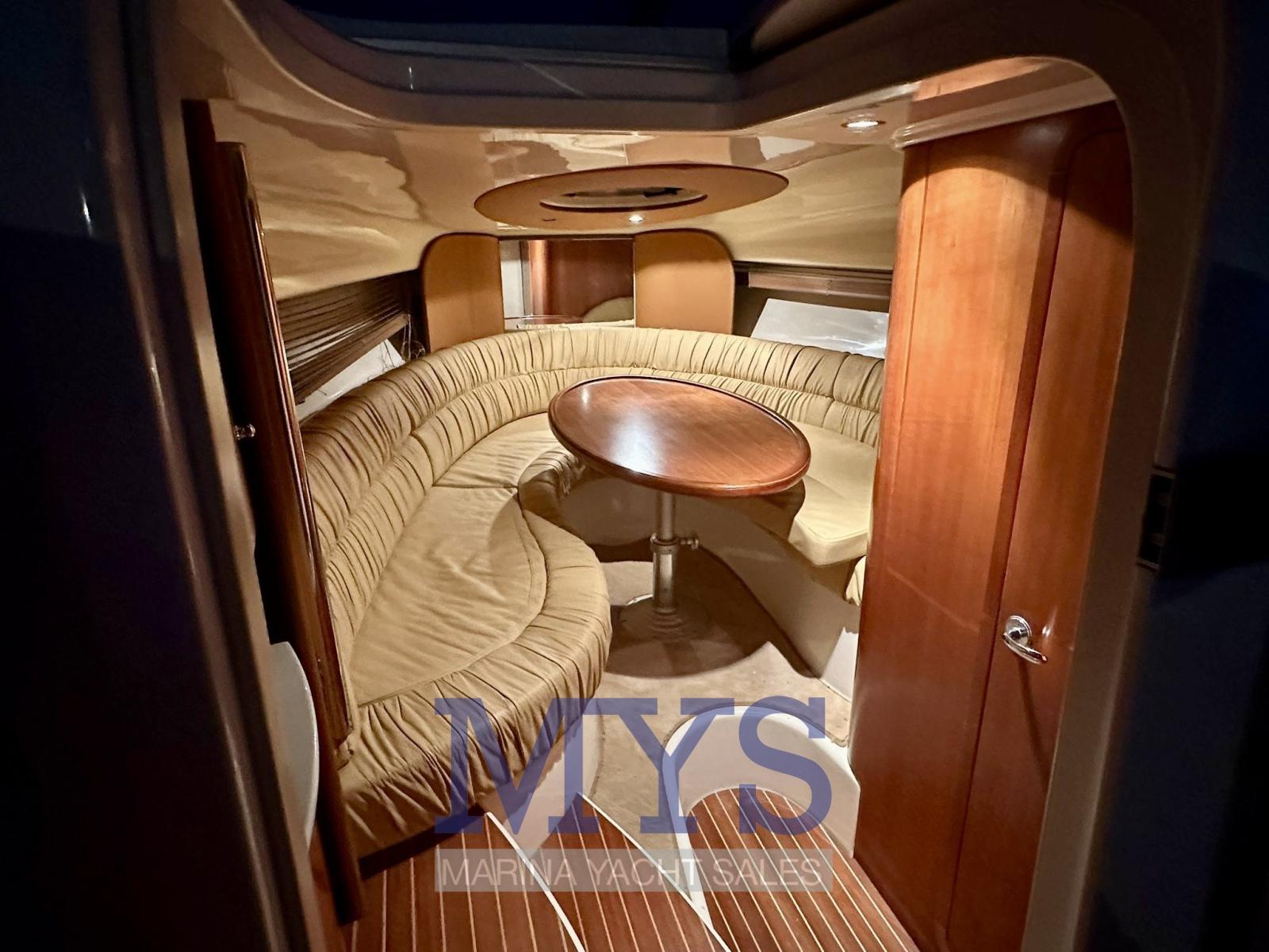 Cabina Armatoriale con letto a V trasformabile in dimette con divano a C e tavolo al centro.