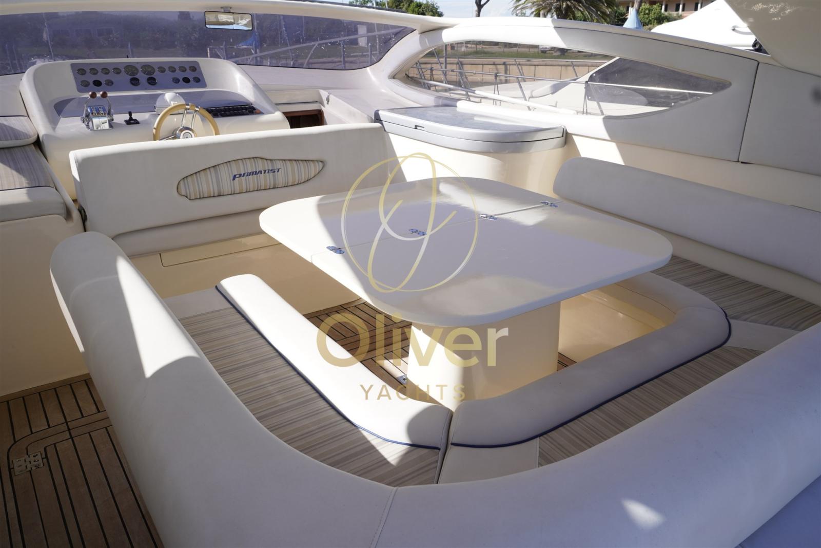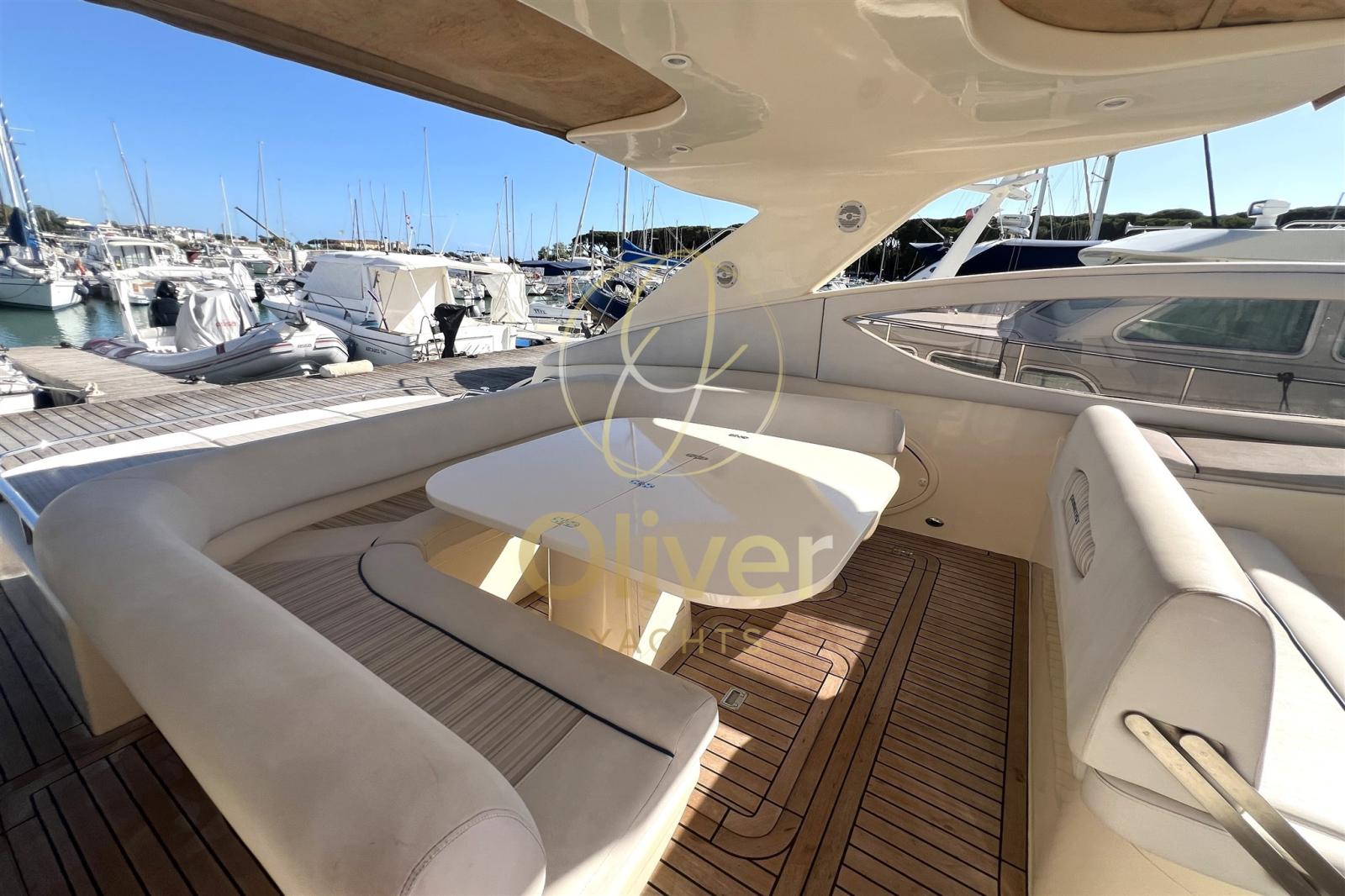 Il ponte è spazioso e ben attrezzato, offrendo diverse aree per il relax e il divertimento. A prua si trova un prendisole con ampi cuscini, ideale per godersi il sole e la brezza marina. Il pozzetto è allestito con un divano a C, un tavolo da pranzo e un mobile bar, creando un ambiente conviviale per pranzare o rilassarsi in compagnia. La postazione di guida è ergonomica e completa, dotata di timoneria, cruscotto con strumentazione completa e sedile regolabile.