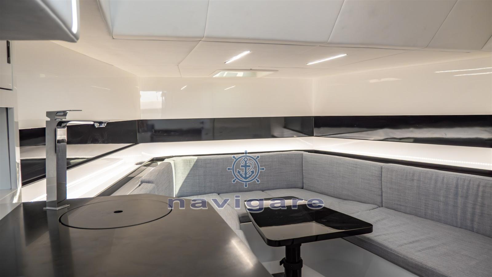 CABINA DI PRUA • Cuccetta doppia con materasso • Illuminazione a soffitto • Armadietti appendiabiti • Luci di lettura con USB* • Illuminazione d'atmosfera • Pompe di sentina automatiche • Lavello con acqua calda e fredda* • Frigorifero* • Piano di lavoro in Corian • Pensili • Prese 230 V e USB • Cassetti portaoggetti • Illuminazione ambientale