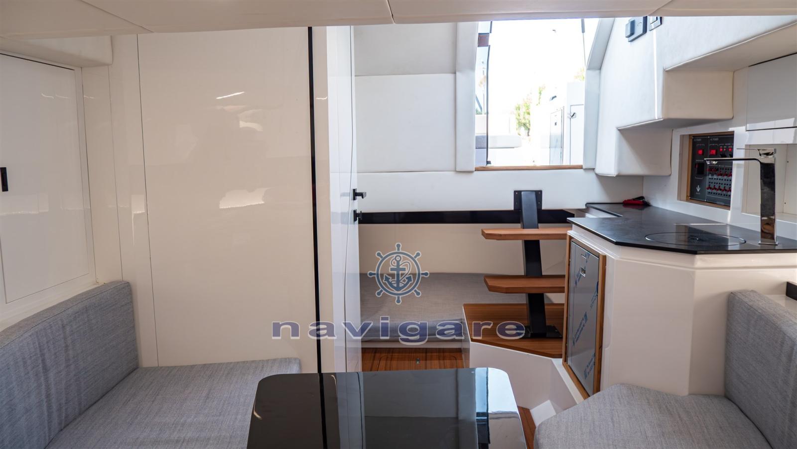 VANO TECNICO • Isolamento termo-acustico • Cofano motore ad azionamento elettrico • Impianto antincendio in sala macchine • Pompe di sentina automatiche • Capacità serbatoio carburante: 640 litri • Valvole carburante con chiusure di sicurezza al timone. - Capacità del serbatoio dell'acqua: 200 litri - Pompa di lavaggio del ponte dell'acqua dolce* - Pompa dell'acqua dolce* - Serbatoio dell'acqua sporca da 80 litri con pompa - Punto di scarico del serbatoio di scarico sul lato del ponte. • 2 batterie motore AGM • 2 batterie servizi AGM • Generatore da 4 kW con batteria* • Batteria AGM aggiuntiva* • Impianto di climatizzazione: 12.000 BTU*