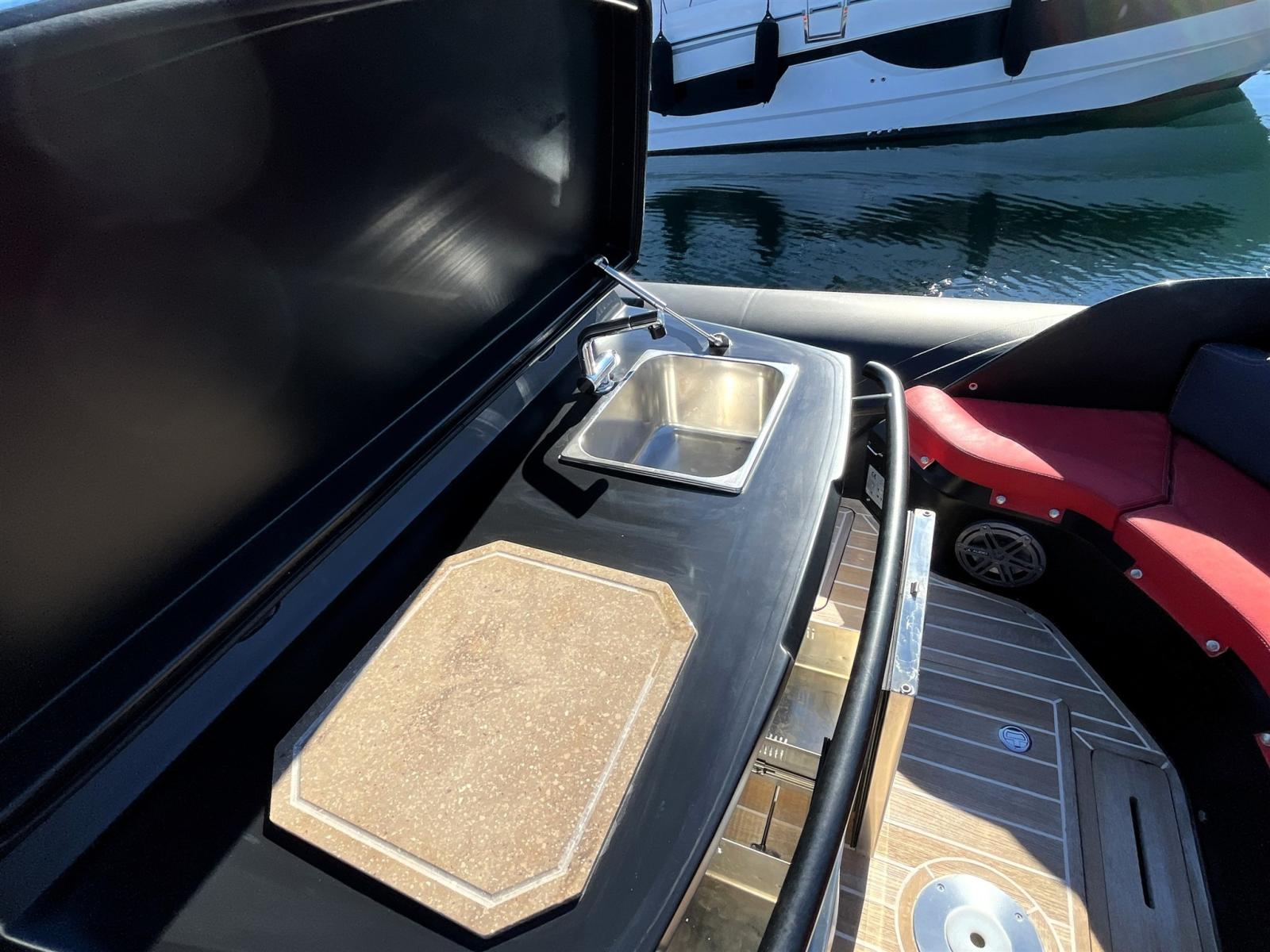 POZZETTO IN TEAK, TUBOLARI NERO CARBON, ELICA DI PRUA - BIMINI A SCOMPARSA SOPRA PRENDISOLE - SALPA ANCORA INOX CON TELECAMERA - GPS ECO 12” RAYMARINE TOUCH - ELICA DI PRUA - VHF RAYMARINE - DOPPIO FRIGO - STEREO FUSION - SCALETTA BAGNO A SCOMPARSA - PRESA 220 V CON CARICA BATTERIE - POZZETTO E PIATTAFORMA IN TEAK - CUSCINERIA COMPLETA - POZZETTO CON LAVELLO, DOPPIO FRIGO, LUCI SUB, ASTA PER SCI NAUTICO, DOTAZIONI DI SICUREZZA