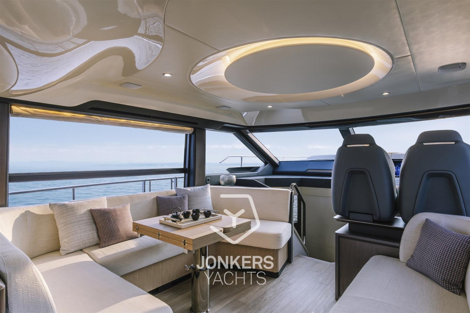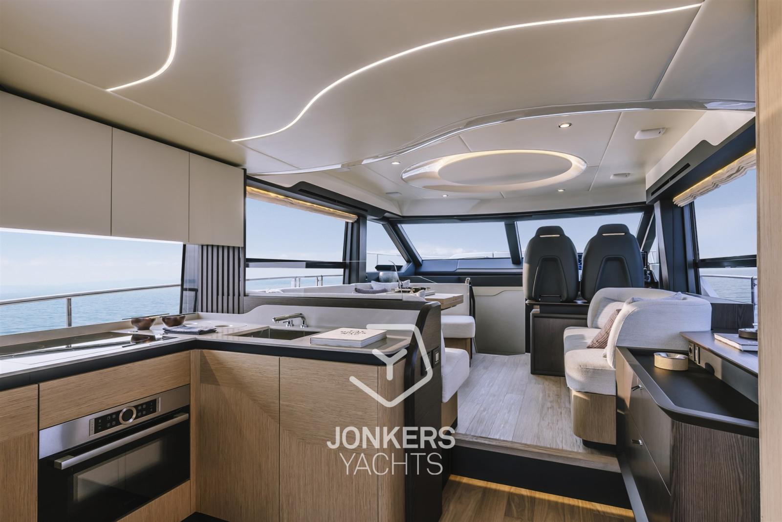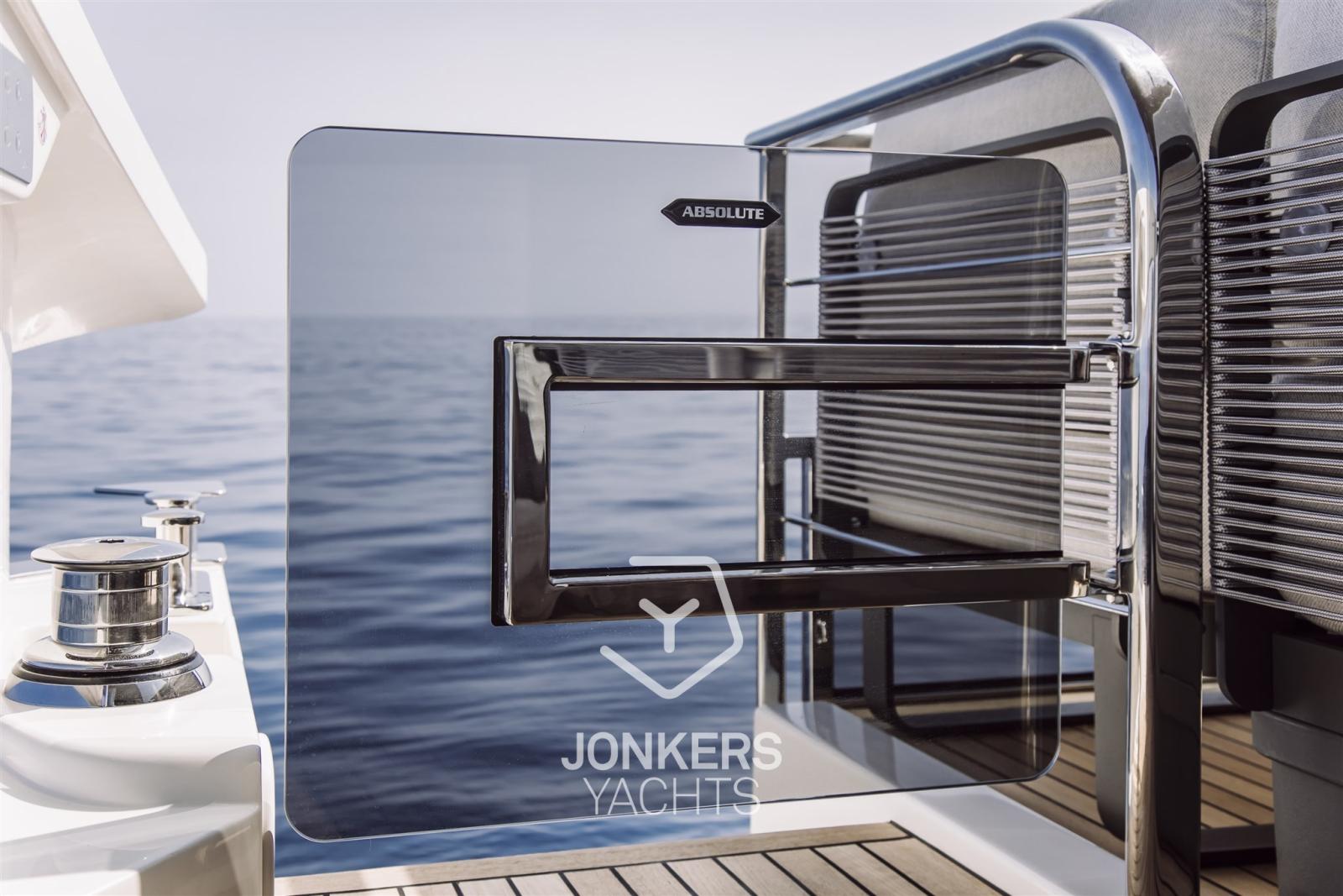 L'uso di ampie vetrate, un marchio di fabbrica familiare di Absolute, è particolarmente visibile nel salone, da cui si gode di una fantastica vista a 360 gradi. Oltre all'aria condizionata, la ventilazione naturale può essere fornita dalle finestre scorrevoli verticalmente comandate elettricamente. La cucina è completamente attrezzata e, cosa insolita per barche di queste dimensioni, c'è anche una spaziosa dispensa.