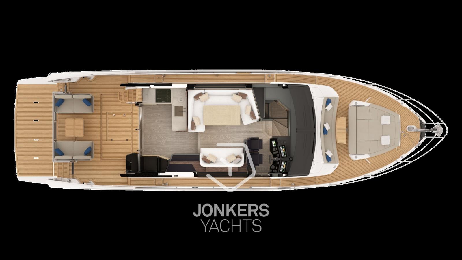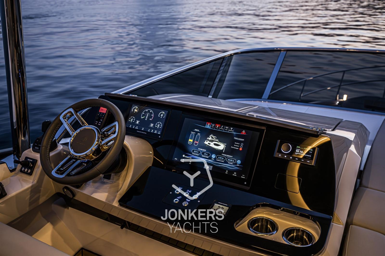 La postazione di guida principale, a diretto contatto con il salone, è in una posizione che garantisce una visibilità ottimale ed è dotata di infotronica avanzata e di un monitoraggio completo su schermo di tutti i sistemi di bordo. Una porta è opportunamente posizionata per un rapido transito dalla plancia di comando principale al camminamento laterale, facilitando le manovre in porto.