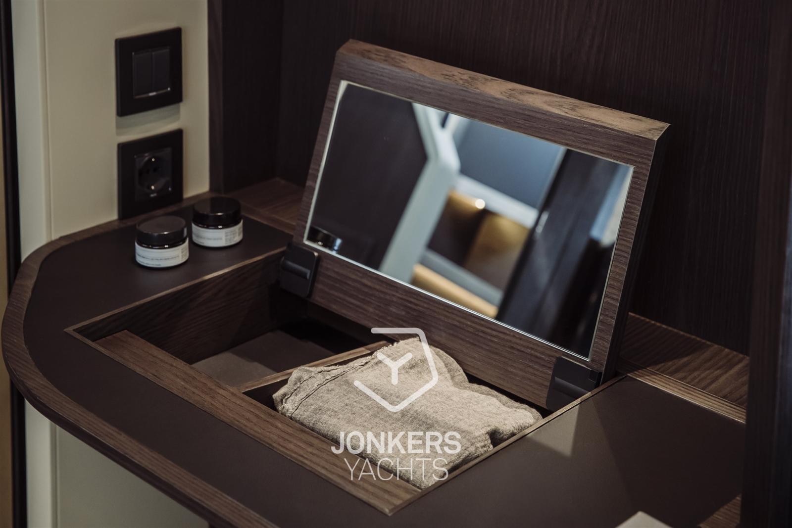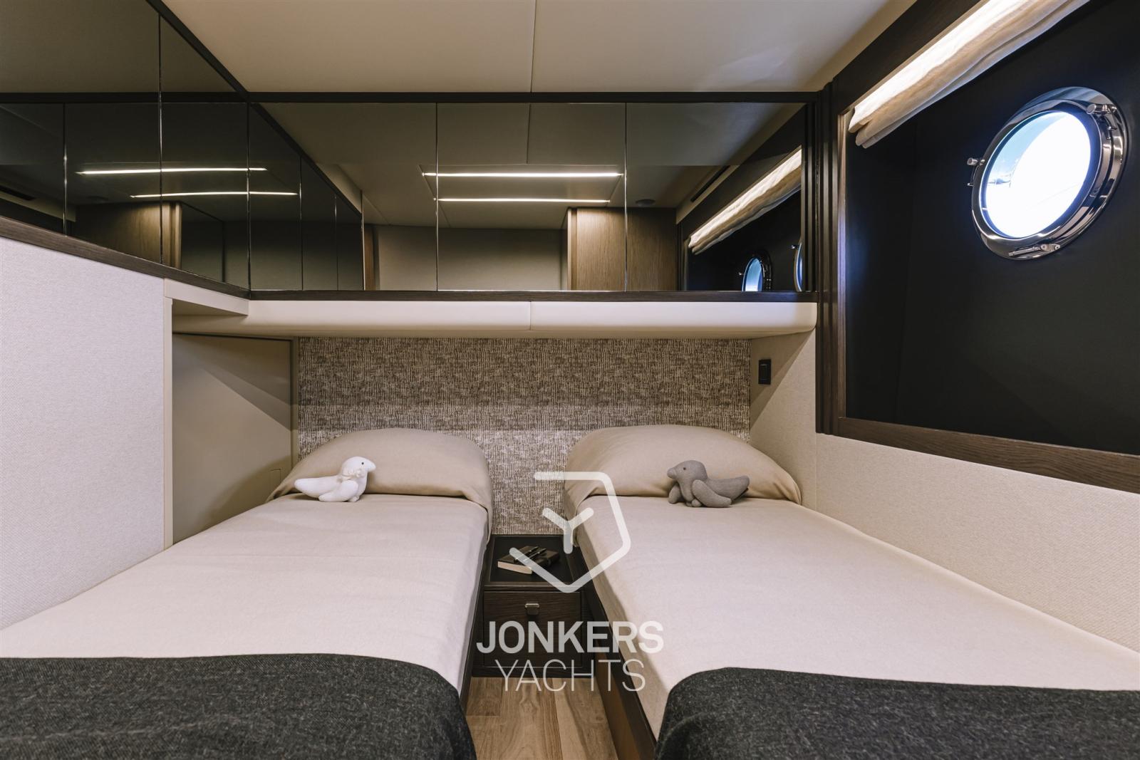 La cabina ospiti VIP a centro barca può essere considerata a tutti gli effetti un secondo armatore, in termini di spazio, altezza libera, bagno privato e finiture. La terza cabina ospiti è dotata di un impianto elettrico, montato di serie, per una perfetta trasformazione da cuccette doppie a doppie. Inoltre, c'è una cabina equipaggio versatile, con pratico accesso dalla piattaforma di poppa.