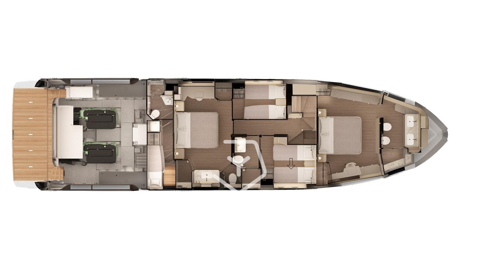 Le quattro cabine, tra cui la armatoriale a prua con letto king-size e la cabina VIP di poppa, garantiscono un comfort senza pari, con spazi pensati per il massimo relax. Ogni cabina è dotata di arredi eleganti, bagni en-suite e soluzioni smart come il letto scorrevole elettricamente nella cabina ospiti. Inoltre, la cabina dell'equipaggio, con accesso separato e bagno privato, garantisce una gestione fluida a bordo, rendendo ogni viaggio un'esperienza lussuosa e pratica.