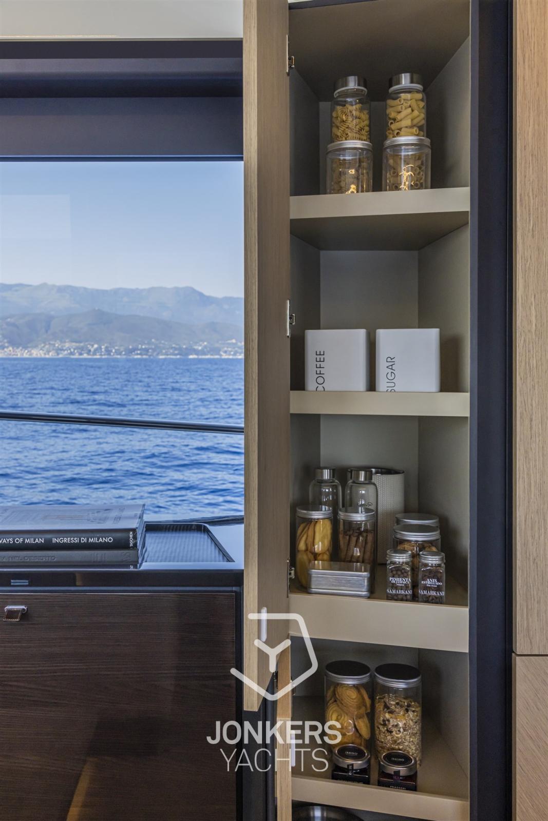 Numerose aree di stivaggio rendono la vita a bordo più facile e confortevole, mantenendo l'ordine nella zona notte e nella zona giorno. C'è anche una cucina completamente attrezzata e dal design moderno e un'area per una lavasciuga nel corridoio del ponte inferiore per assicurarsi che non manchi mai di essere a casa.