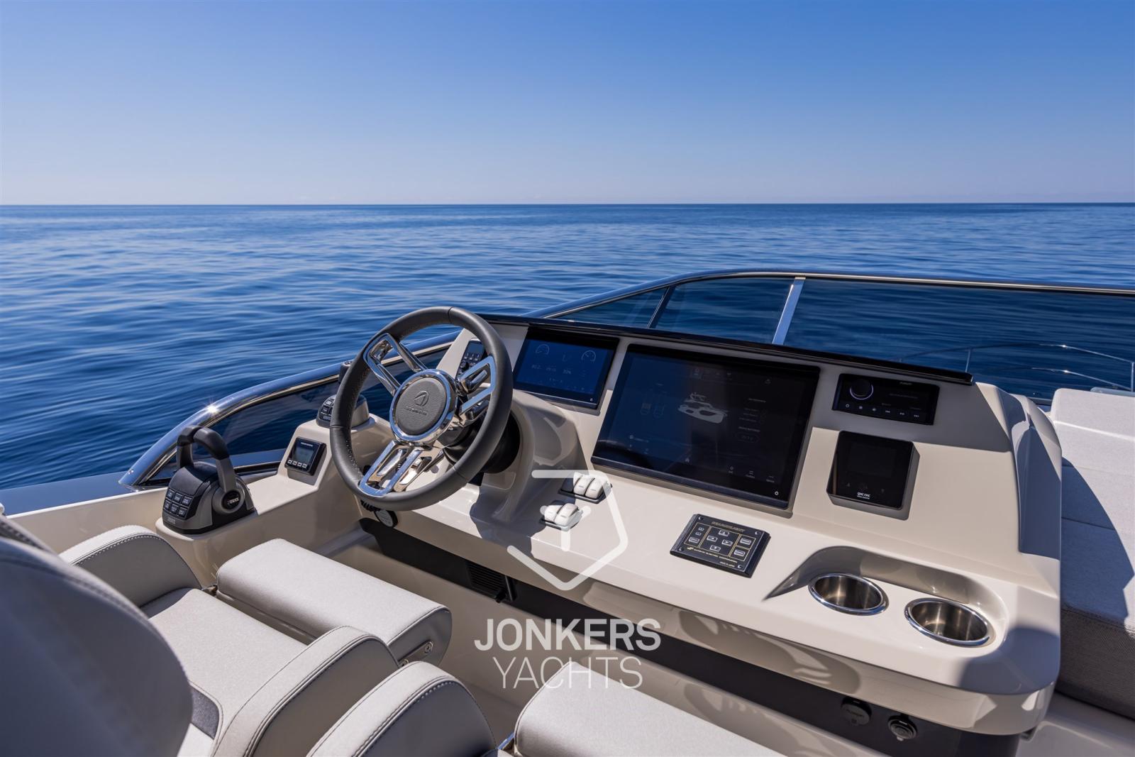Grazie alla porta laterale accanto al pannello della consolle e a una terza postazione di guida nel pozzetto, il governo della barca è comodo, efficiente e sicuro, con un'ergonomia superiore della postazione di guida. Gli elevati standard dei cruscotti Absolute sono noti per garantire una visibilità senza pari, attrezzature complete e facilmente accessibili, nonché comodi posti a sedere sia per la navigazione d'altura che per le manovre in porto.